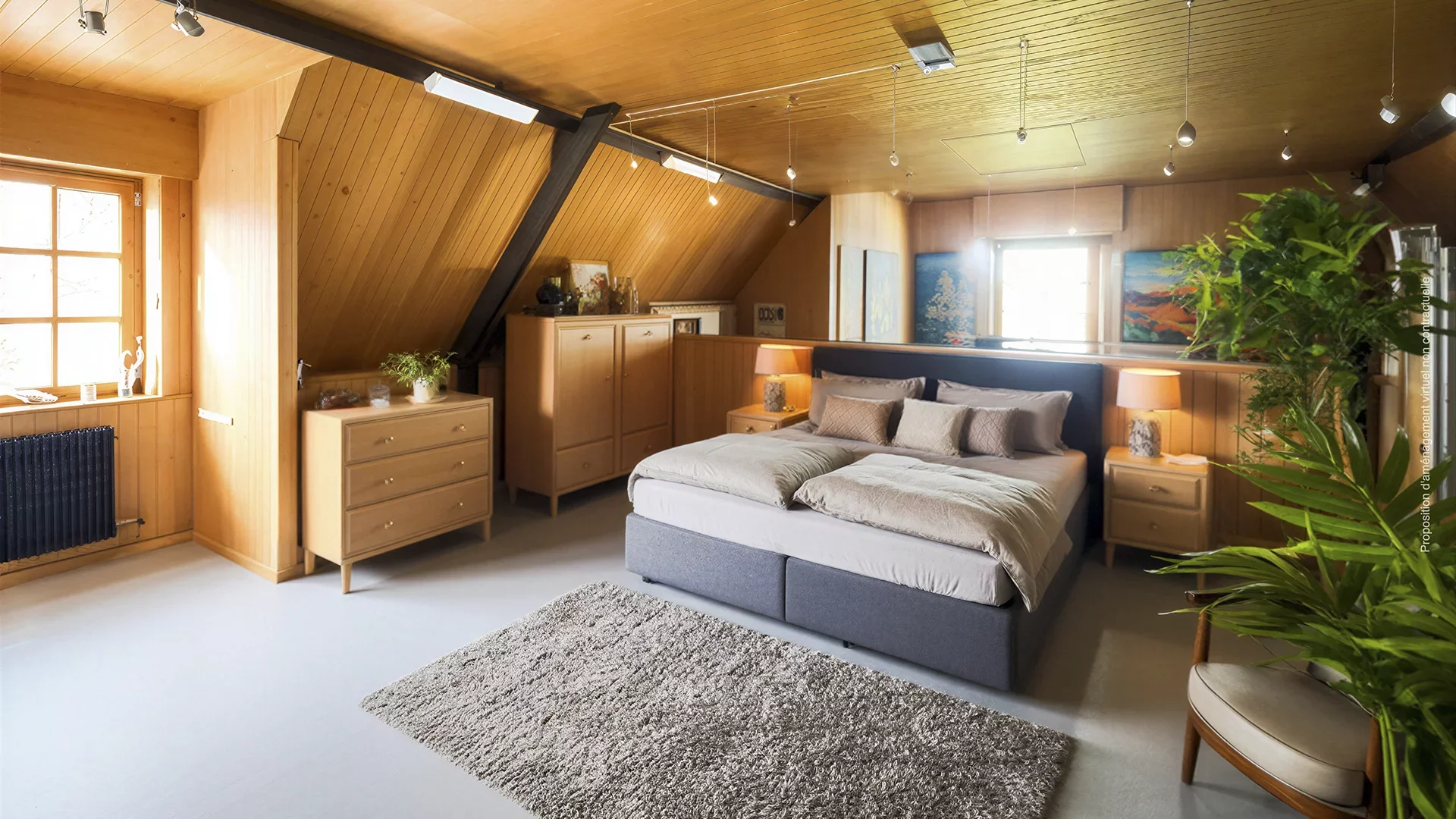 Upstairs, a bedroom with en-suite shower room, a large mezzanine office above the living room, a second living room or vast bedroom and a huge dressing room offer impressive volumes for complementary bedrooms.