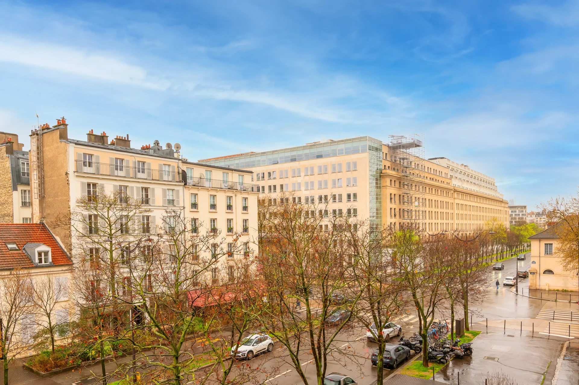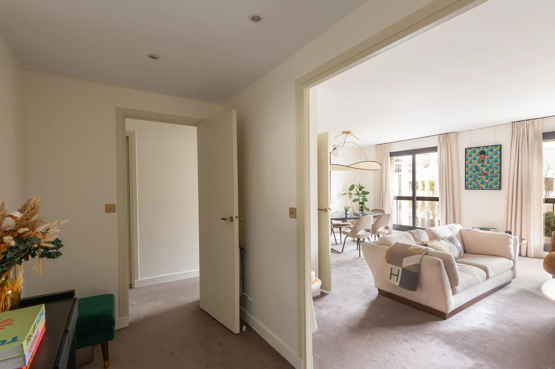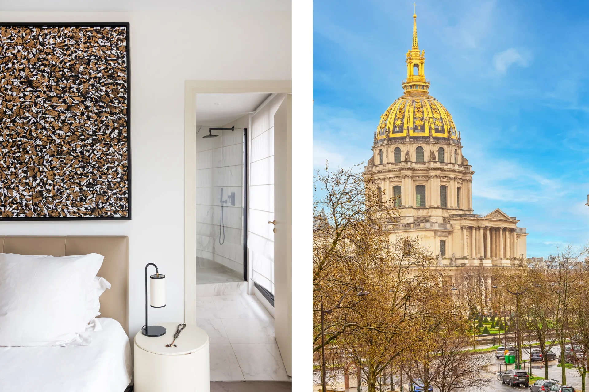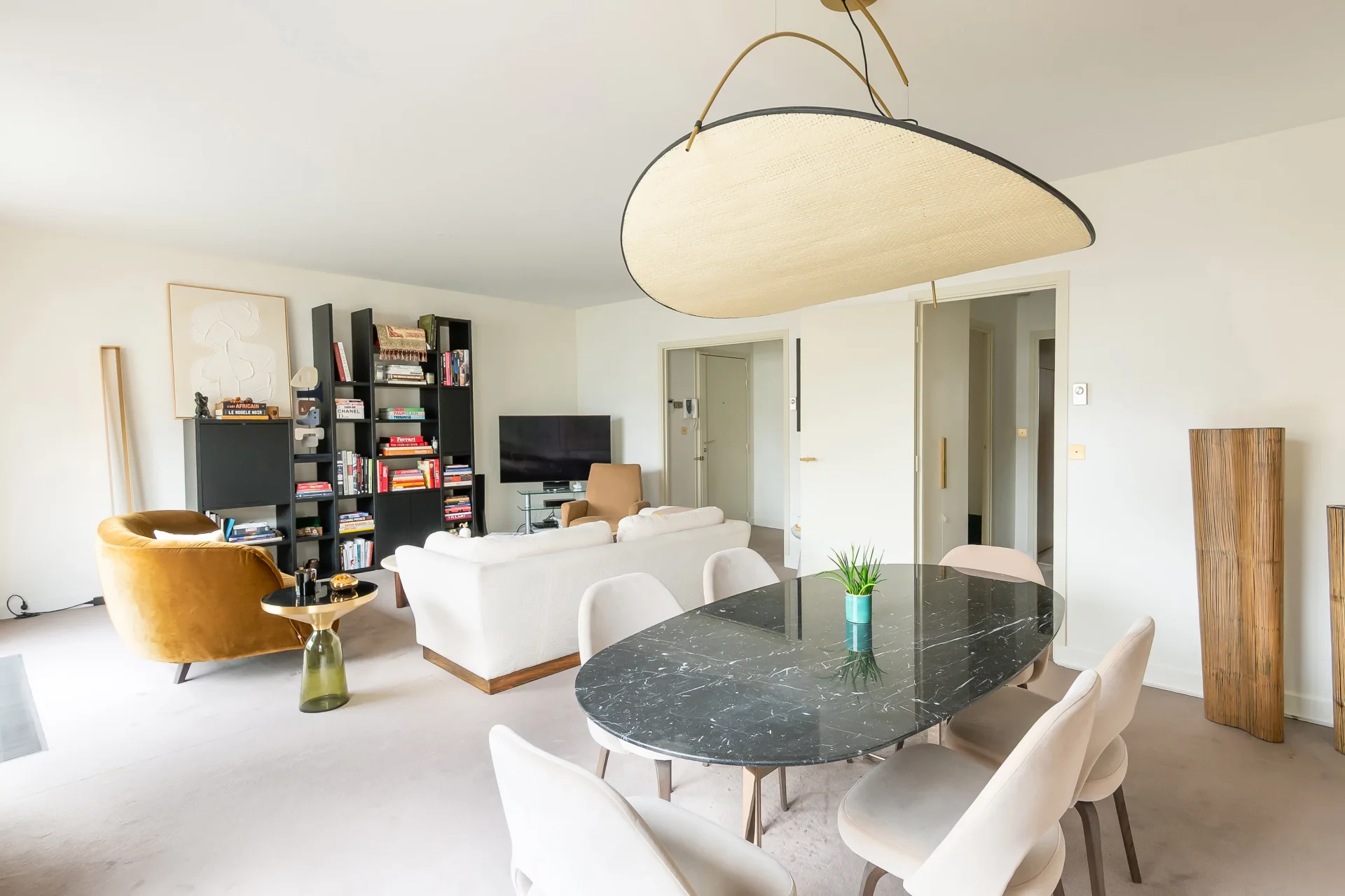 It opens onto an entrance hall leading to a vast 38sqm living room, bathed in light thanks to its southeast exposure and large bay windows. This reception area extends onto a pleasant 3sqm balcony offering an unobstructed, privileged view of the Invalides dome.