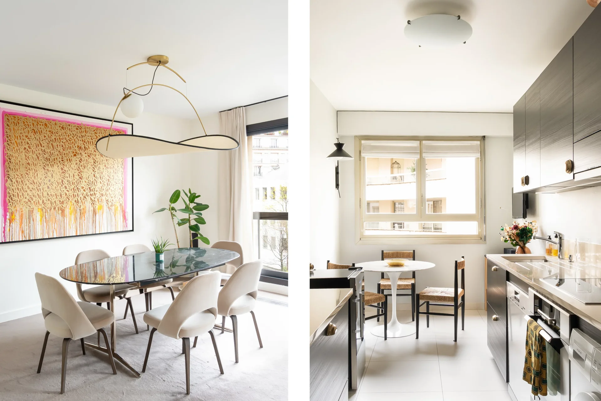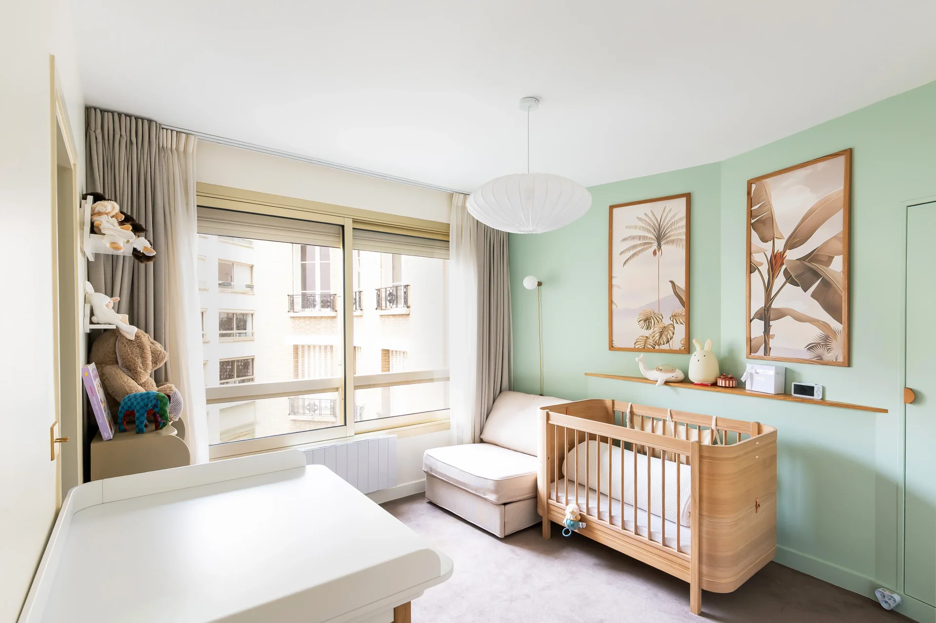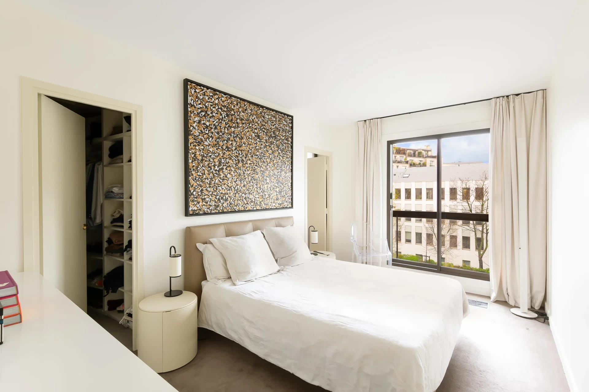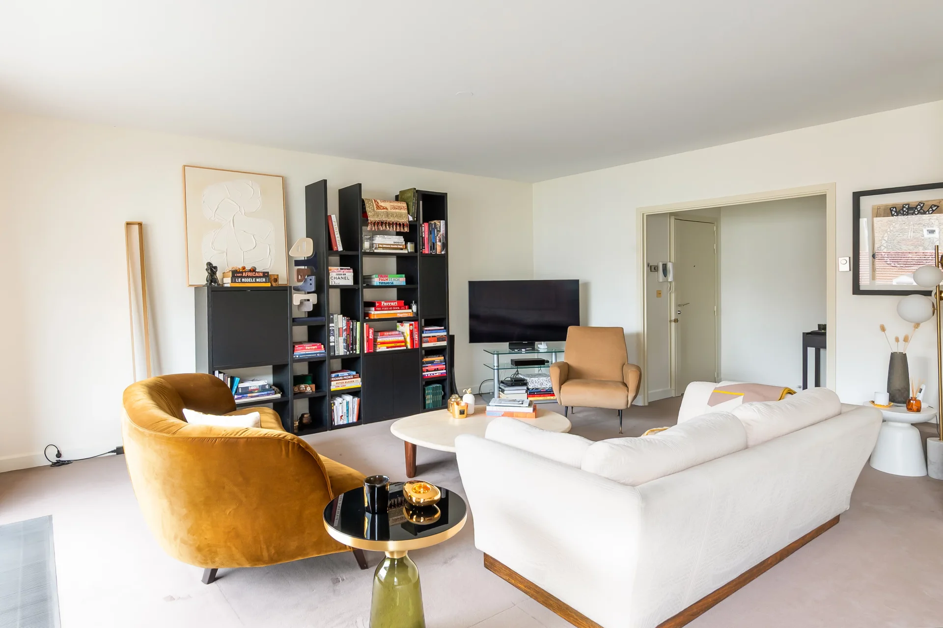 It opens onto an entrance hall leading to a vast 38sqm living room, bathed in light thanks to its southeast exposure and large bay windows. This reception area extends onto a pleasant 3sqm balcony offering an unobstructed, privileged view of the Invalides dome.
