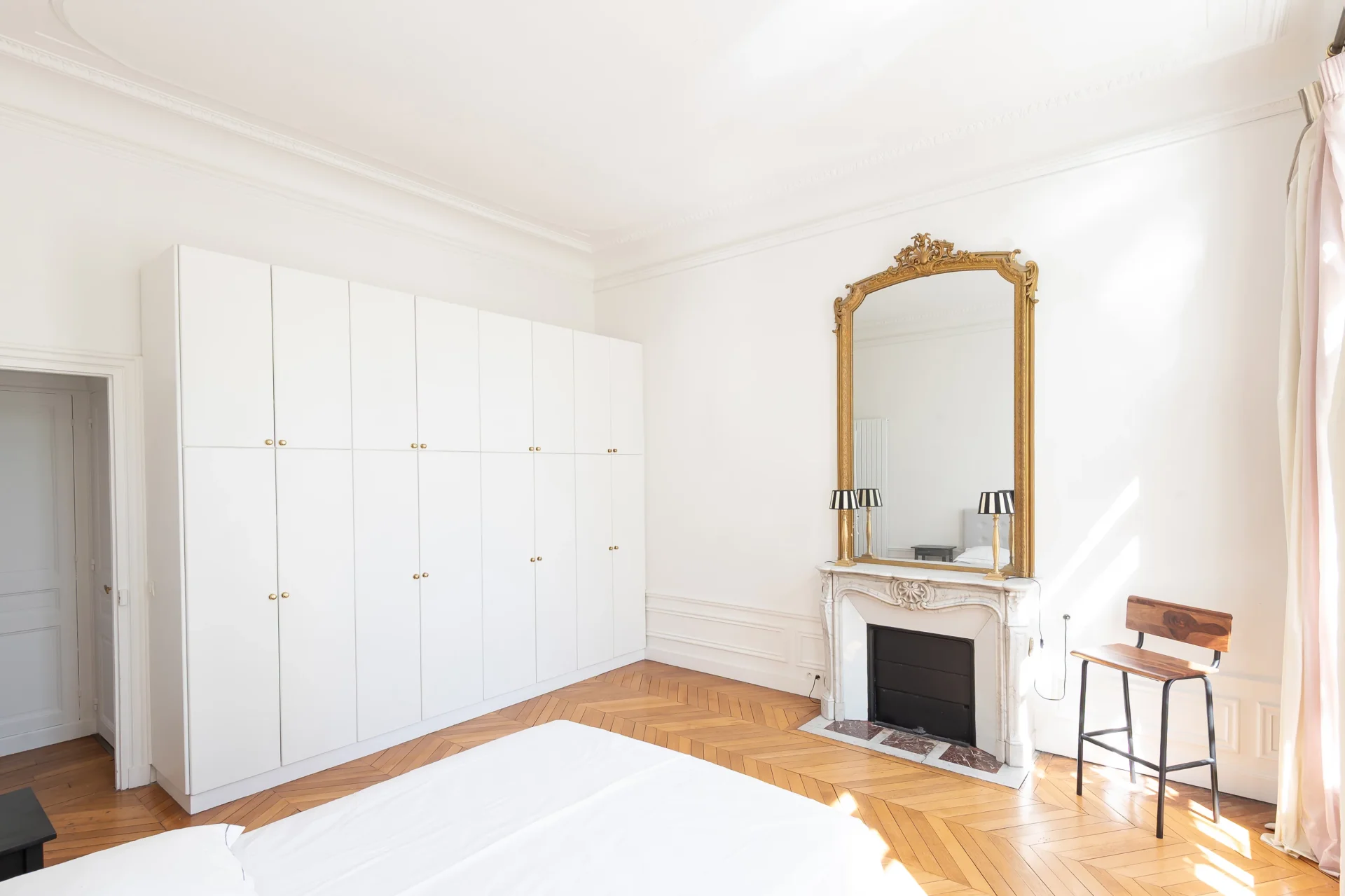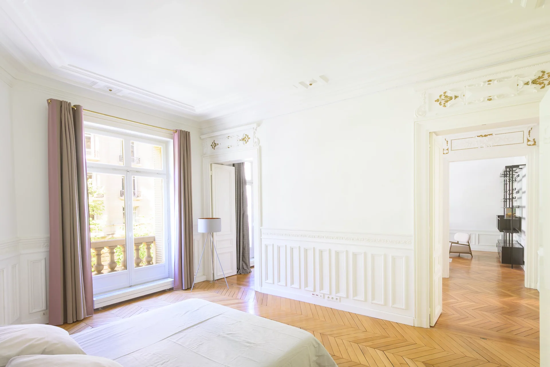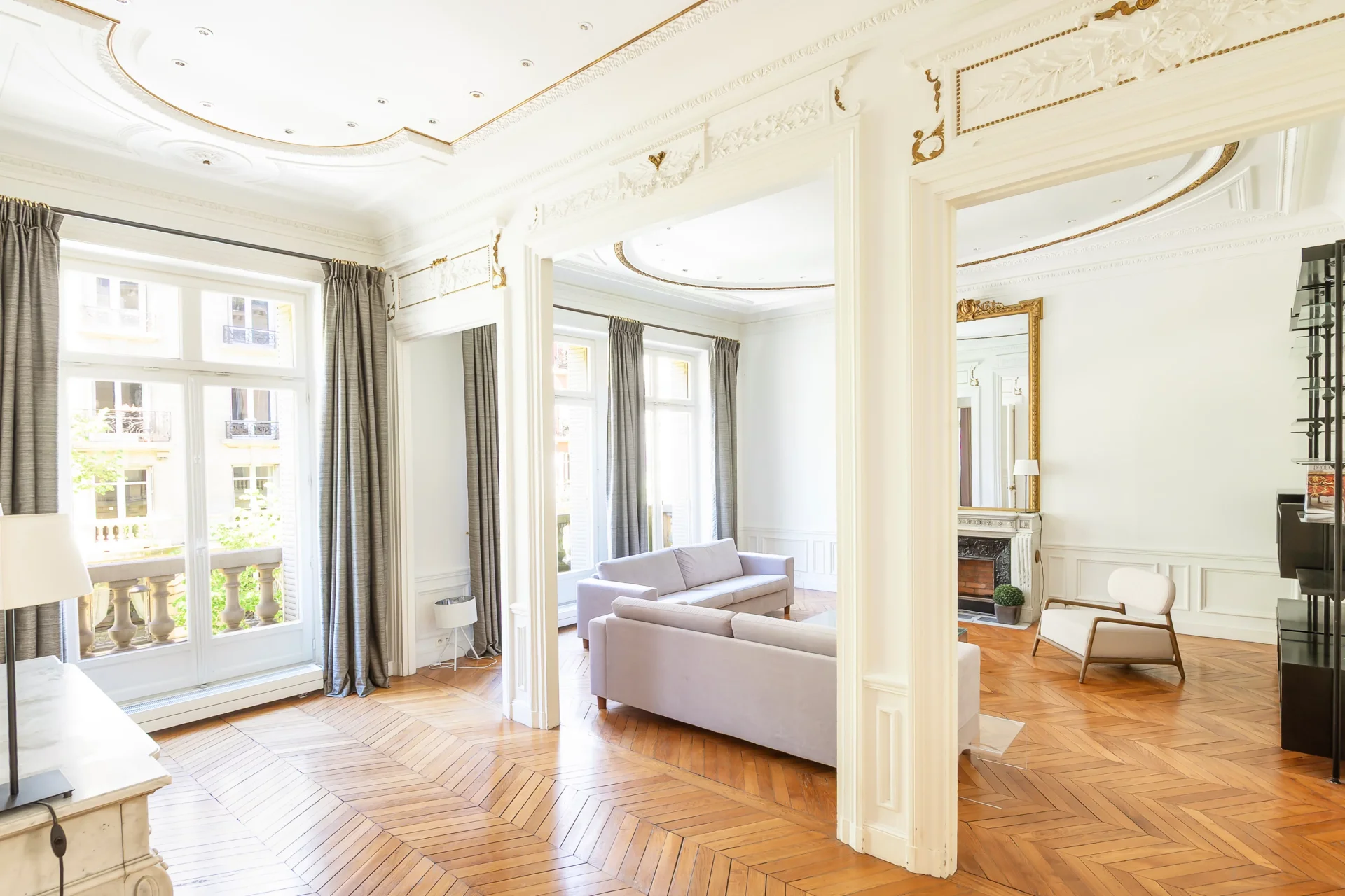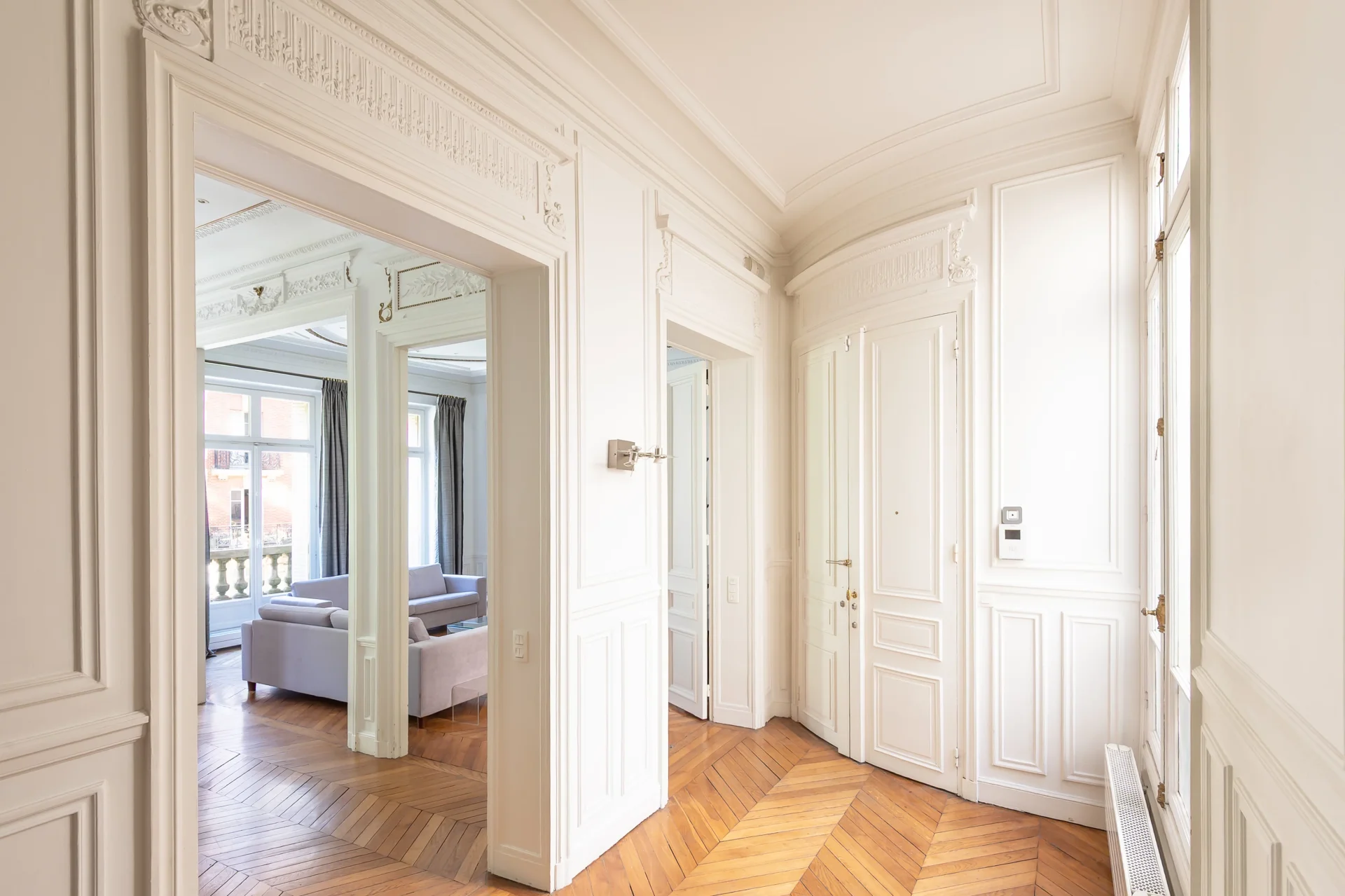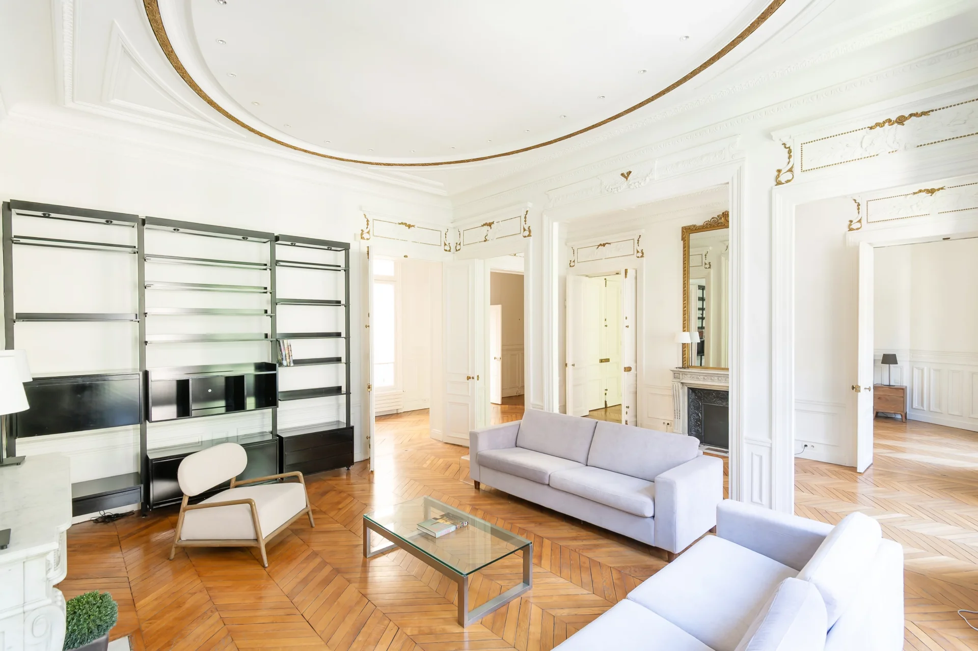 This apartment offers all the charm of old Paris with its beautiful volumes, ceiling height of 3.73 meters, Hungarian point parquet flooring, five marble fireplaces from the period, and elegant moldings.