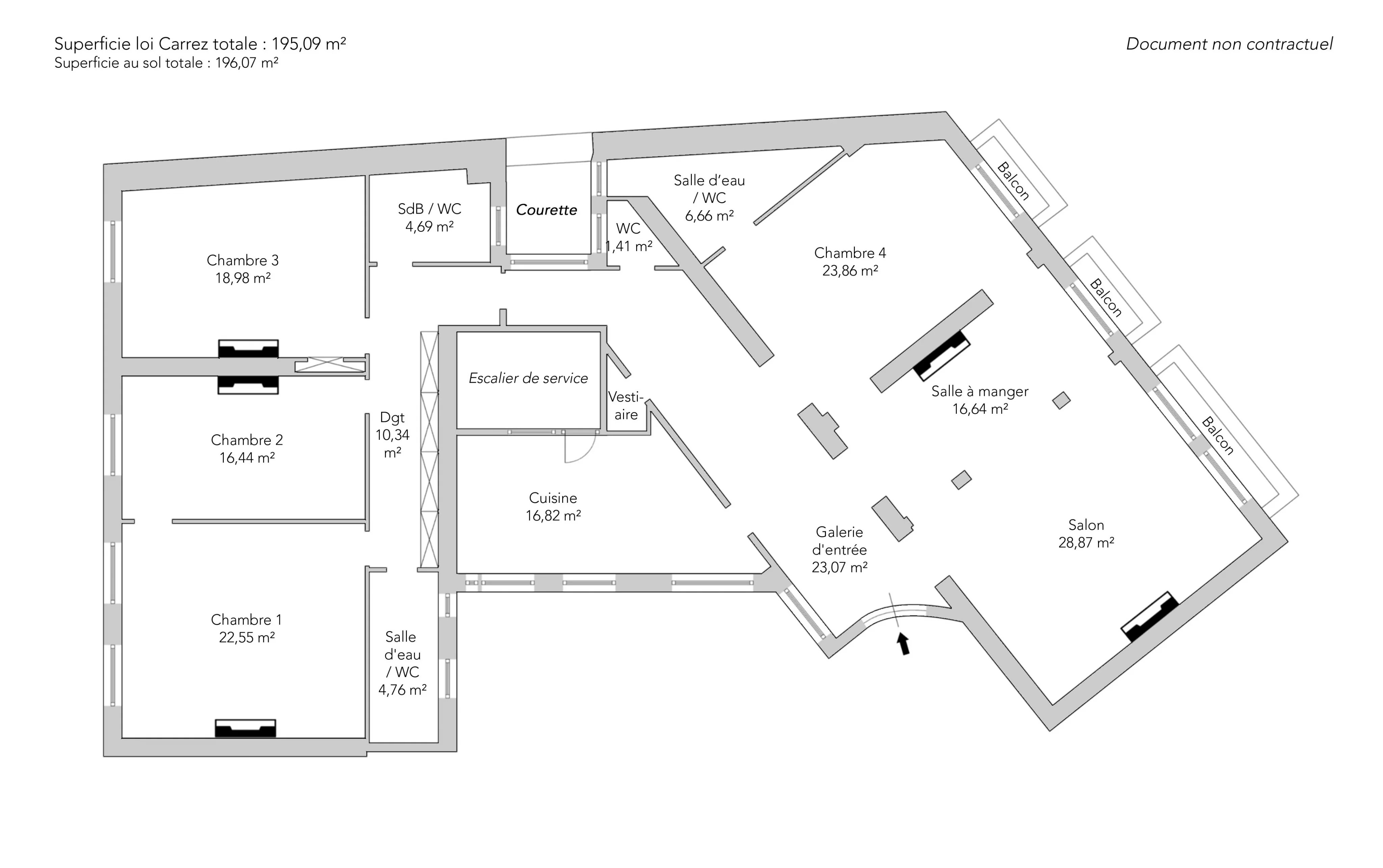 On the second floor with elevator of a magnificent Haussmannian building made of cut stone dating from 1892, luxurious family and reception apartment of 195.09sqm Carrez law. Crossing and flooded with light, it benefits from balconies facing west.
