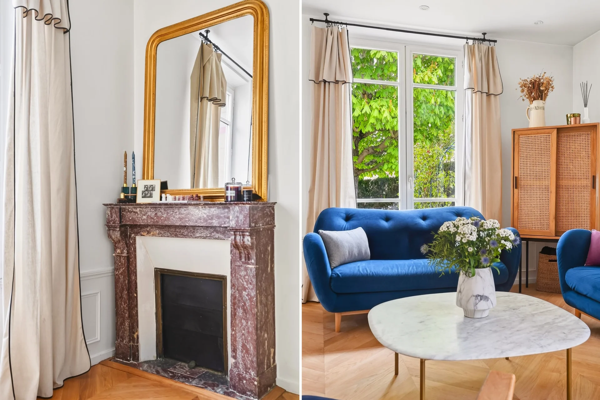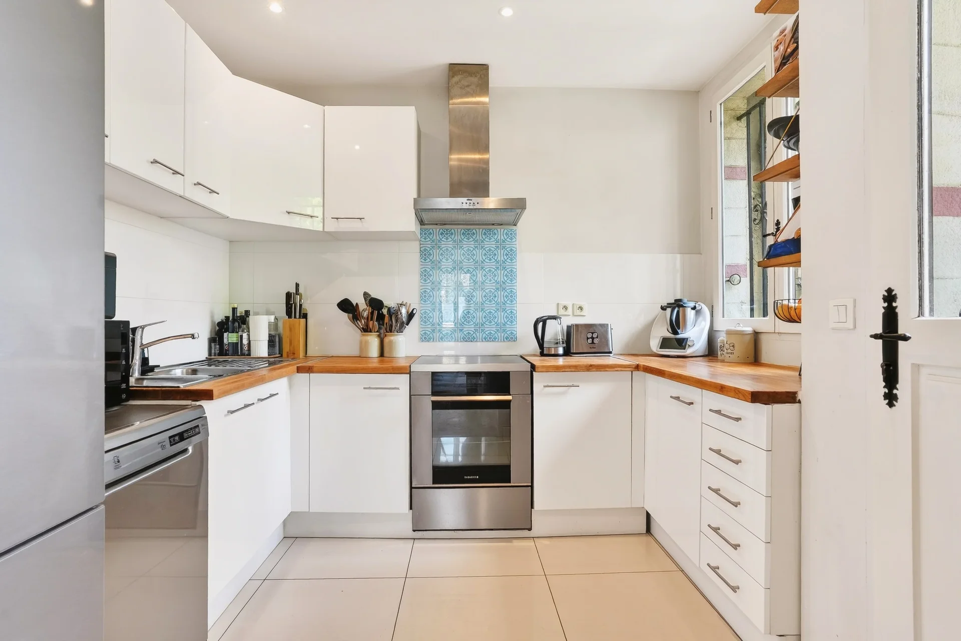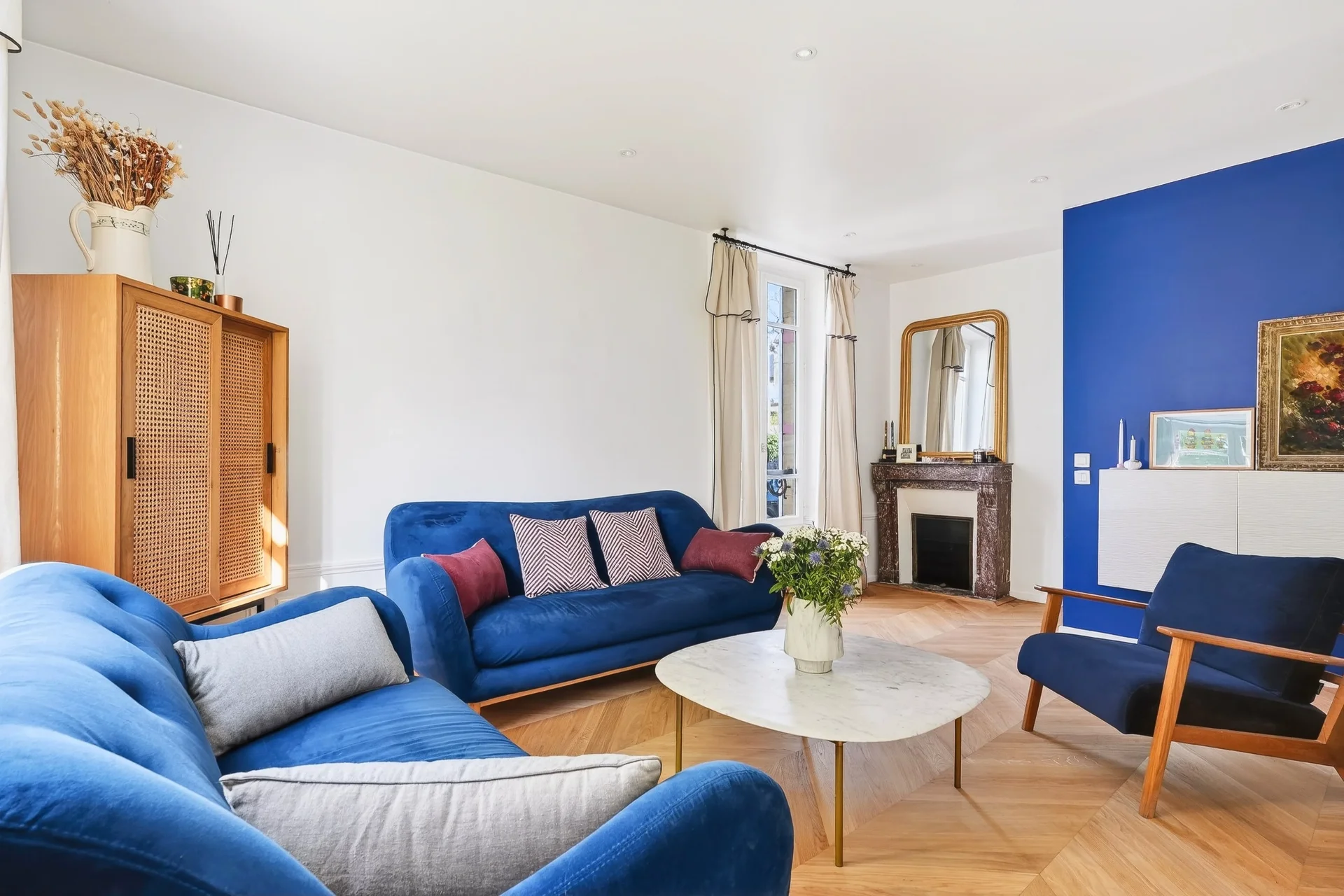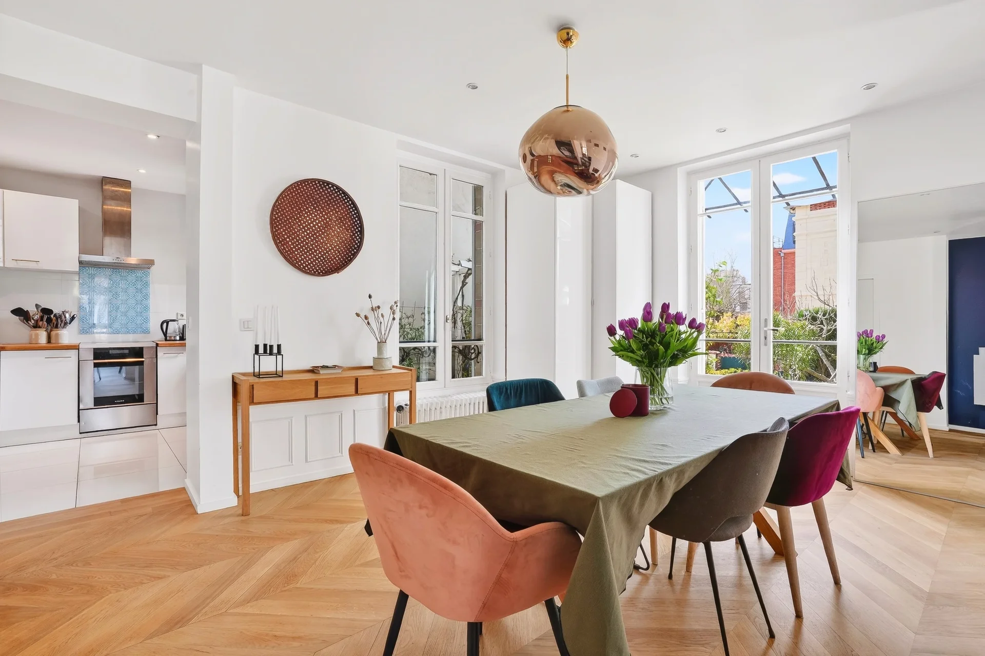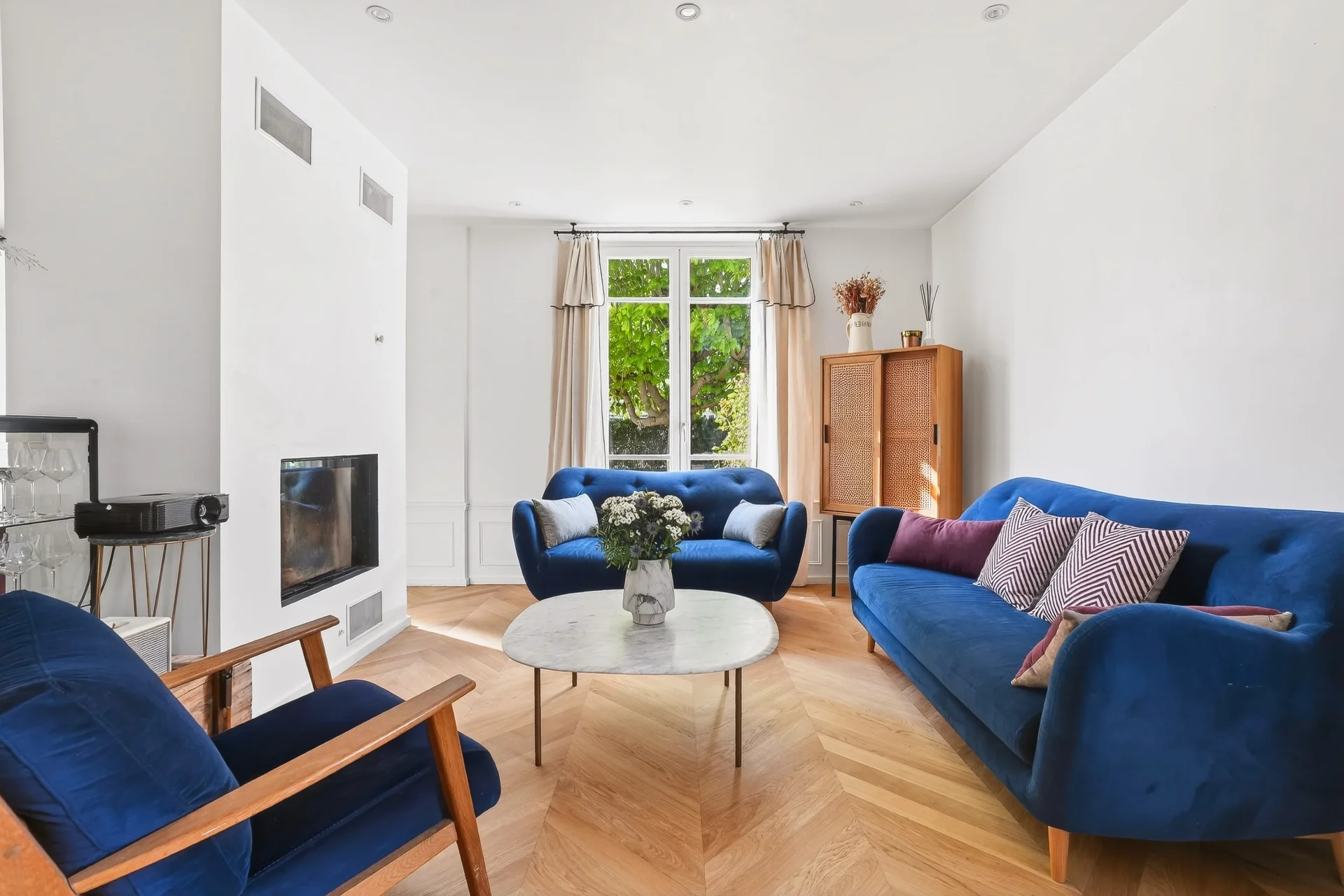 Le rez-de-chaussée propose une agréable pièce de réception lumineuse, organisée autour d’une cheminée centrale à double foyer séparant le salon et la salle à manger. La cuisine, conviviale et fonctionnelle, s’ouvre directement sur une terrasse. Toilettes invités à ce niveau.