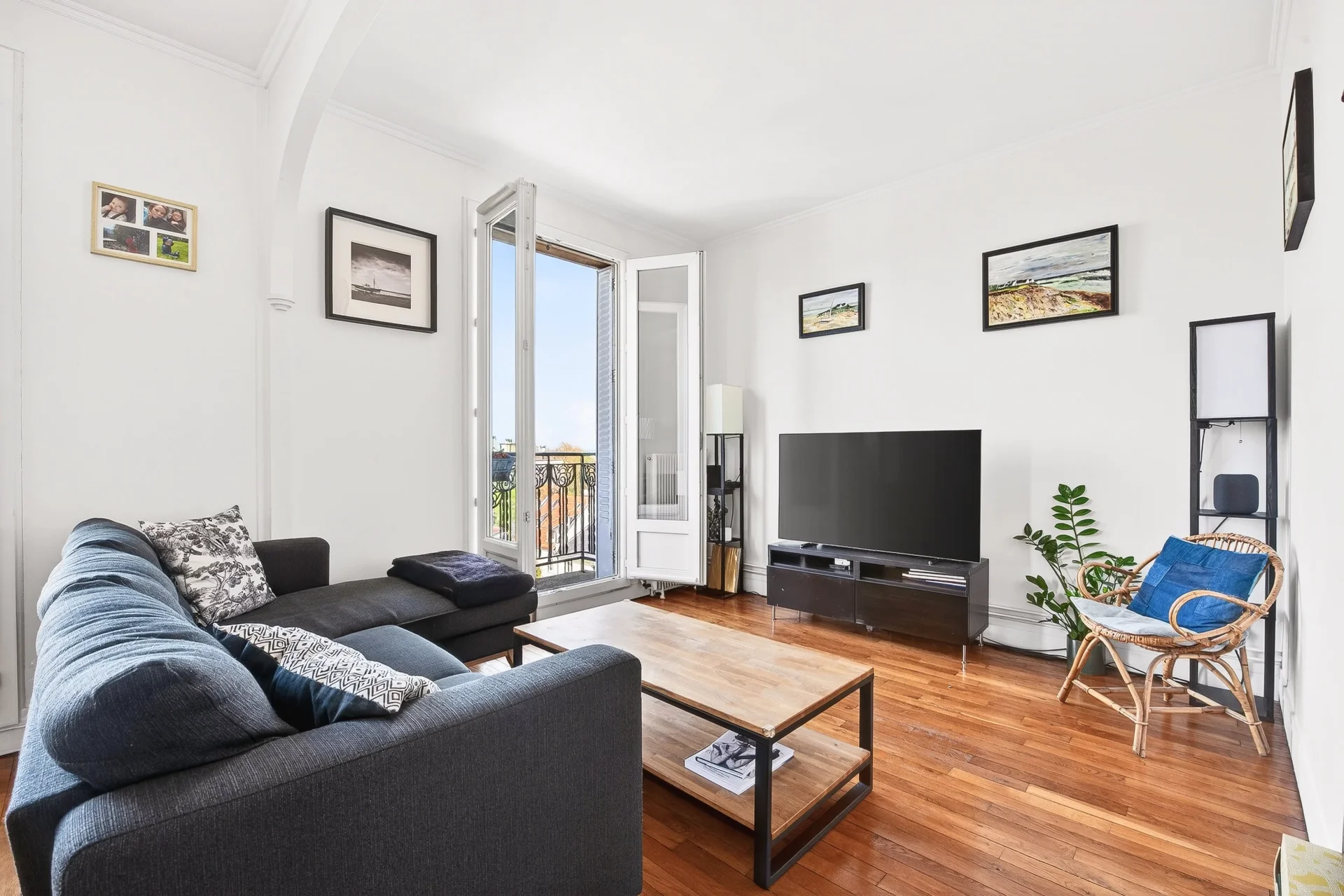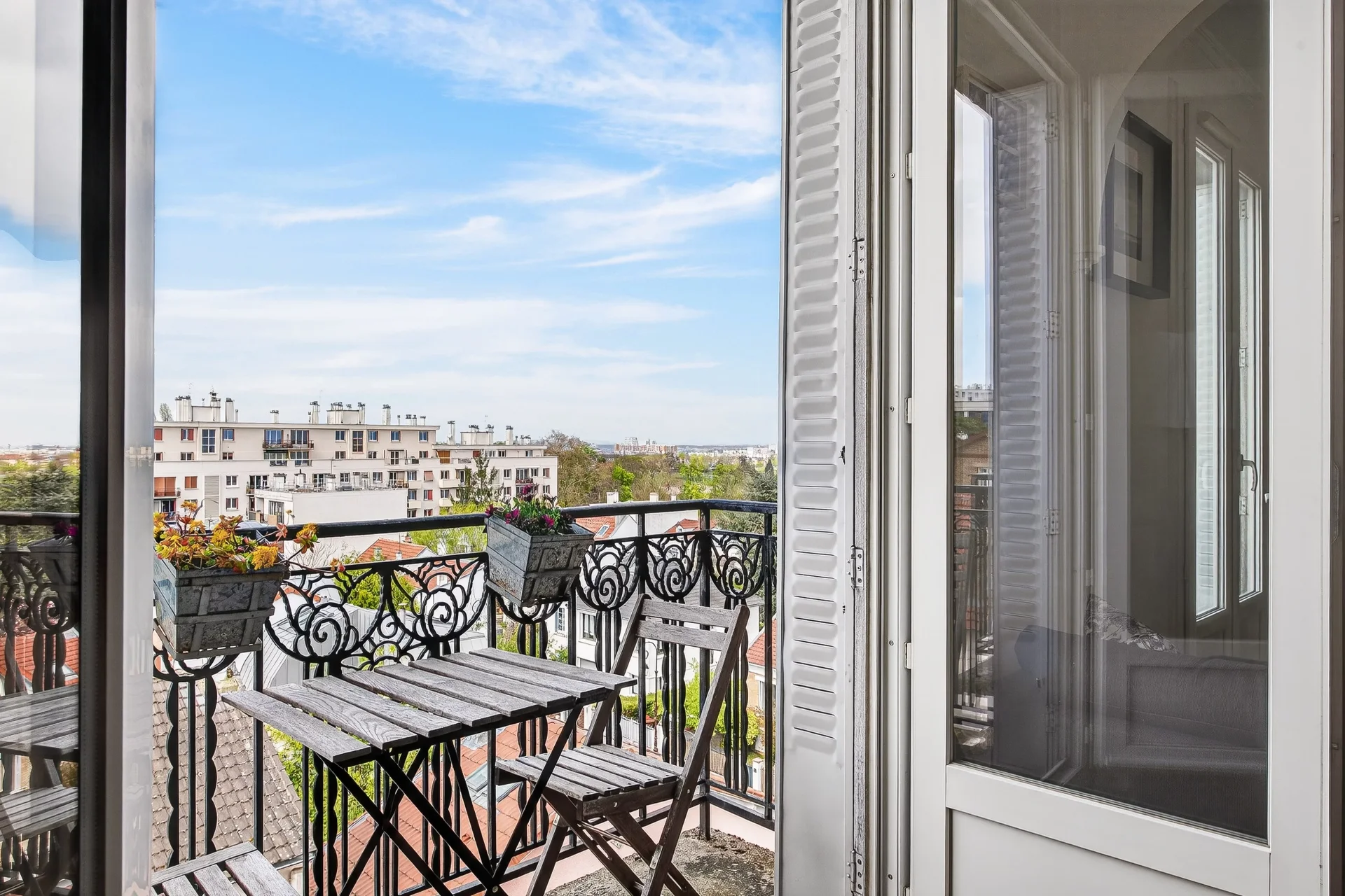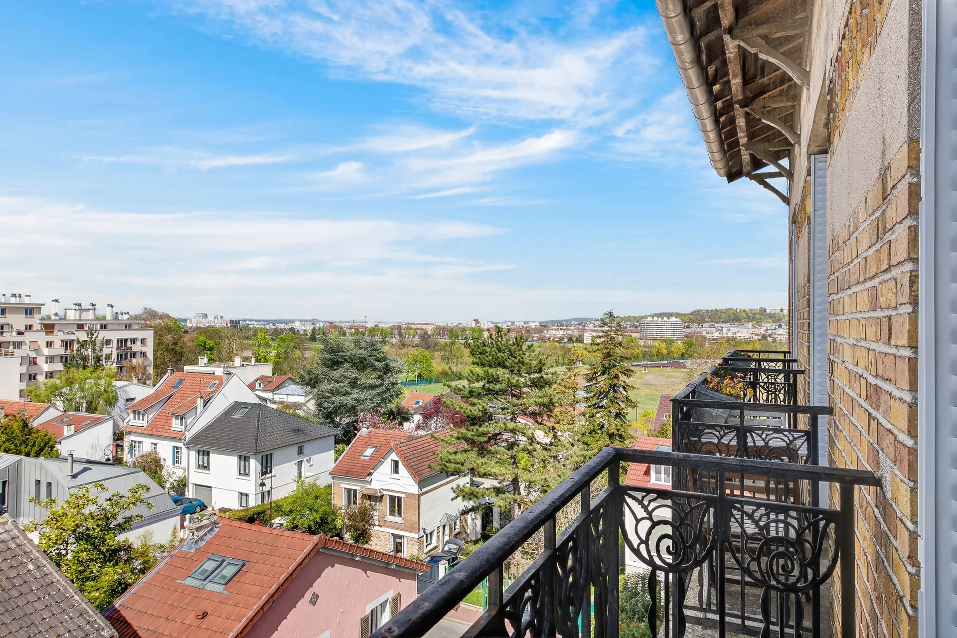 In a building from 1930s, this characterful property bathed in light throughout the day offers a peaceful living environment and unobstructed views from its three balconies, with the Saint-Cloud racecourse and the Eiffel Tower in the background.