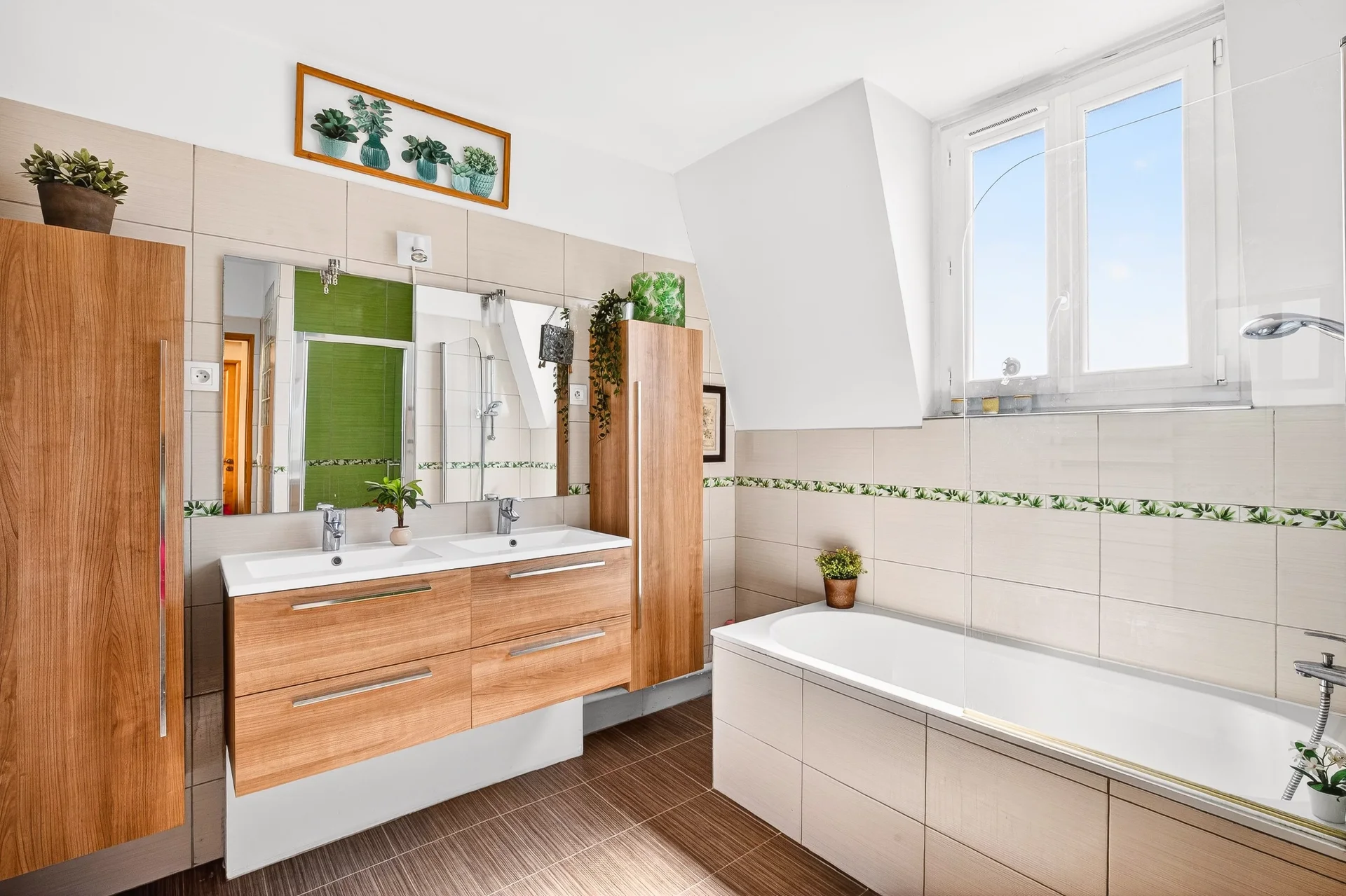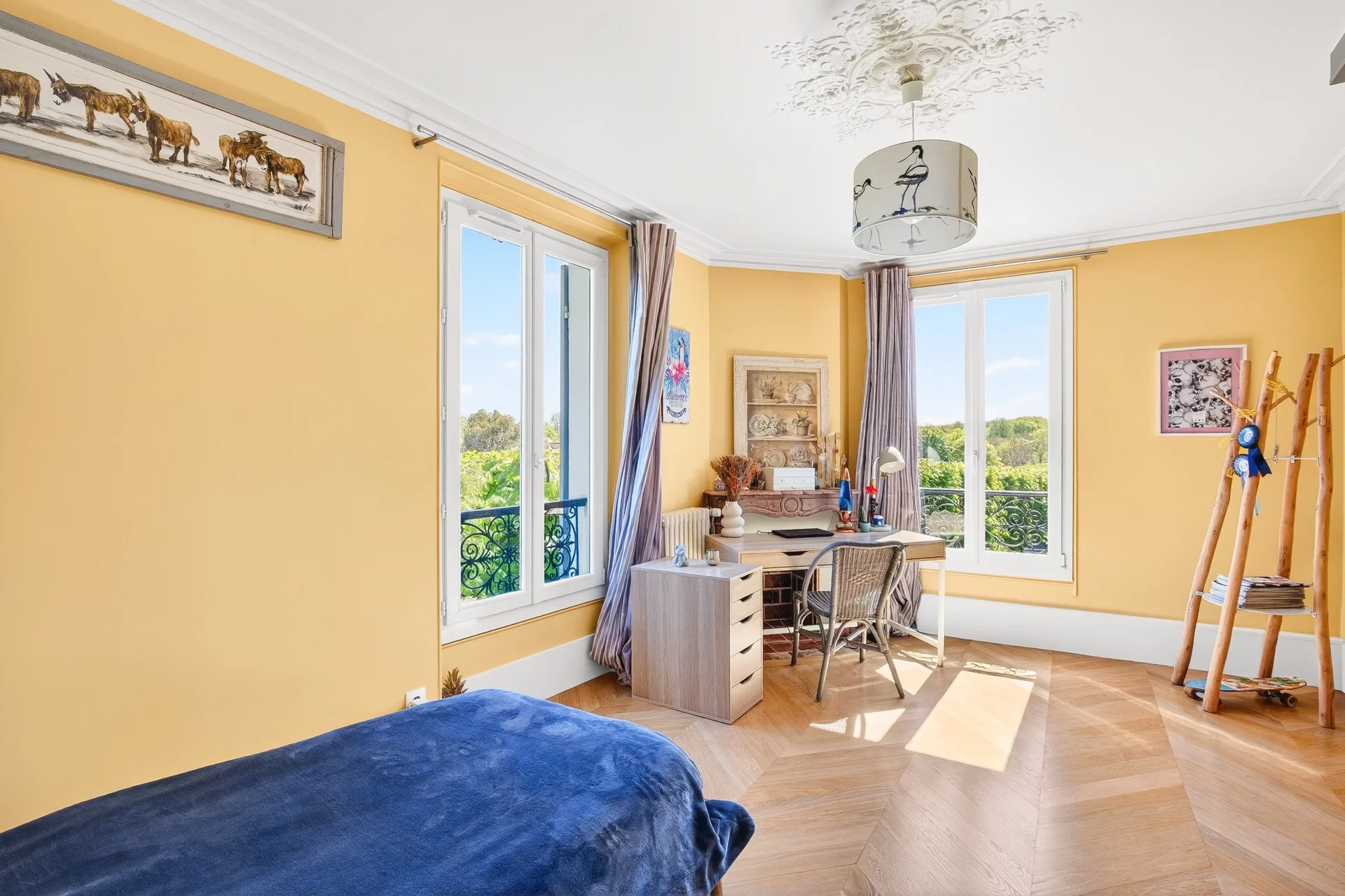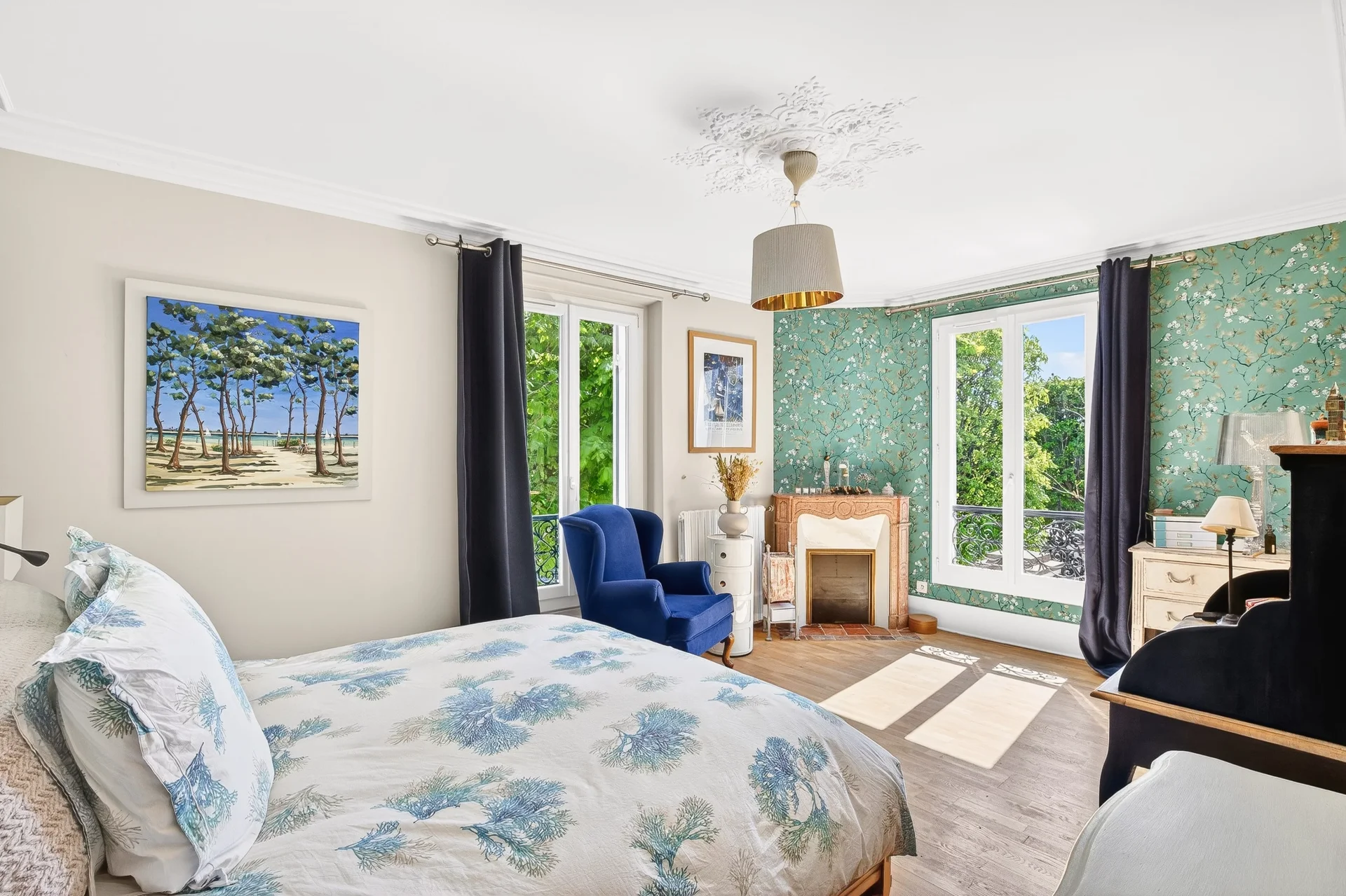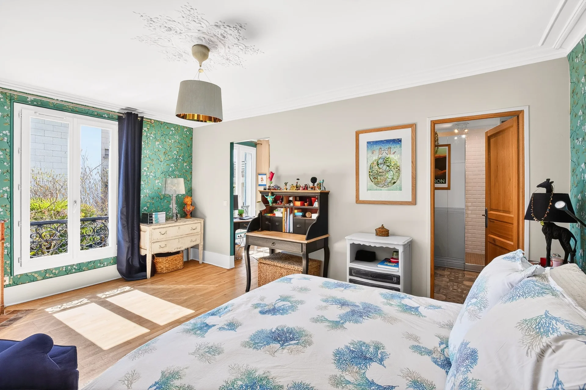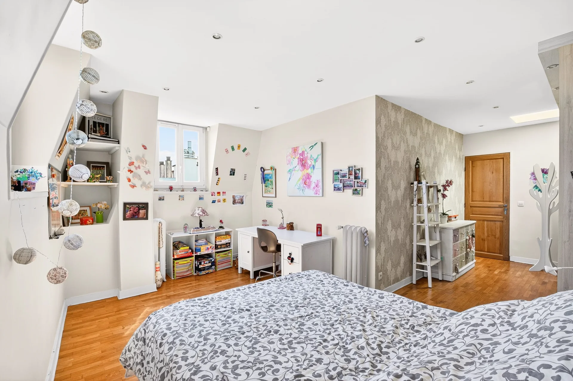 On the second floor, a landing distributes two beautiful bedrooms as well as a large office with storage, enjoying a clear view of the park and facing south, offering constant brightness.