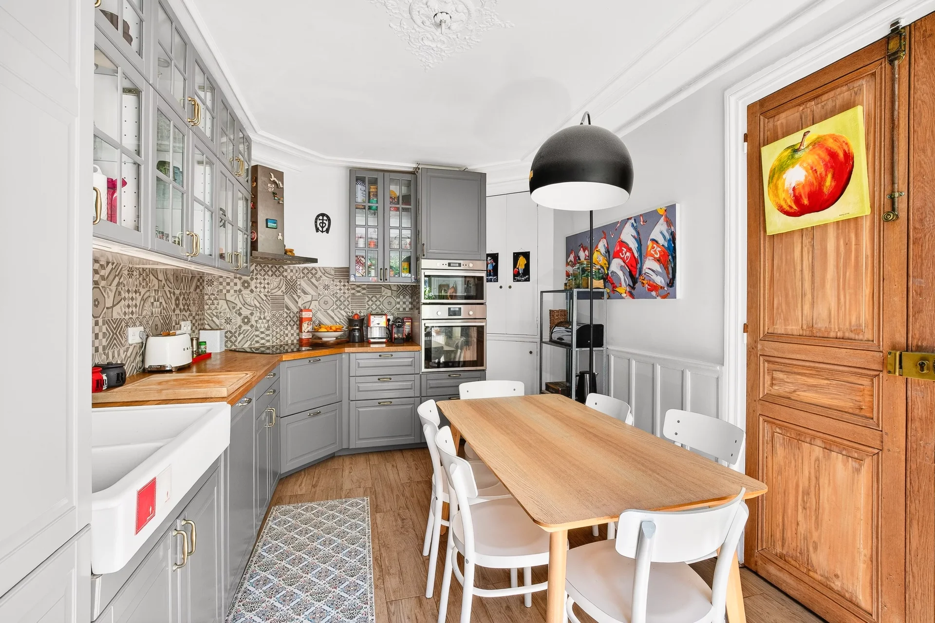 It smoothly extends to a terrace and a landscaped garden, a true green haven. A generous dining kitchen, both convivial and functional, is in the extension of this living space.