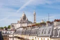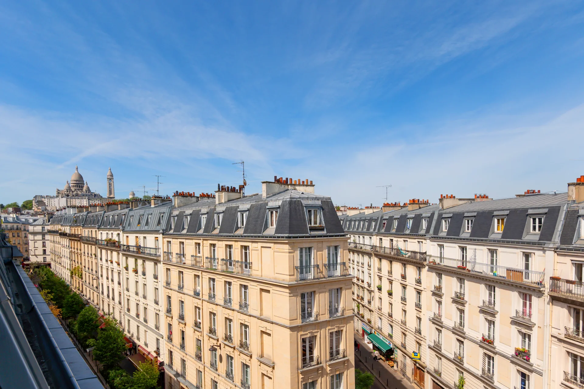 It includes a dual living room with an unobstructed view of Sacré-Cœur, a large bedroom with storage, a shower room with laundry space, and a separate toilet.