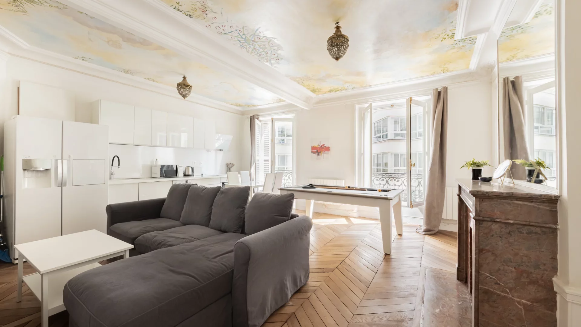 In a magnificent private passageway planted with two rows of plane trees and bordered by former artist's studios dating from the late 19th century, pleasant five-room apartment of 112.48sqm loi Carrez on the second floor by staircase of a beautiful building with a family home feel. Boasting spacious rooms and an unobstructed view of the gardens of the Paris Chamber of Commerce and Industry, it comprises an entrance hall leading to a bright living room, a separate kitchen, four bedrooms, a bathroom with toilet, a shower room and a separate toilet.