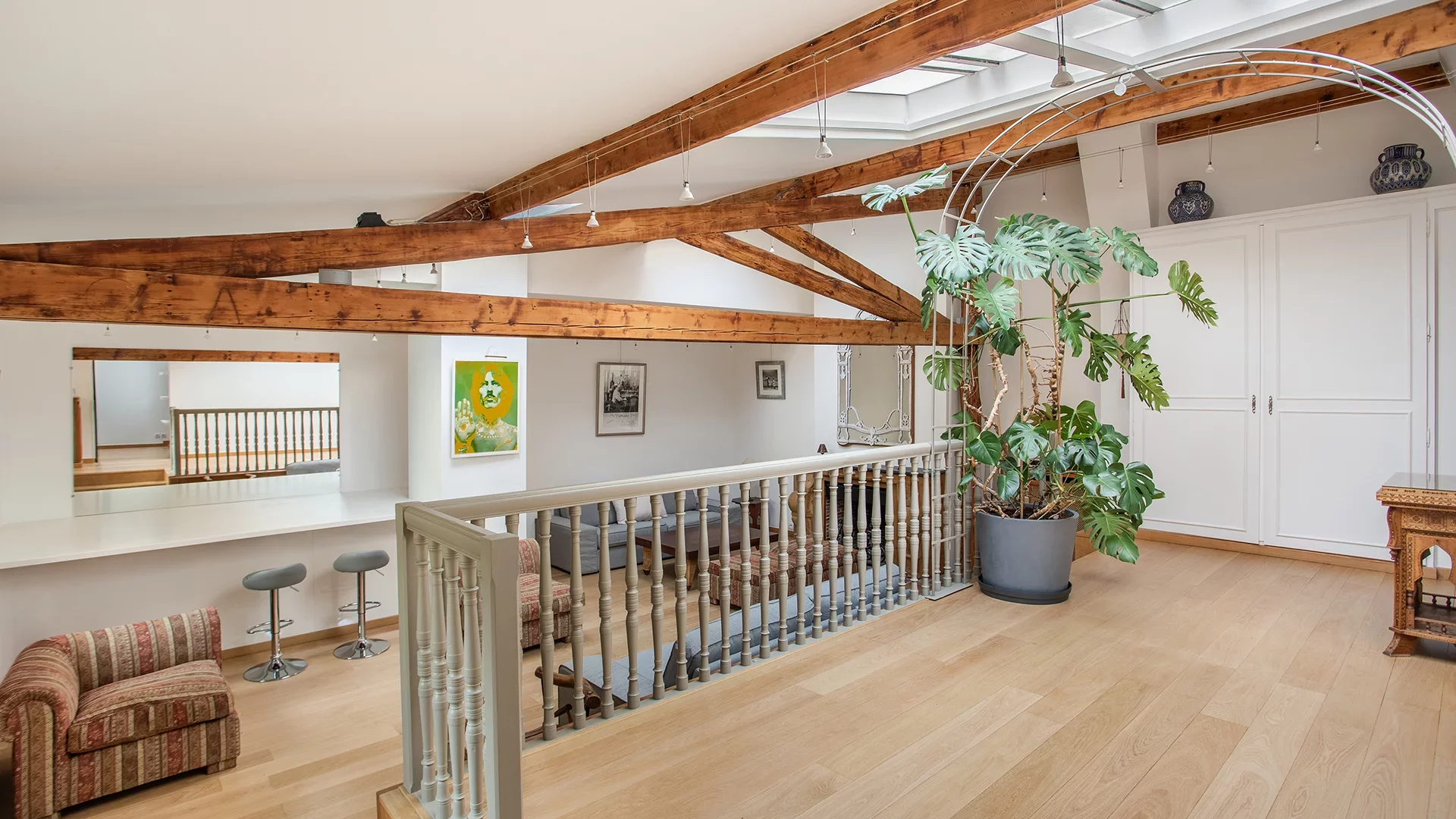 Situé au premier et dernier étage sans ascenseur d'un immeuble sécurisé avec gardien, duplex d'exception traversant, aménagé en quatre pièces de 113,09m² loi Carrez et 157,59m² au sol.