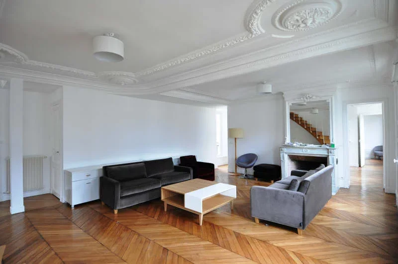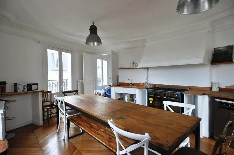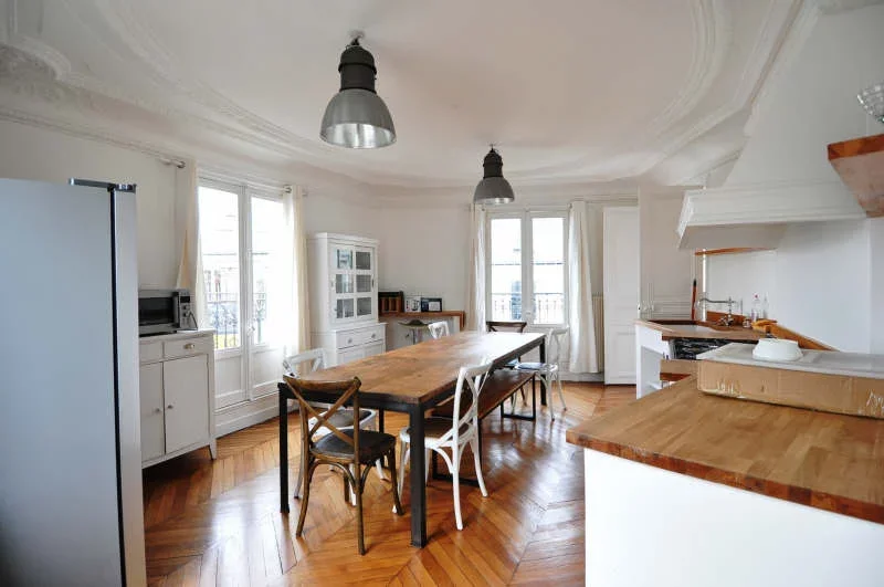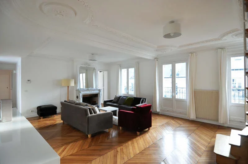 Ce somptueux duplex familial de huit pièces de 183,38m² loi Carrez et 193,77m² au sol, entièrement rénové avec des prestations haut de gamme, bénéficie d'un balcon filant de 20m² et d'une vue sur le Sacré-Cœur et les toits de Paris. Meublé avec goût, il comporte une entrée, un grand séjour plein sud baigné de soleil, une cuisine dînatoire aménagée et équipée, quatre chambres, un bureau (ou d'une cinquième chambre), deux belles salles de bains et des toilettes.