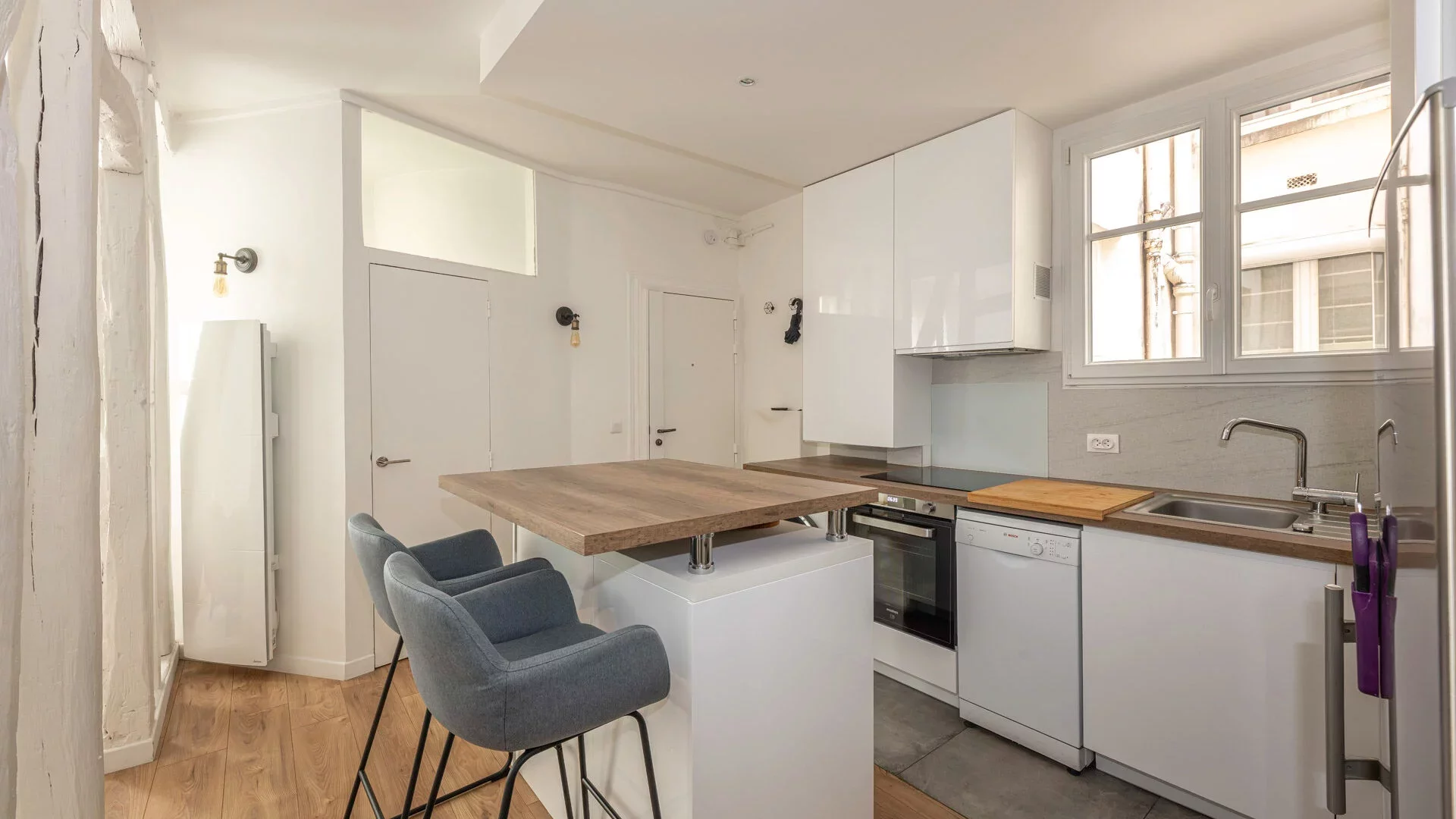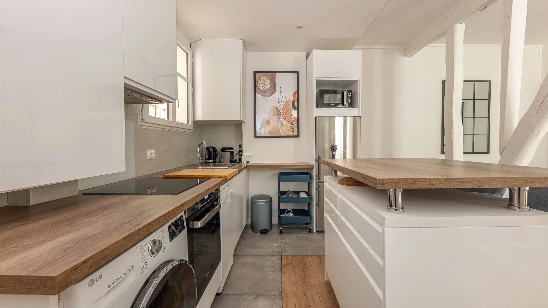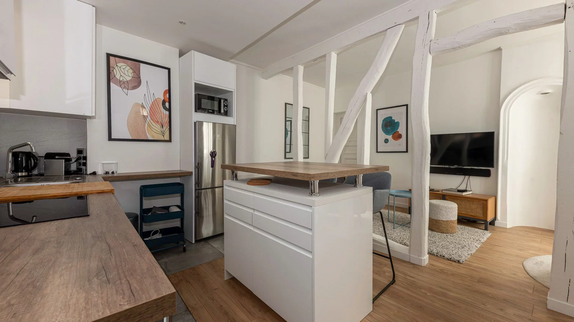 En parfait état et rénové, ce bien comporte une entrée, un séjour, une cuisine conviviale ouverte, aménagée et équipée dans le prolongement de la pièce principale, une chambre avec rangements, une salle de douche et toilettes indépendantes.