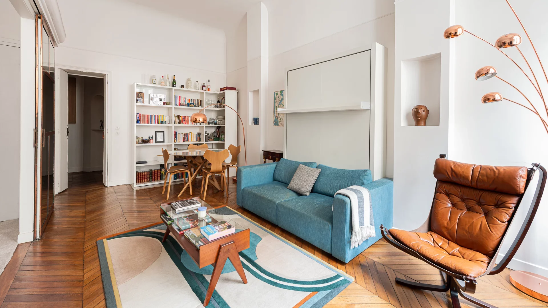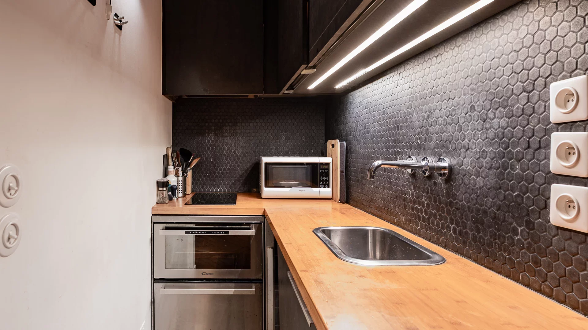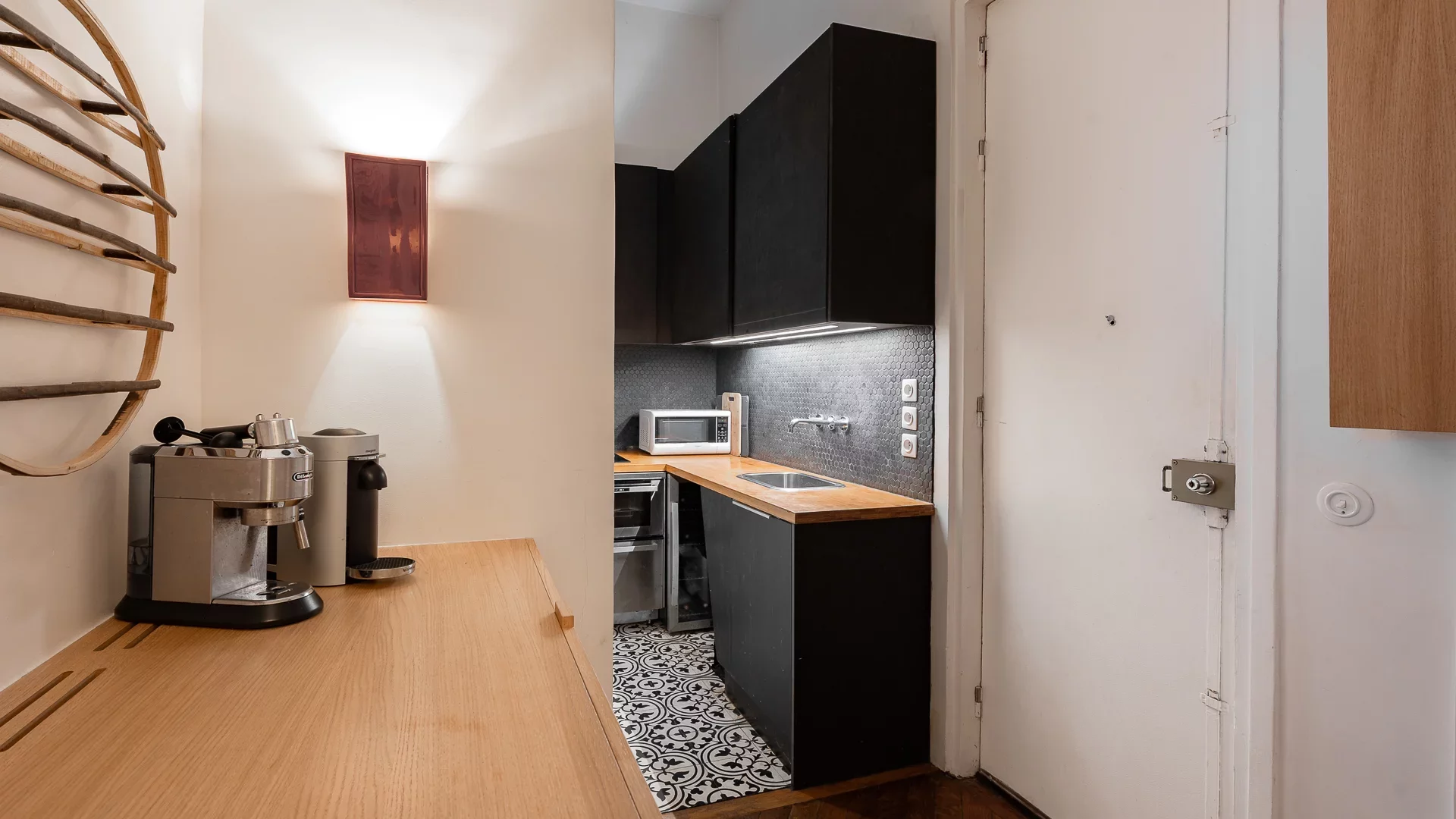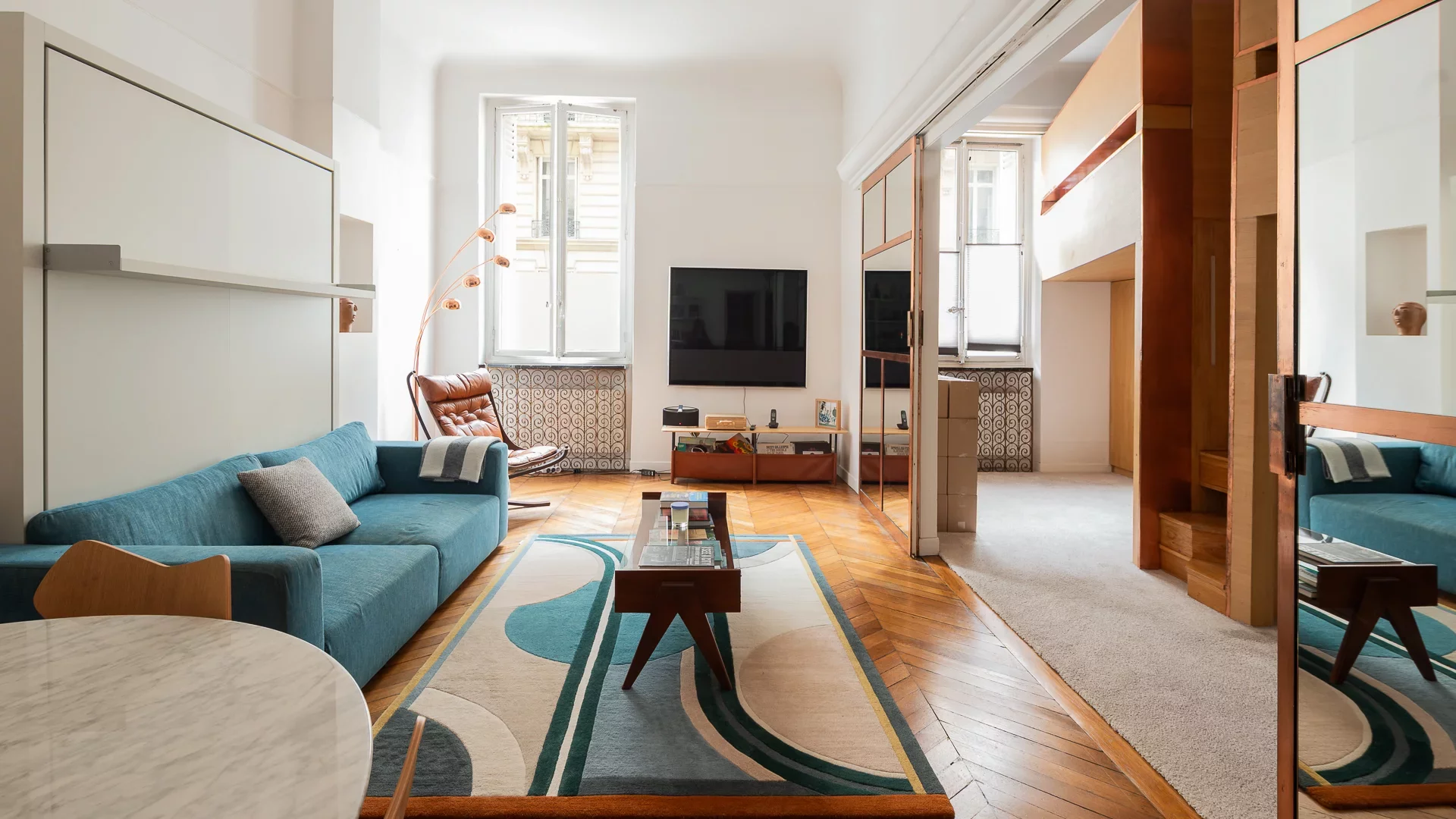 Il comprend une entrée, un dressing, un spacieux séjour sur rue calme et baigné de lumière, une cuisine semi-ouverte, une chambre aménagée avec deux mezzanines et une salle de bains avec toilettes.