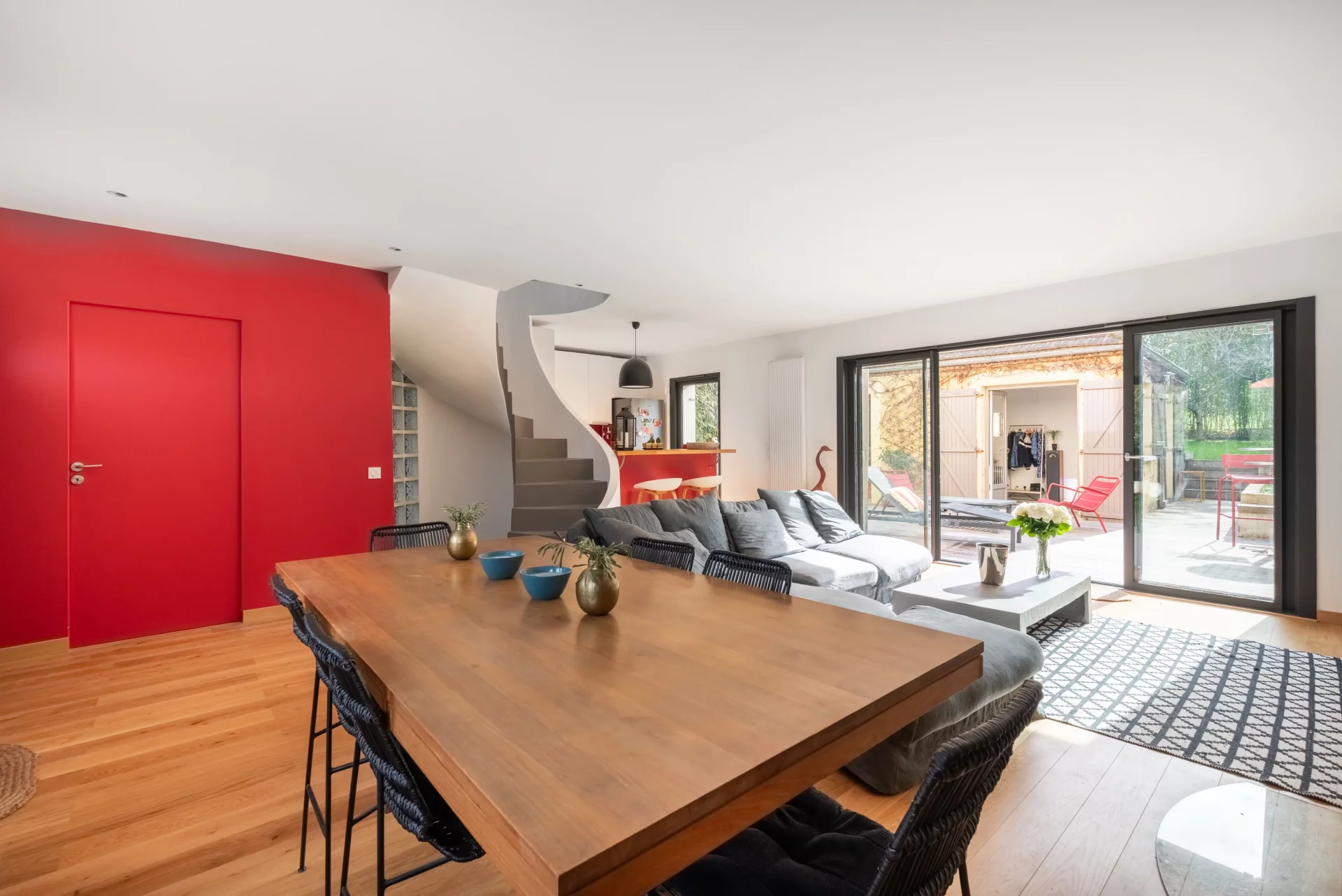 Au rez-de-chaussée, vous trouverez une spacieuse pièce de vie de 45,21m² avec un agréable poêle à bois et une cuisine ouverte et équipée, s'ouvrant sur une vaste terrasse exposée plein sud. Un bureau ainsi que des toilettes invités complètent cet espace.