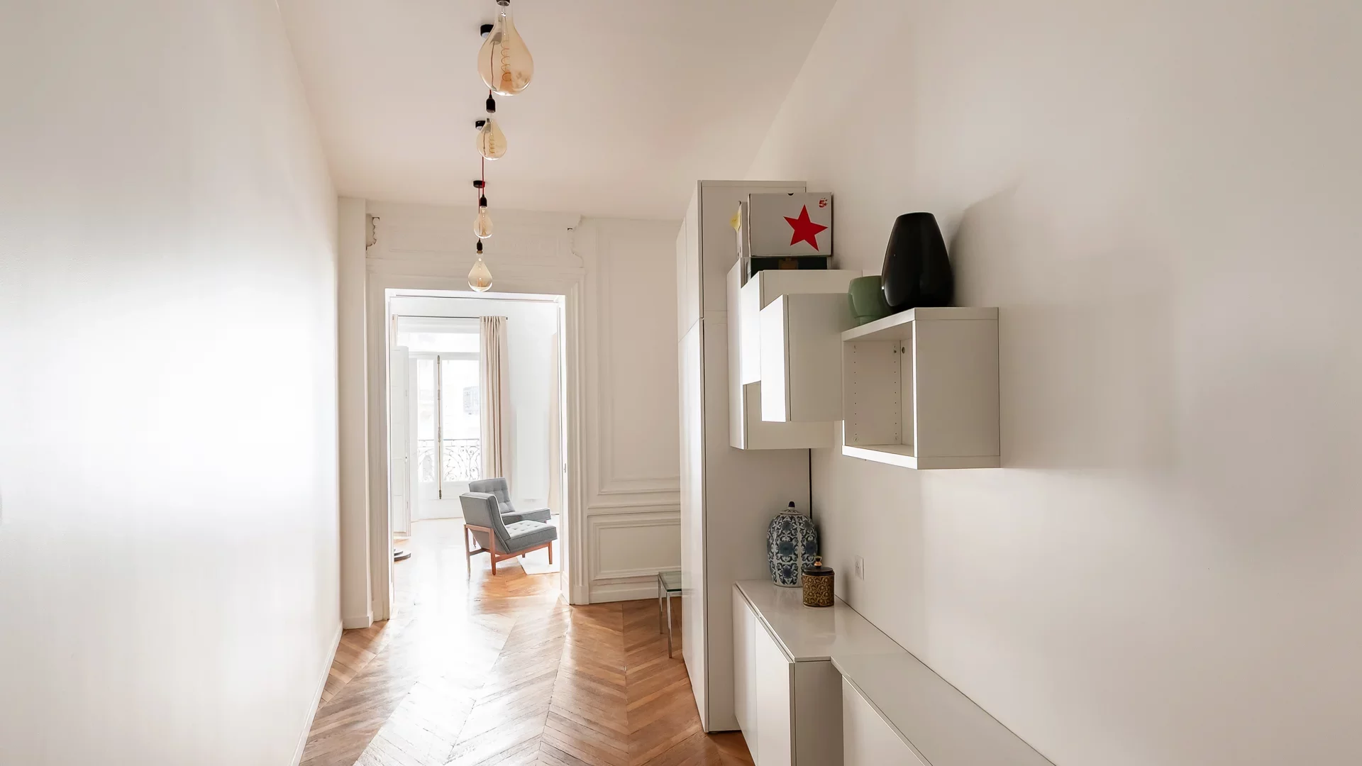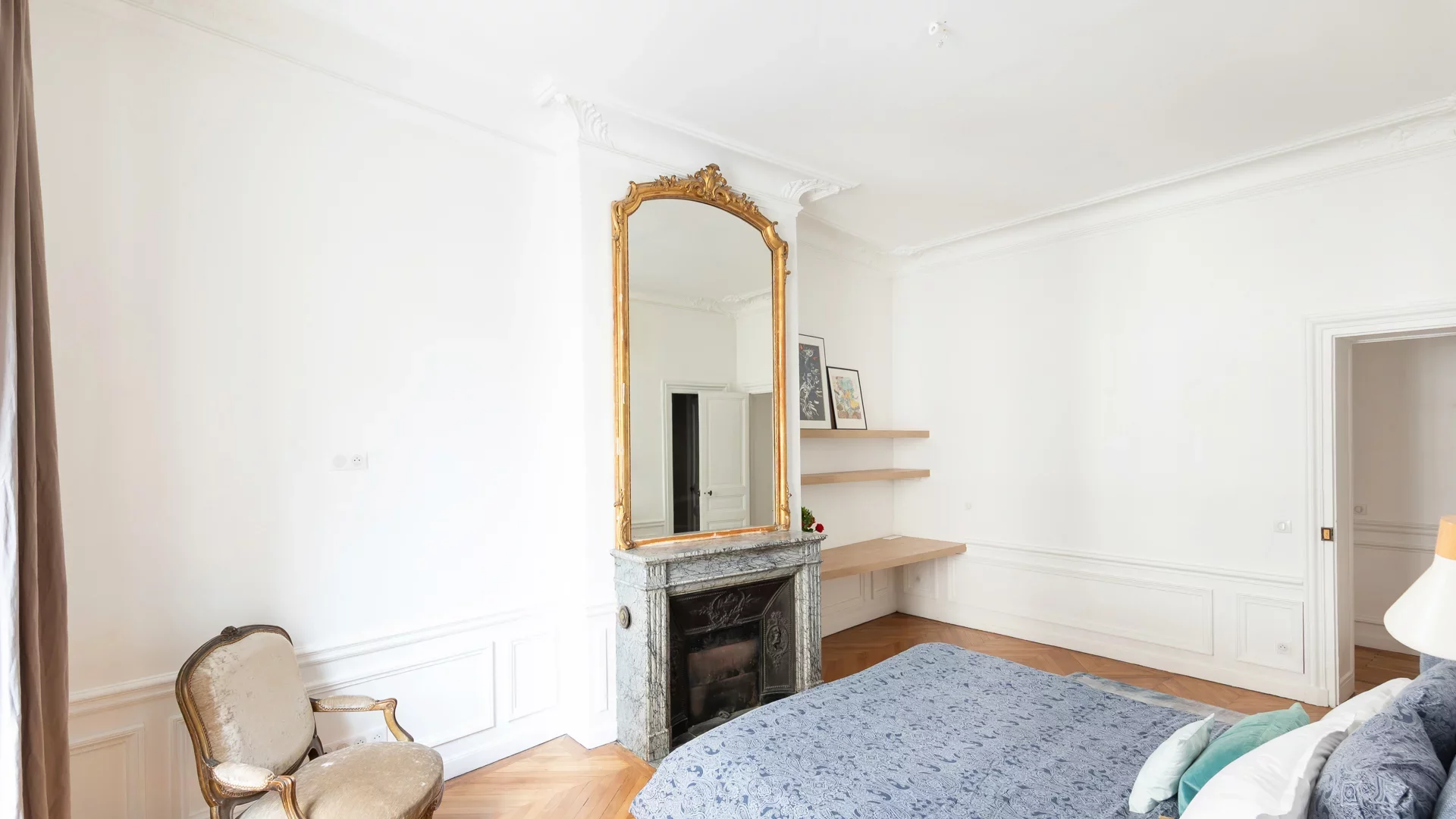 Il comprend une double réception, 2 chambres avec salle de douches et une suite parentale comprenant salle de bains et dressing. Il bénéficie de moulures, de cheminées, de parquet exceptionnel et 3,4m de hauteur sous plafond.