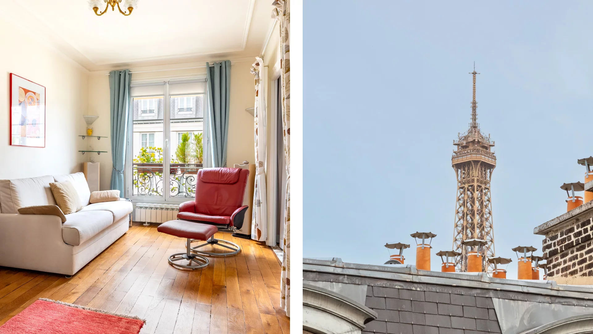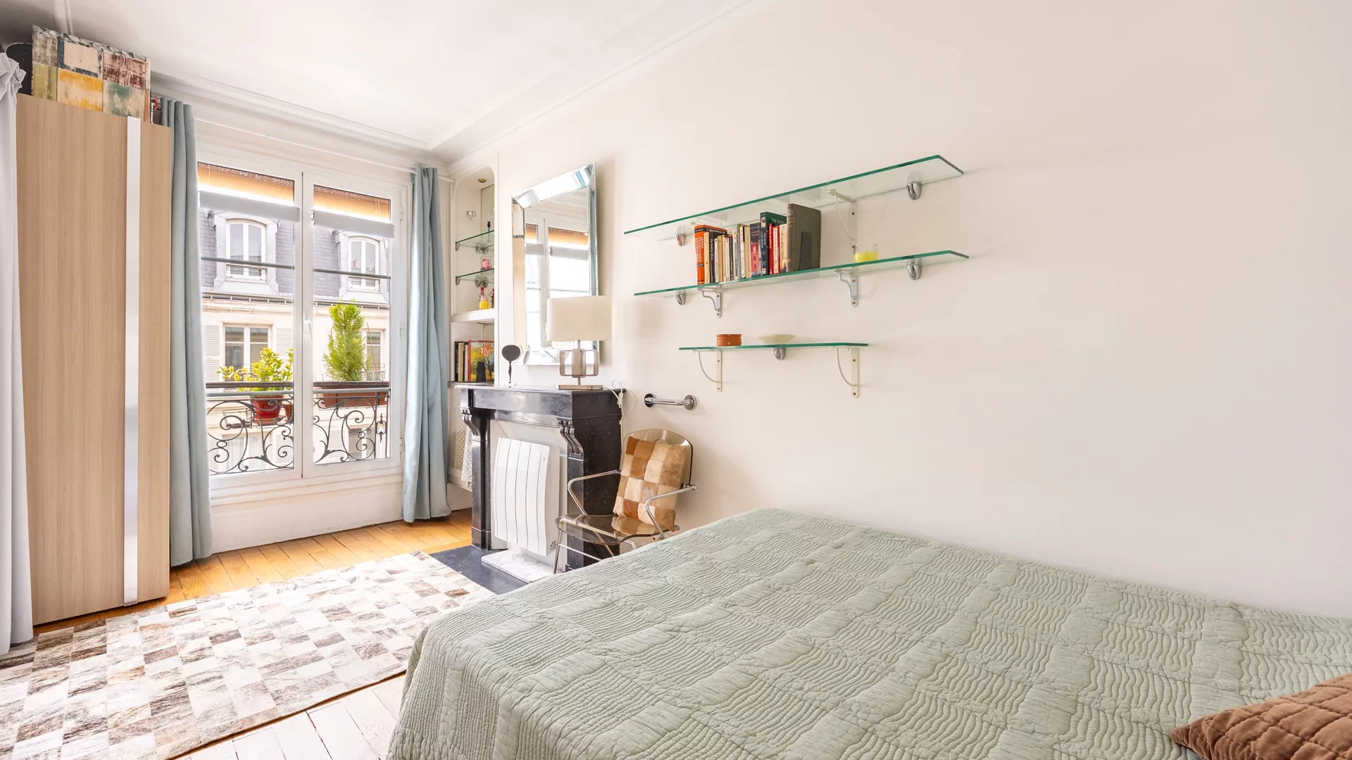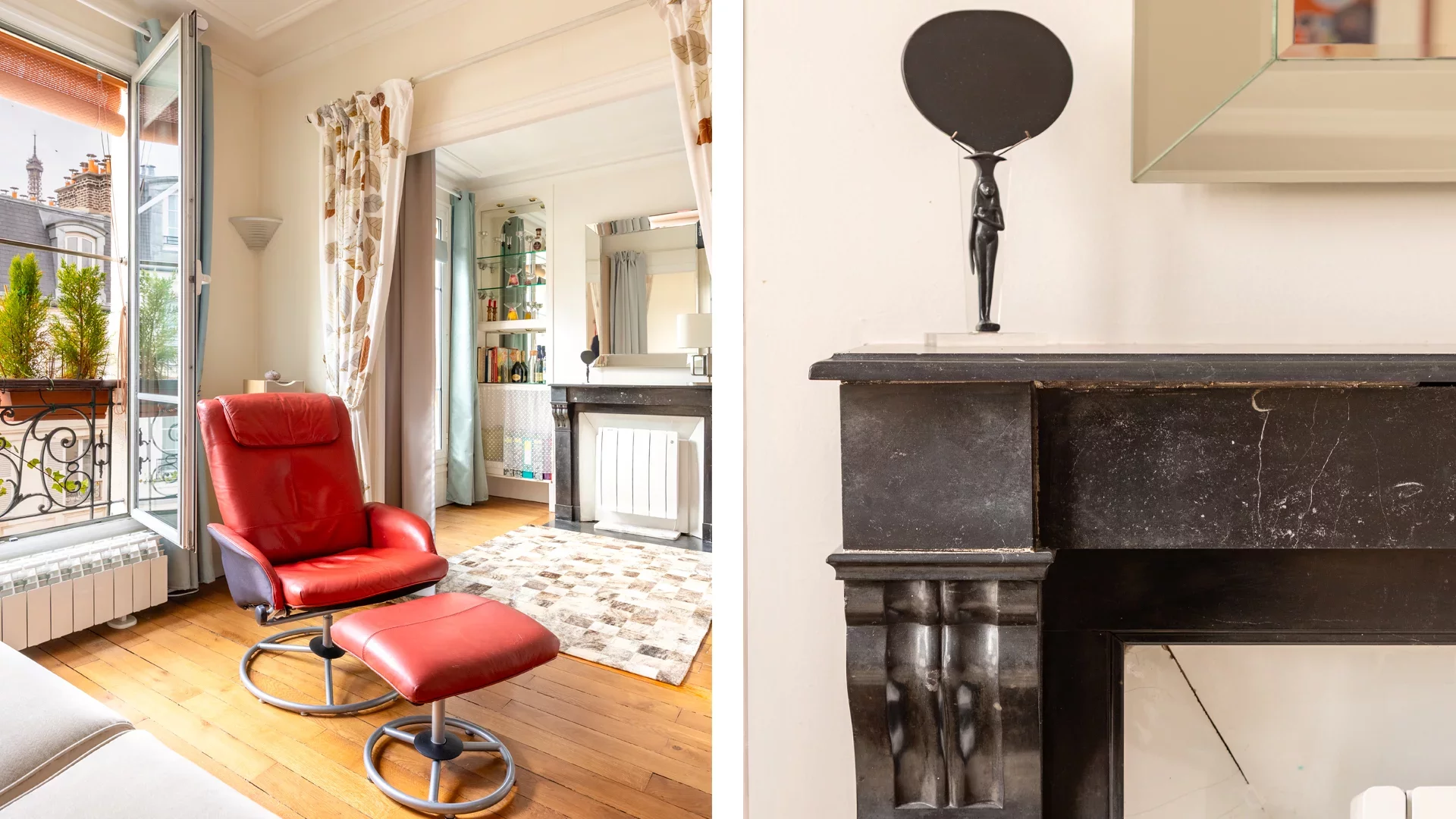 Doté d'un plan en étoile qui distribue les pièces sans perte d'espace, il comporte une entrée, un salon et une chambre sur rue avec une orientation ouest, une vue dégagée et une petite vue sur la tour Eiffel. Le bien est agrémenté d'un parquet au sol, d'une belle hauteur sous plafond et d'une cheminée décorative. Côté cour, à l'est avec une vue dégagée, la cuisine dinatoire ainsi que la salle de douche avec des toilettes. Au centre, un dressing et des placards complètent le plan. Équipé de radiateurs électriques neufs, d'un ballon d'eau chaude récent et du double vitrage, cet appartement est proposé meublé.