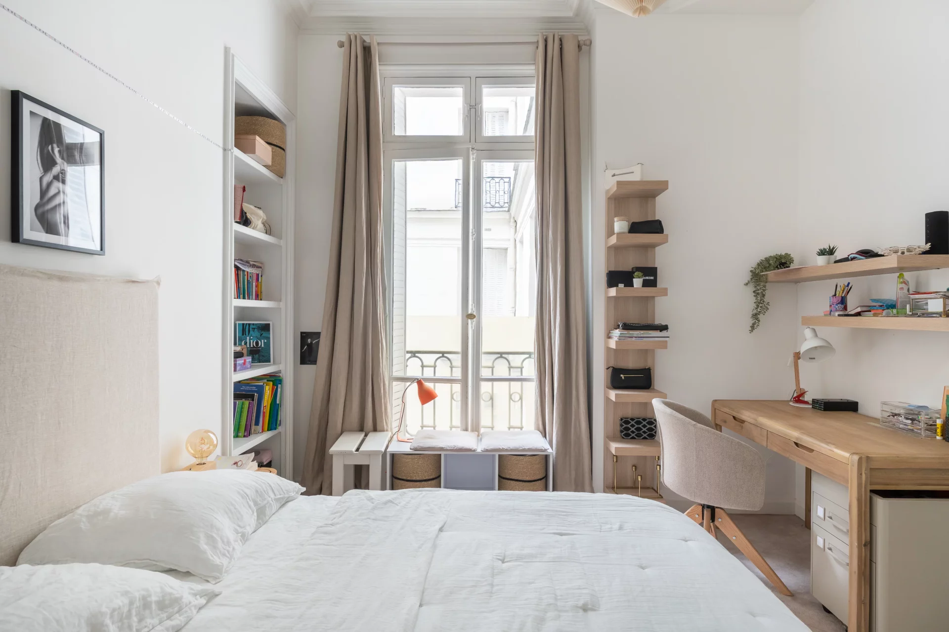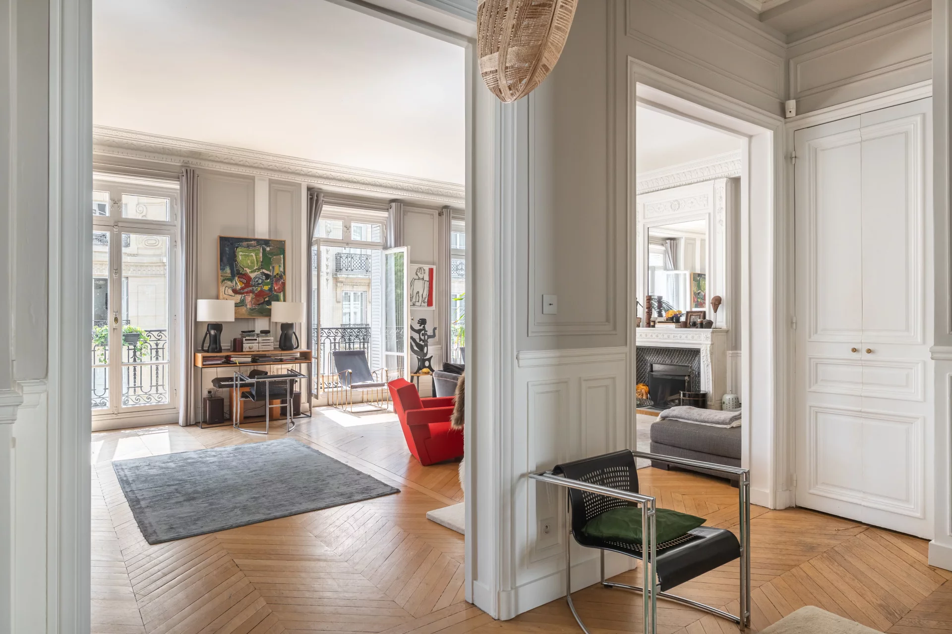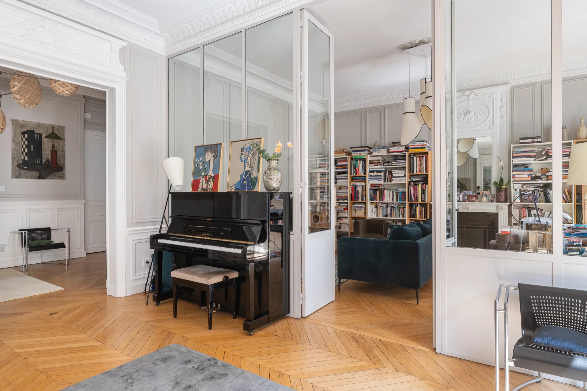 Les éléments d’époque (parquet, moulures et cheminées) ont été soigneusement préservés et mis en valeur par une rénovation raffinée. De nombreux rangements intégrés apportent un confort supplémentaire.