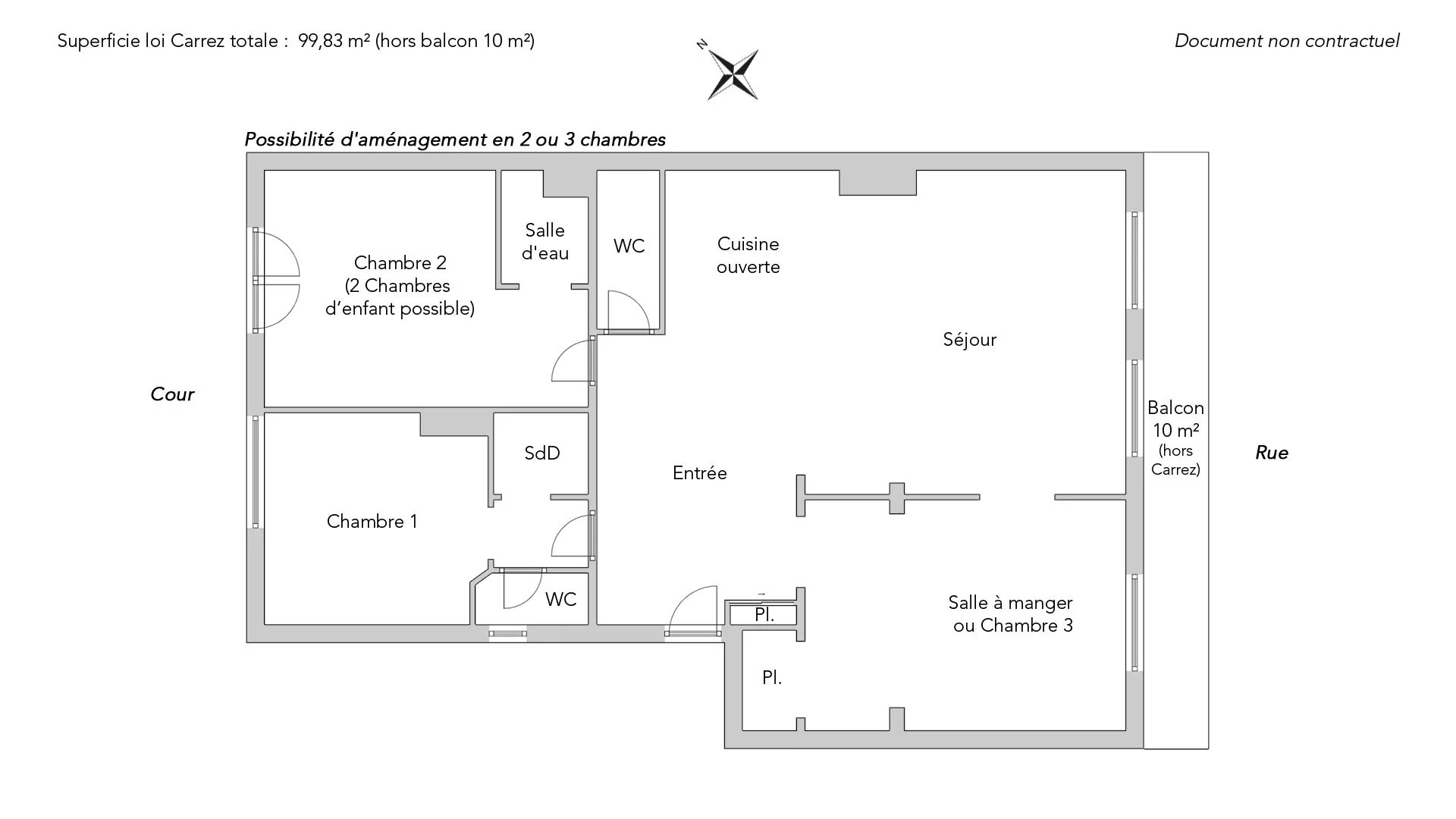 Son plan en étoile comprend une entrée, une double réception de 41,88m² prolongée par un grand balcon de 10m² exposé sud-est, une cuisine dînatoire et son cellier, une grande chambre sur cour, une salle de bains complète avec toilettes, une salle de douche et des toilettes indépendantes. Une configuration en deux suites et cuisine ouverte est facilement réalisable.