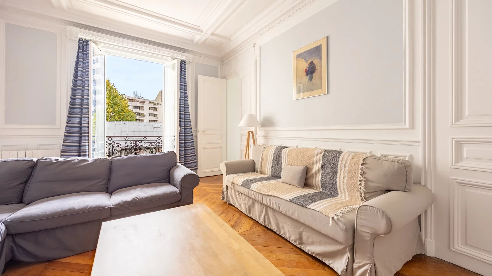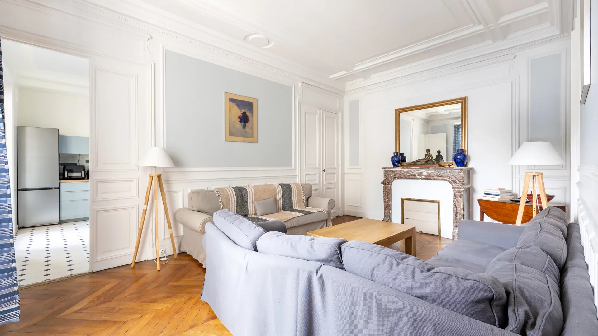 Le charme de l’ancien a été préservé — parquet, moulures, cheminée — tout en offrant un plan optimisé et modulable permettant aisément la création d’une seconde chambre.