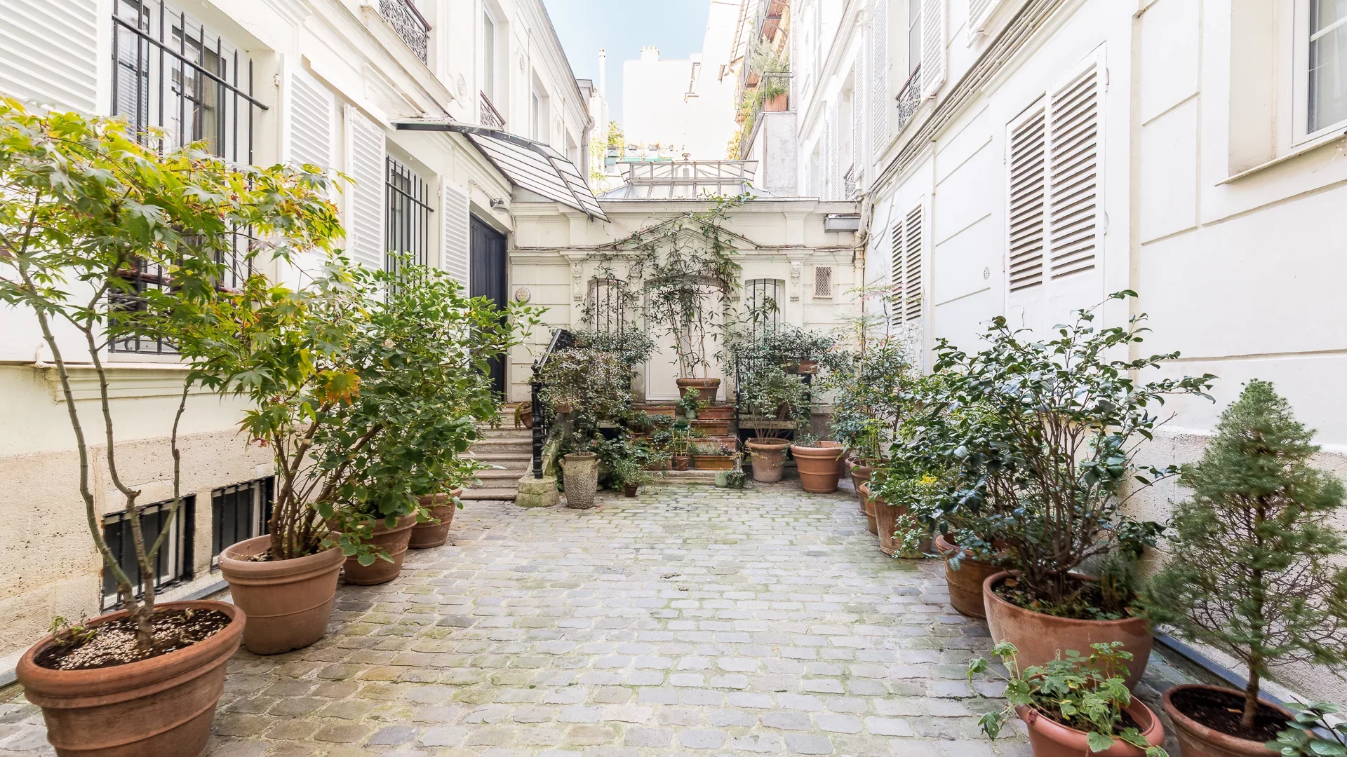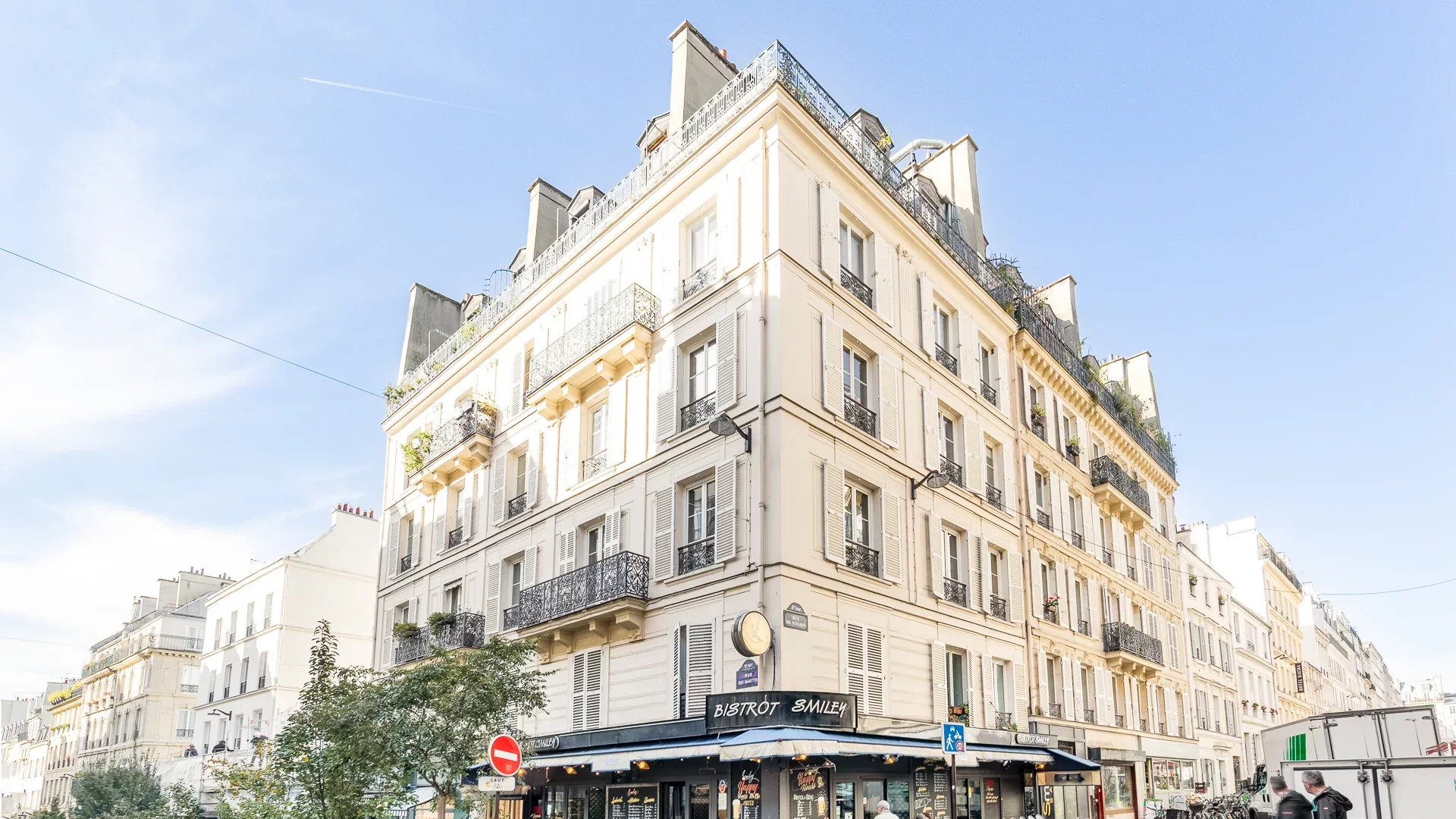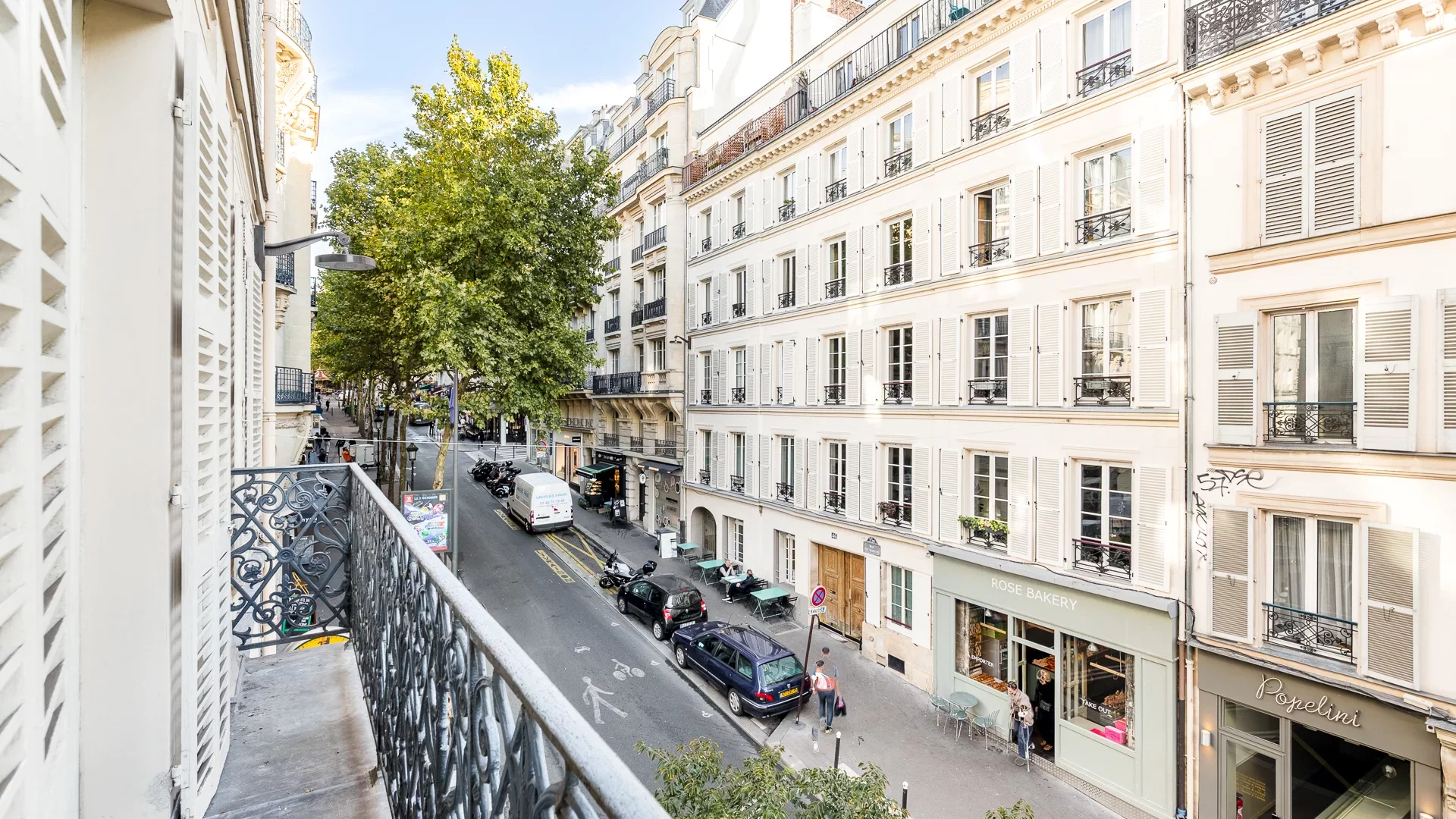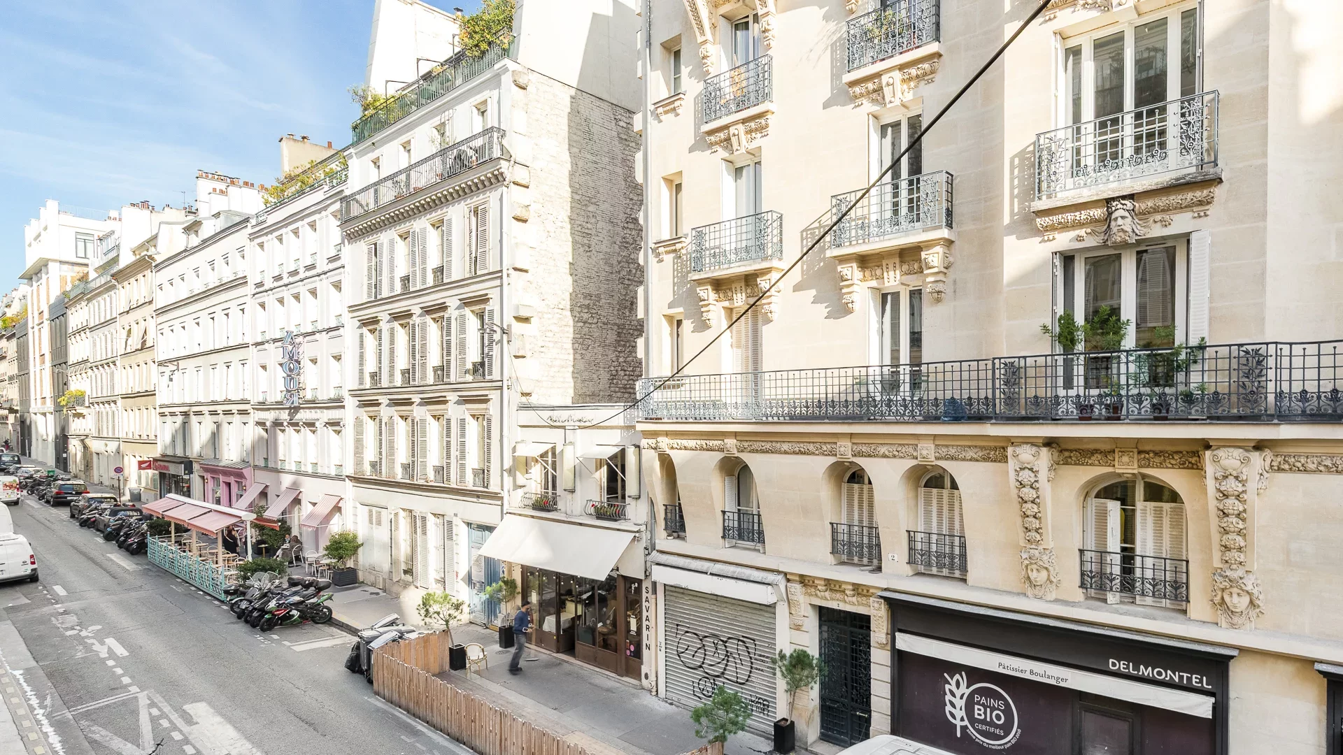 Le plan compact offre une entrée, un double séjour d'angle à la vue dégagée sur le haut de la rue des Martyrs, une cuisine indépendante (possibilité de l'ouvrir sur le séjour), deux chambres en enfilade dont une disposant d'un balcon et d'une salle de douche avec toilettes.