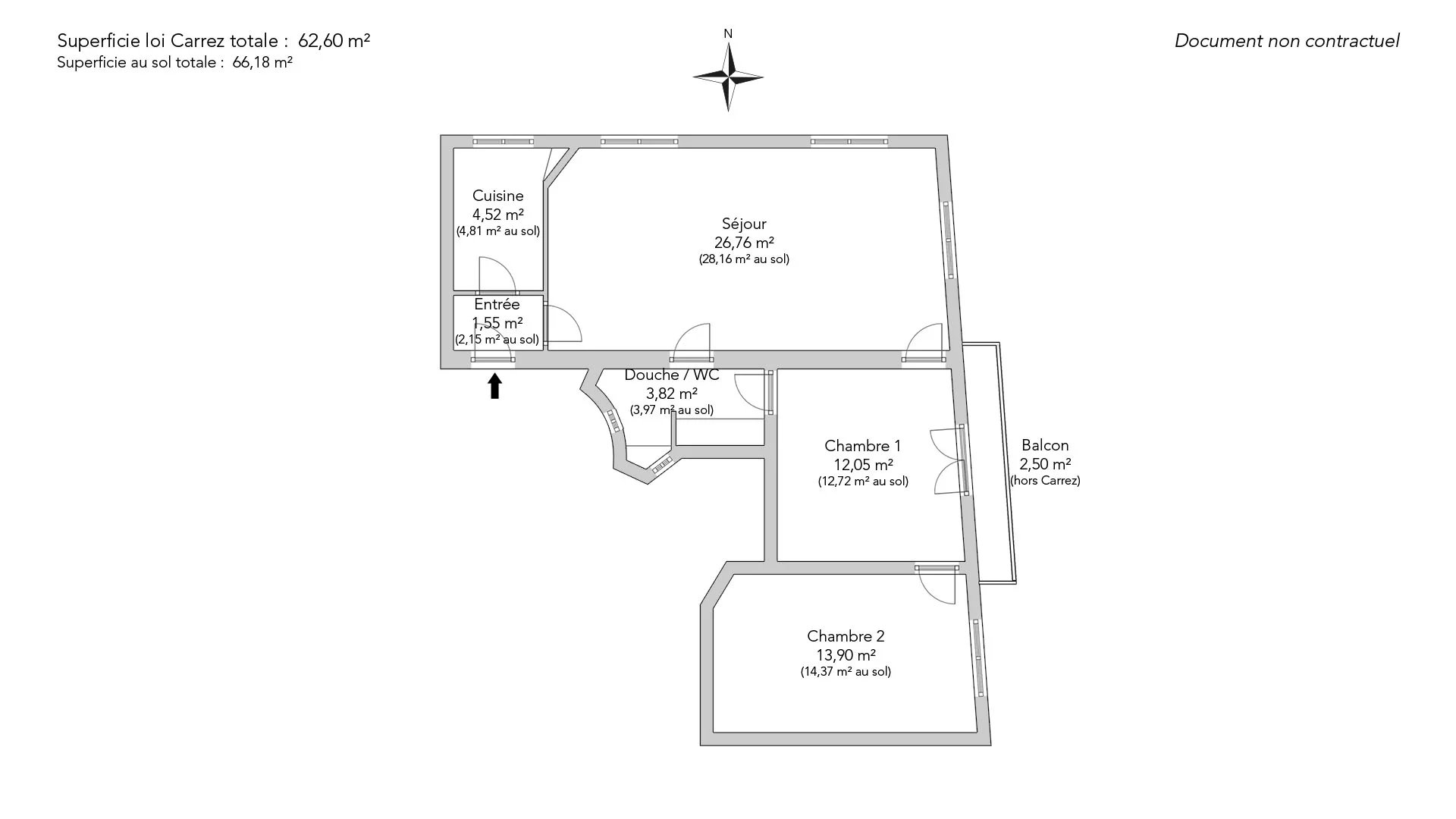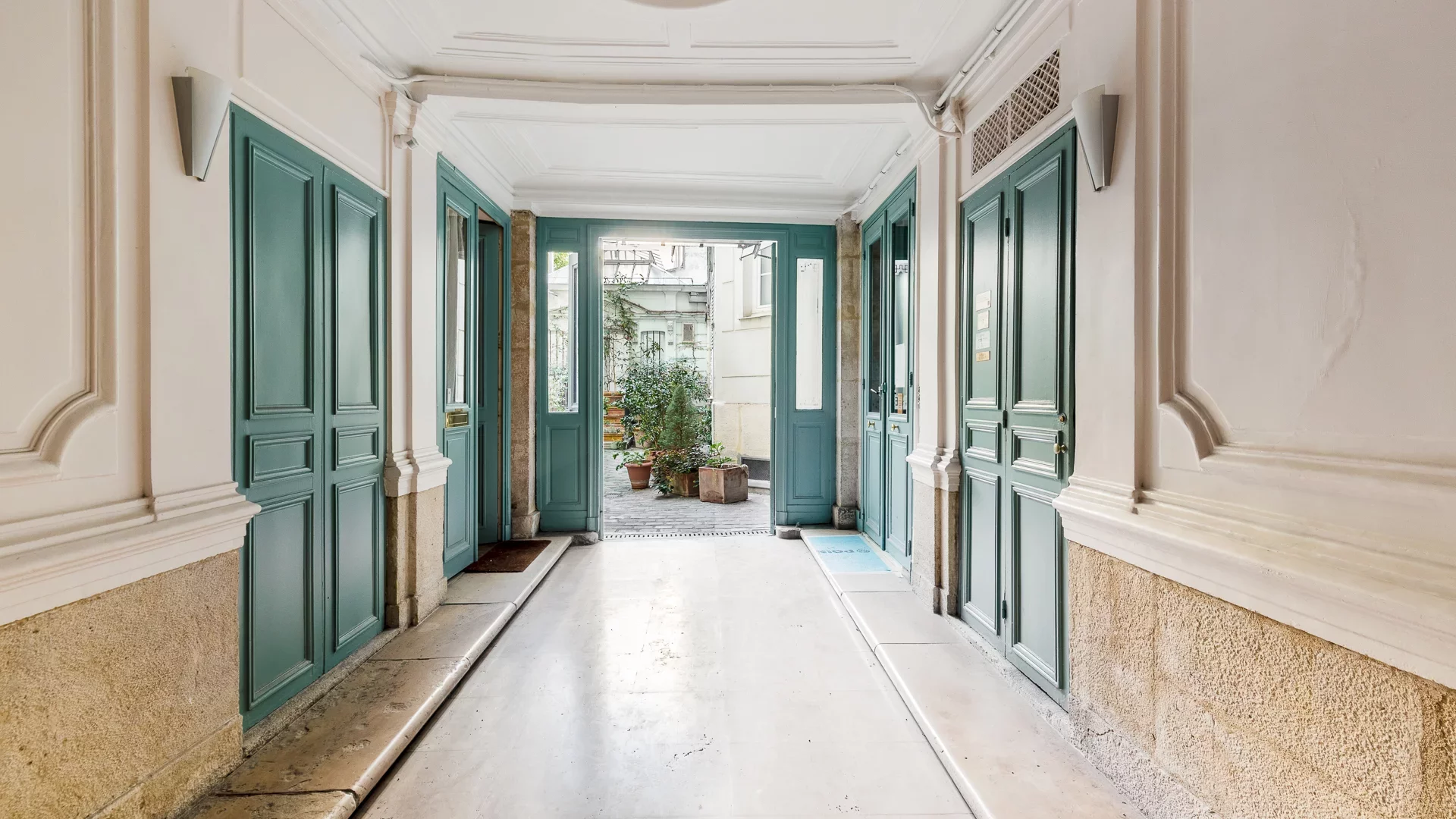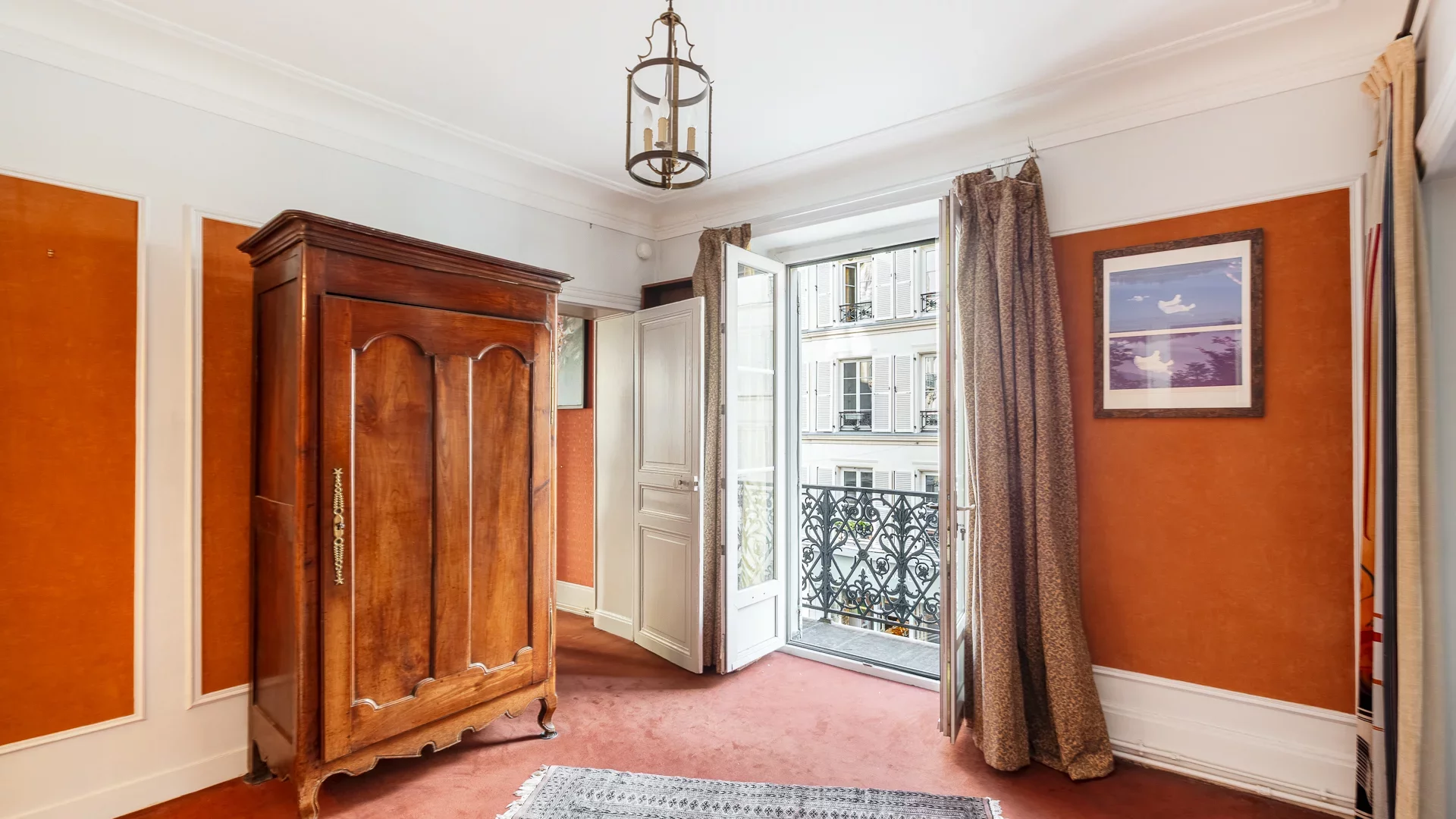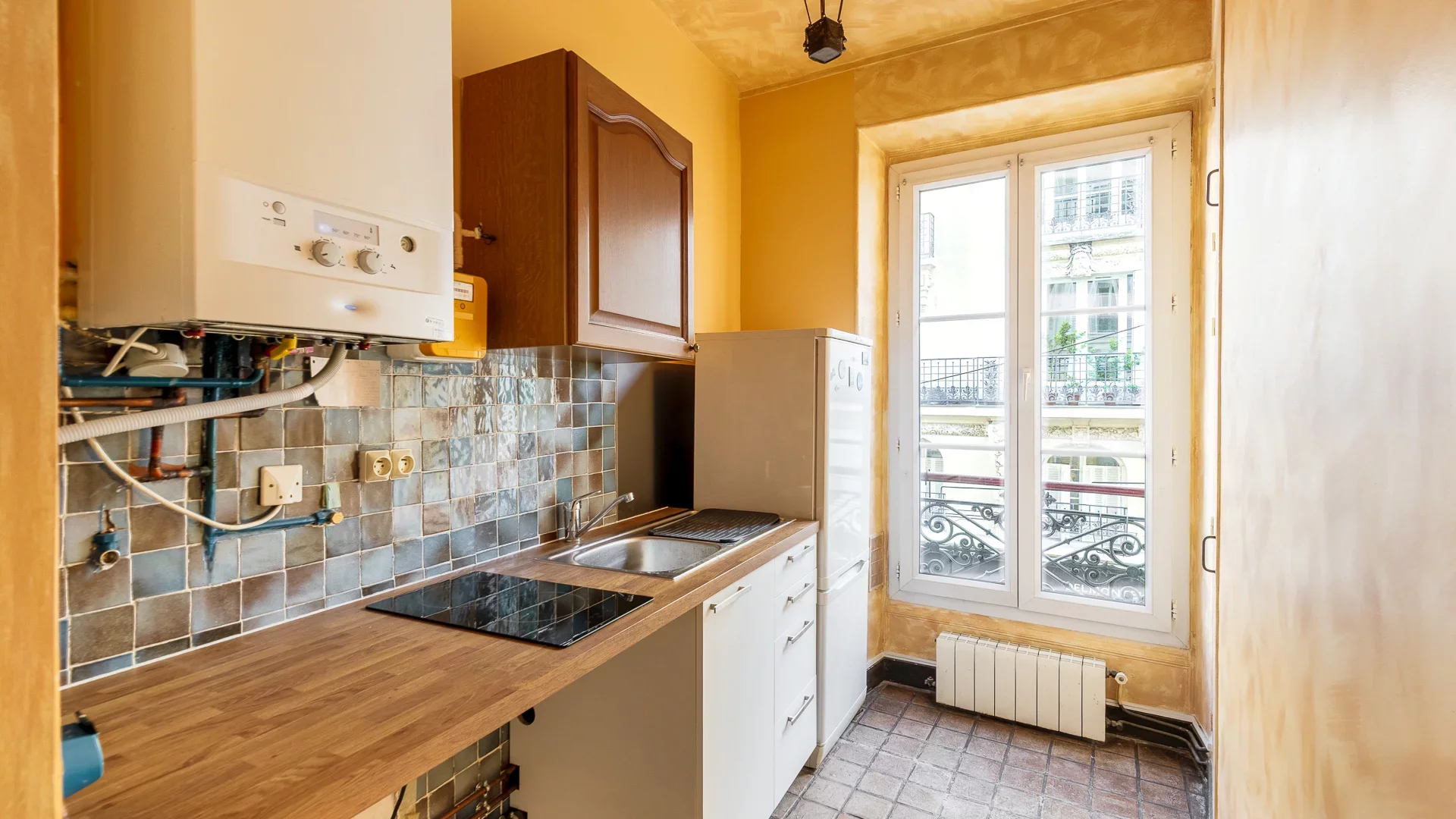 Le plan compact offre une entrée, un double séjour d'angle à la vue dégagée sur le haut de la rue des Martyrs, une cuisine indépendante (possibilité de l'ouvrir sur le séjour), deux chambres en enfilade dont une disposant d'un balcon et d'une salle de douche avec toilettes.