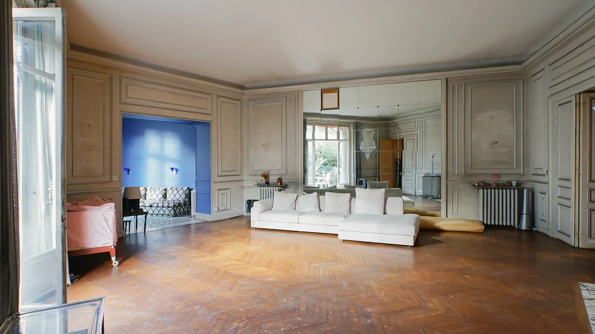 Coté réception, une vaste galerie d'entrée desservant une triple réception avec un séjour traversant offrant une petite vue Tour Eiffel donnant accès un balcon sur le jardin, un salon, une salle à manger, une cuisine indépendante (poss. cuisine US), un dressing et un toilette invité.