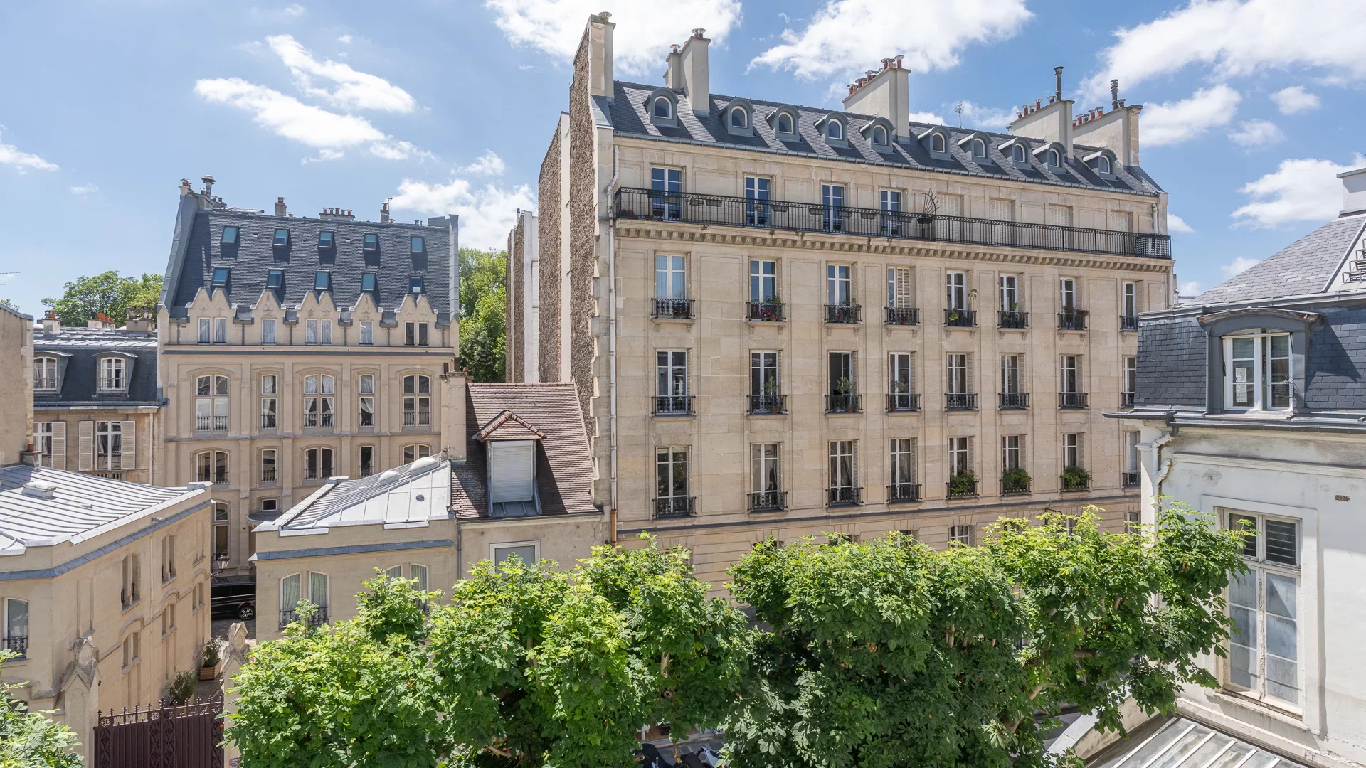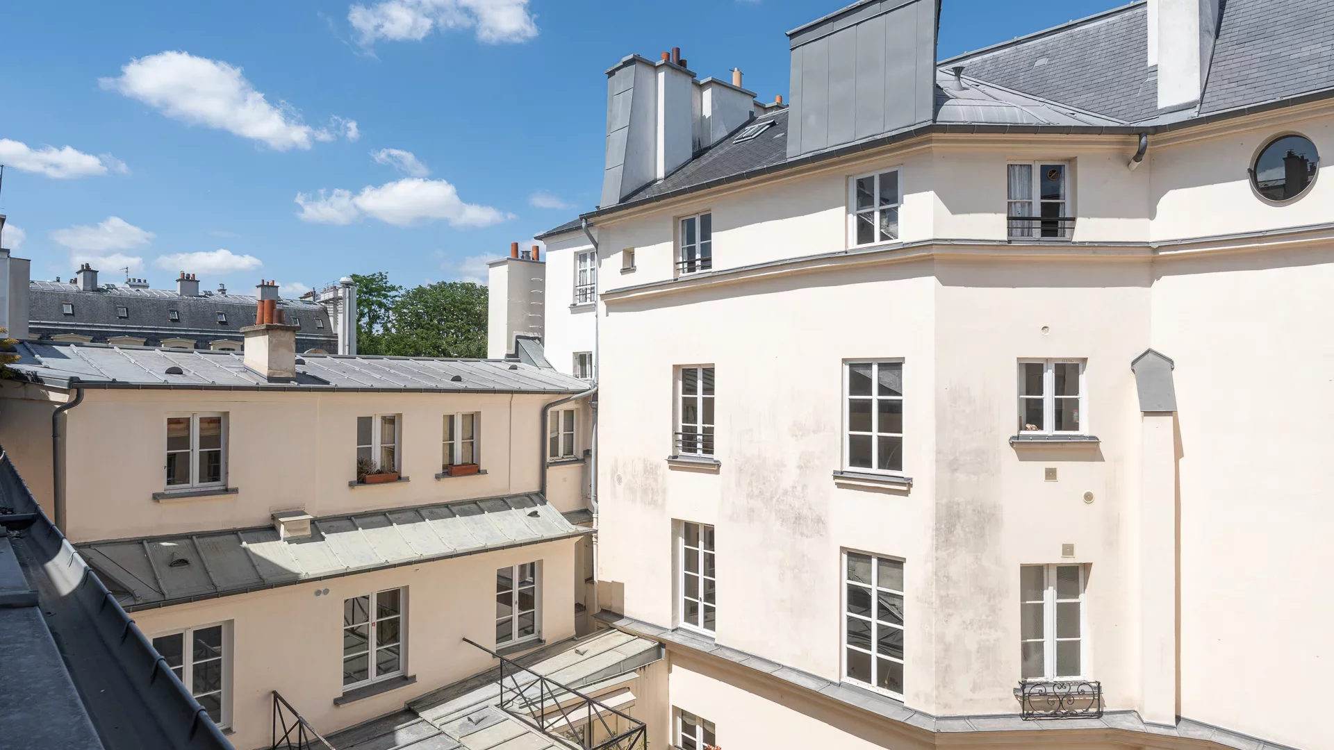 Le salon et trois chambres sont exposés plein sud avec une vue ciel, sur les cimes des arbres et les hôtels particuliers de la rue de l’Université.