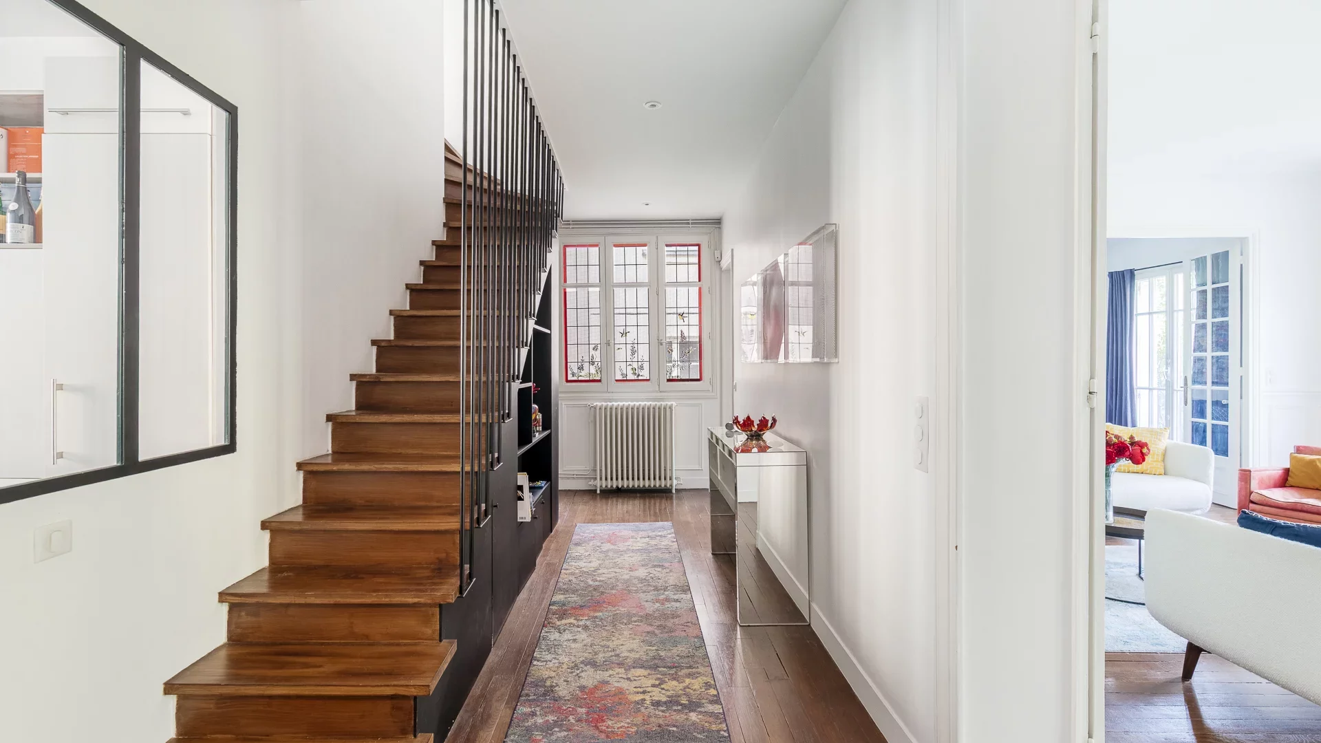 Situé aux quatrième et cinquième étages (derniers), ce duplex lumineux de 117,83m² loi Carrez conjugue charme de l’ancien et modularité contemporaine.