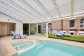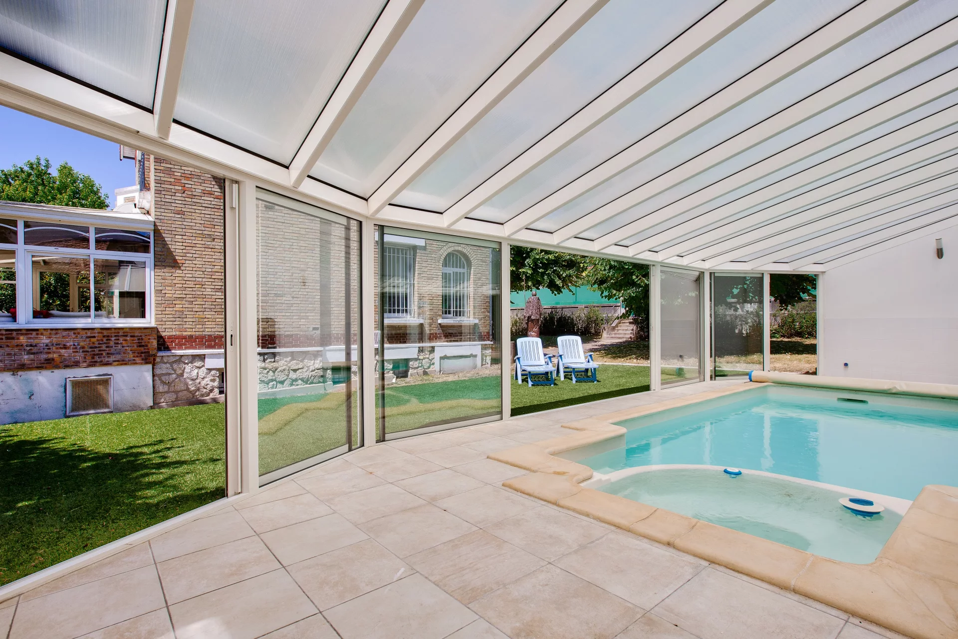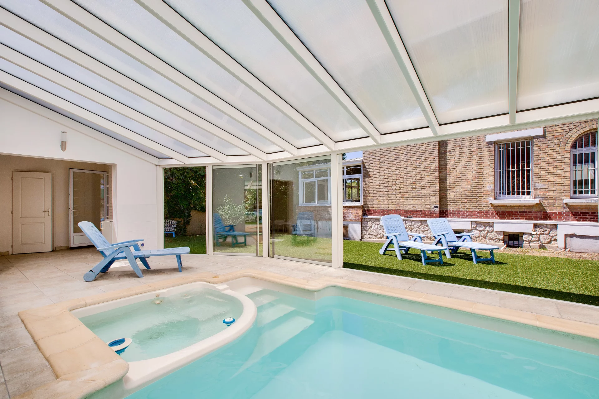 Le magnifique jardin, d'une confidentialité absolue, offre un cadre paisible et verdoyant, agrémenté d'une belle piscine avec jacuzzi sous verrière, créant ainsi un véritable havre de paix.