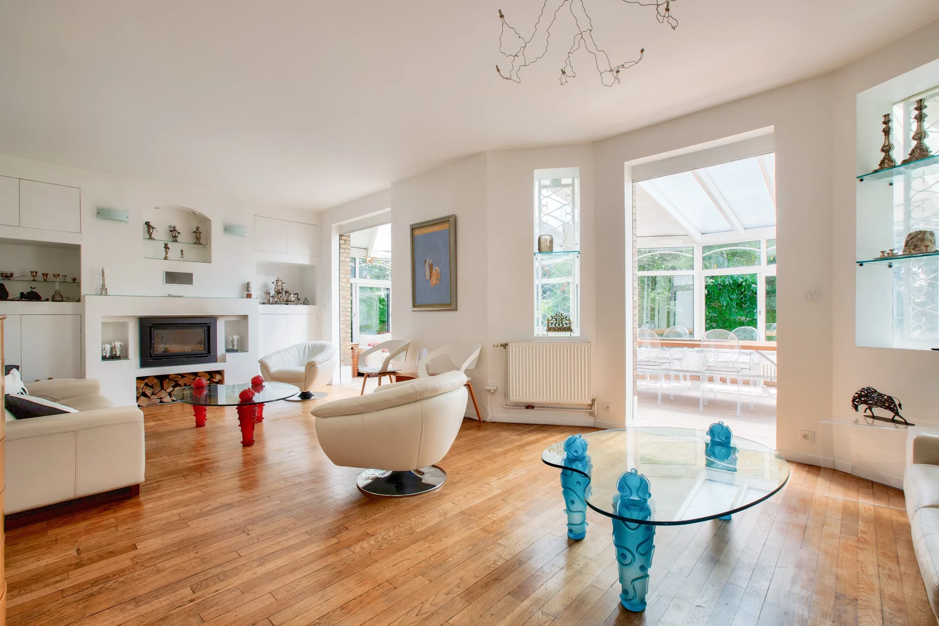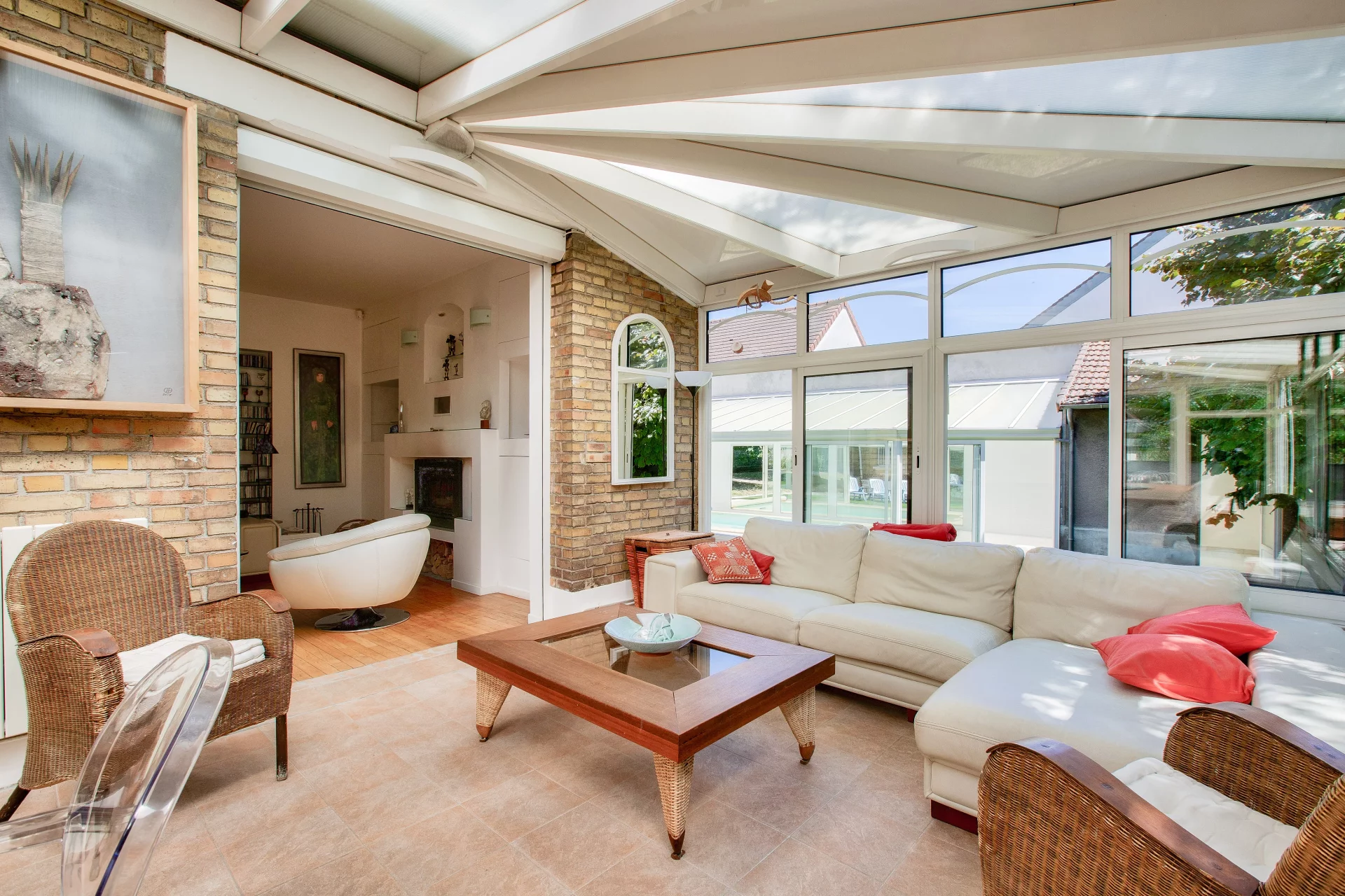 Au rez-de-chaussée l'entrée dessert, des toilettes, une vaste pièce de vie, baignée de lumière naturelle qui entre par les immenses baies de la véranda. Cette pièce de 79m², agrémentée d'une cheminée, intègre une cuisine ouverte et offre une vue panoramique sur le jardin et la piscine.