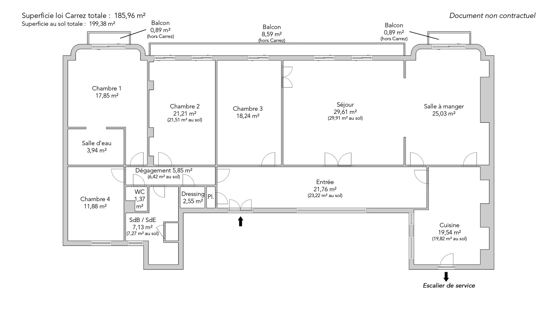 Le plan très fluide comporte une vaste galerie d’entrée qui mène à un superbe double séjour doté de grandes portes-fenêtres prolongé d’un balcon filant, une grande cuisine dînatoire attenante, trois belles chambres dont une suite avec salle de douche, un dressing (possibilité d'une quatrième chambre), une salle de bains et des toilettes séparées.