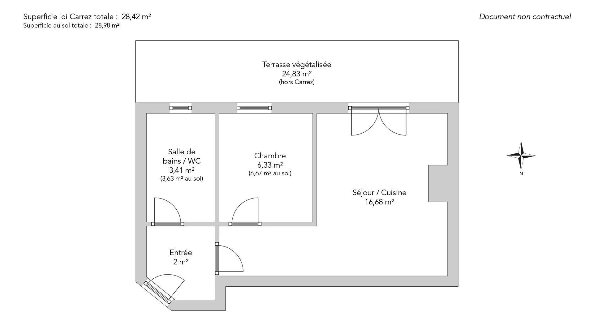 Le plan optimisé comporte une entrée, une salle de bains avec toilettes, une chambre, le séjour avec cuisine ouverte donnant accès à la terrasse végétalisée.