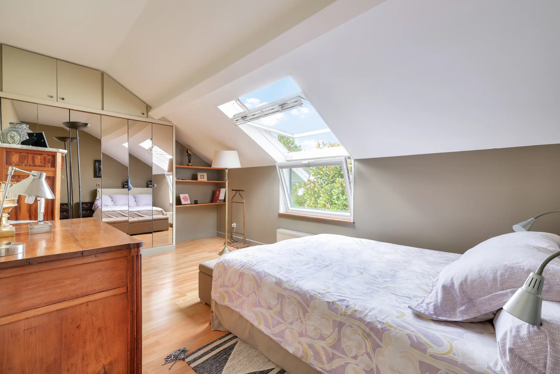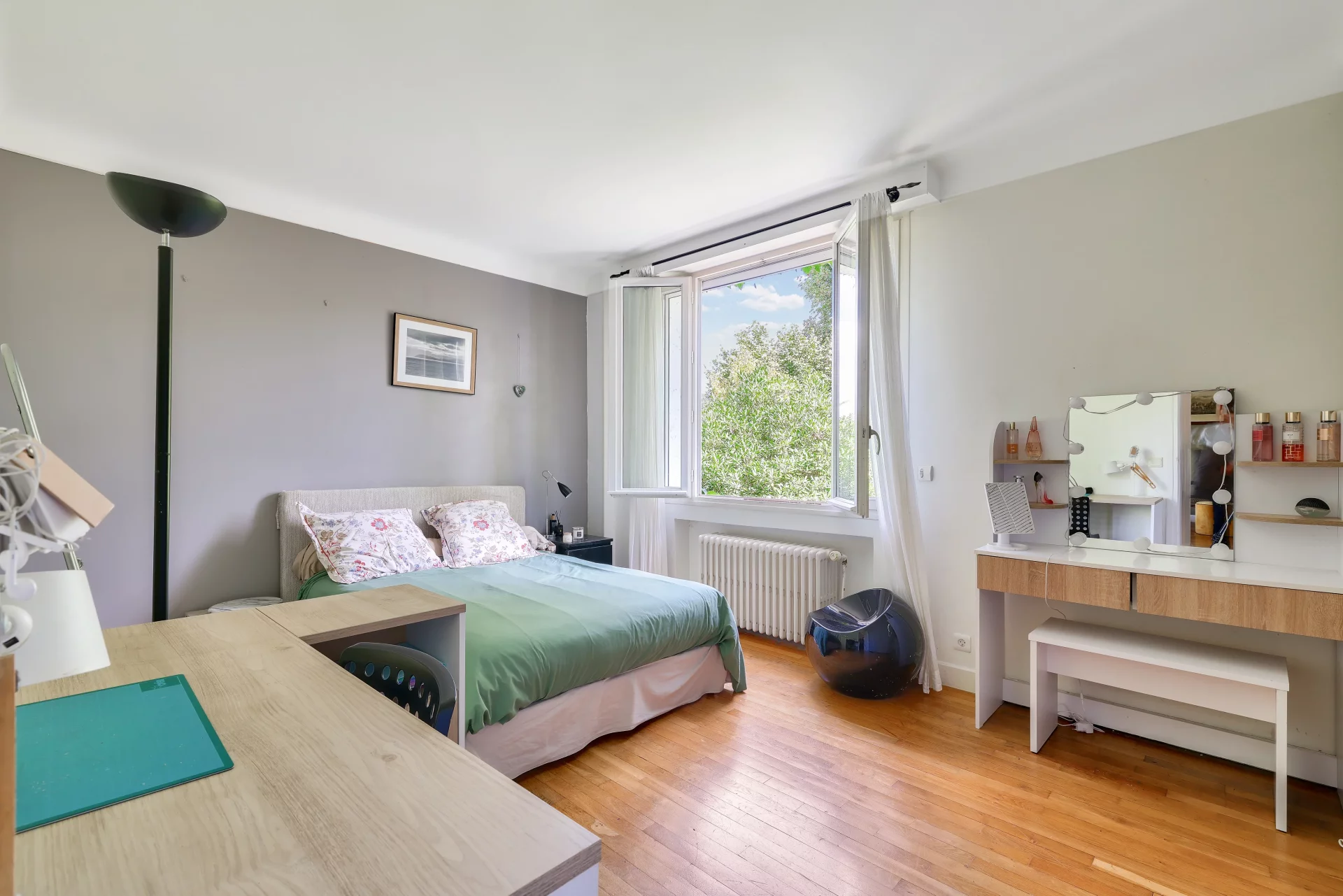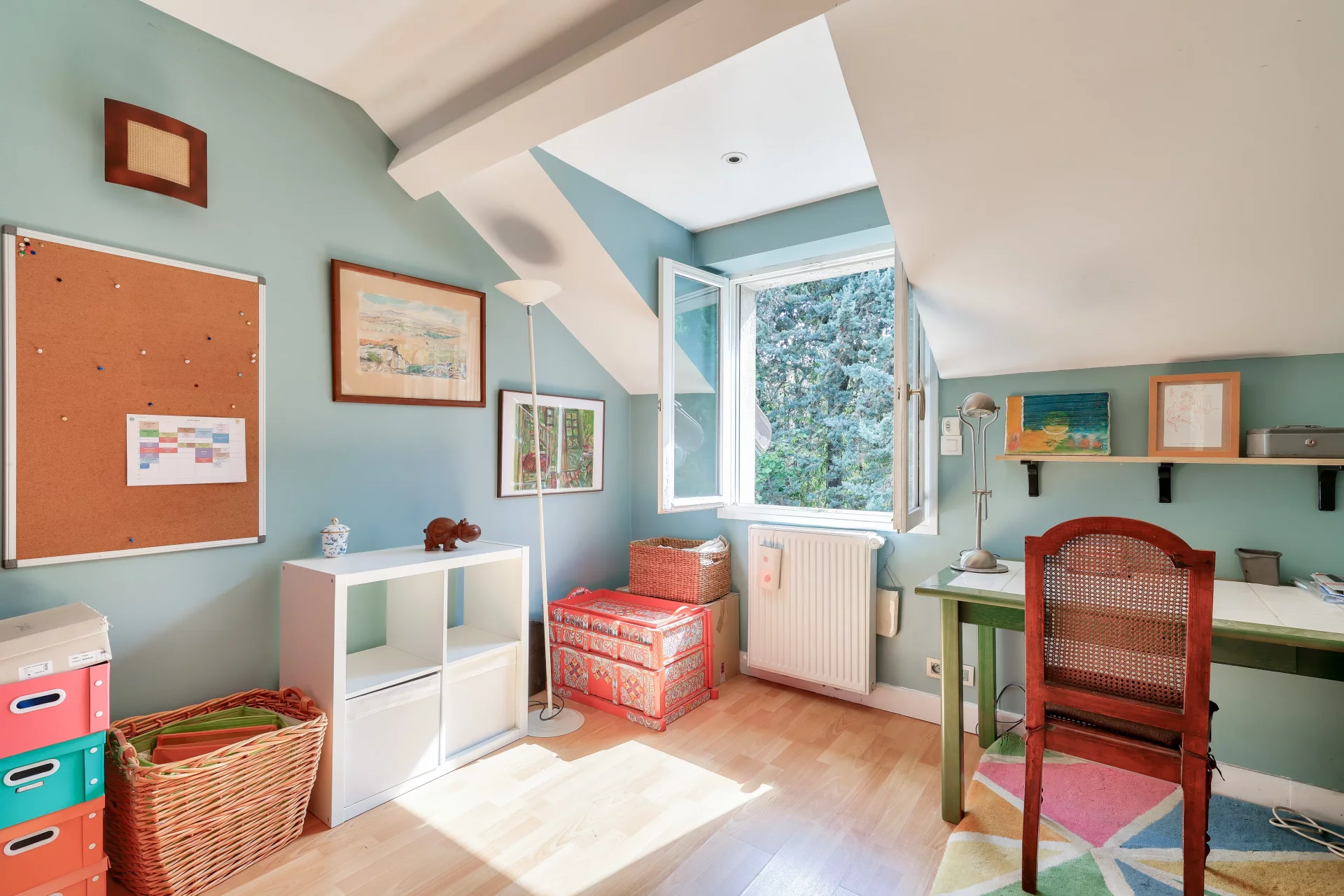 Au deuxième étage, vous découvrirez deux autres généreuses chambres, un bureau, un dressing ainsi qu’une salle de bains avec toilettes, offrant de beaux volumes et un aménagement fonctionnel.