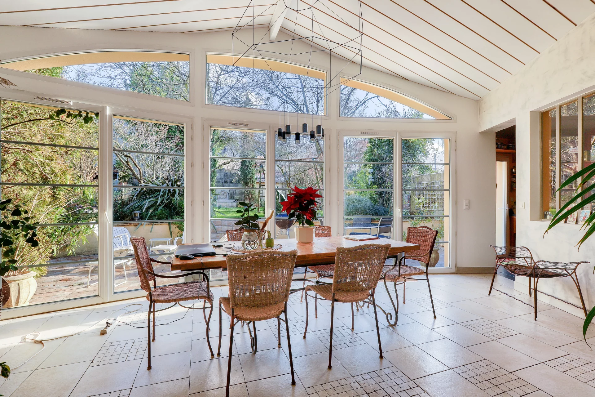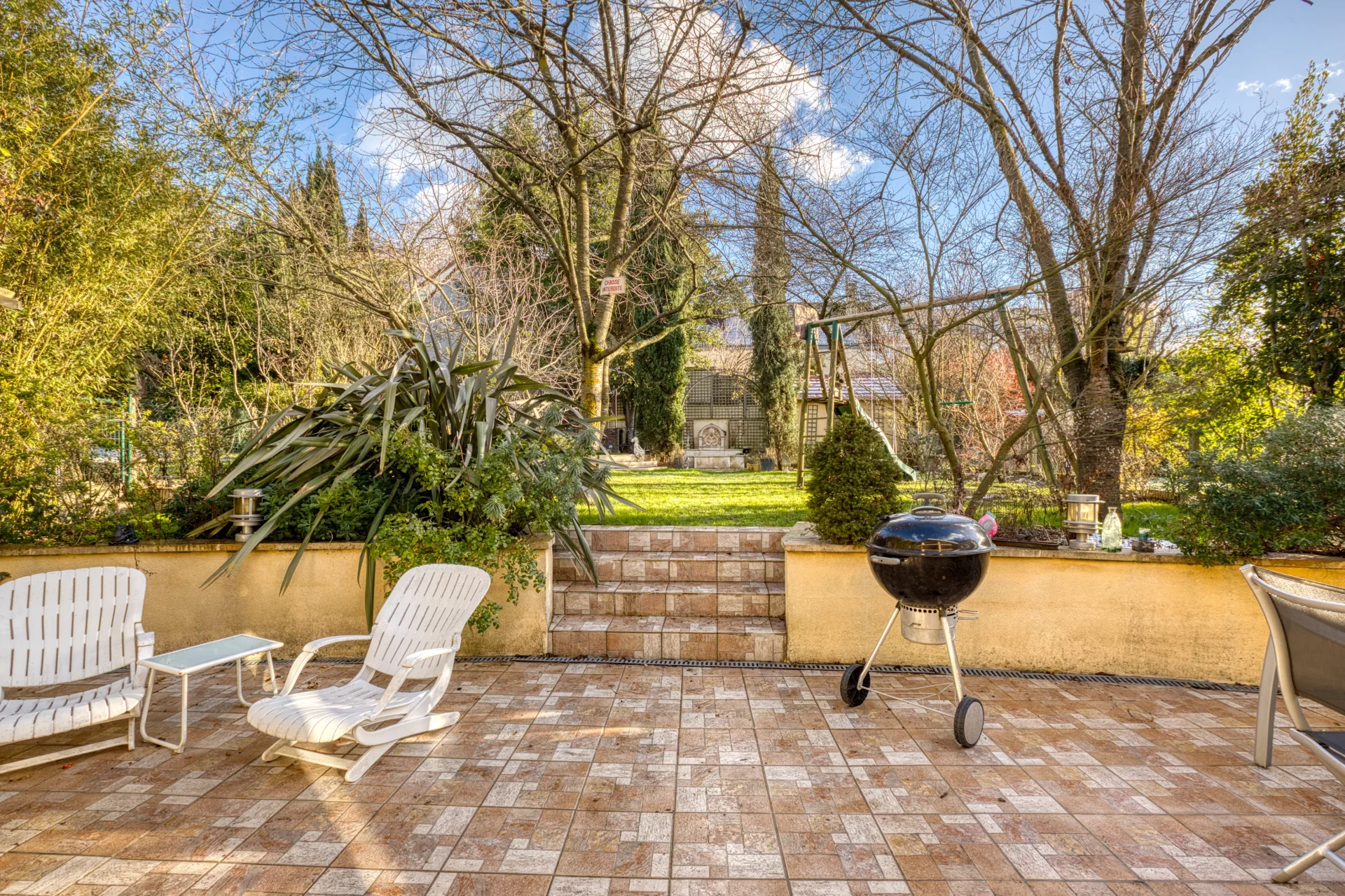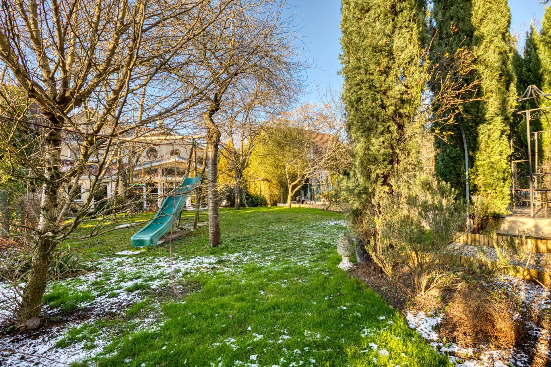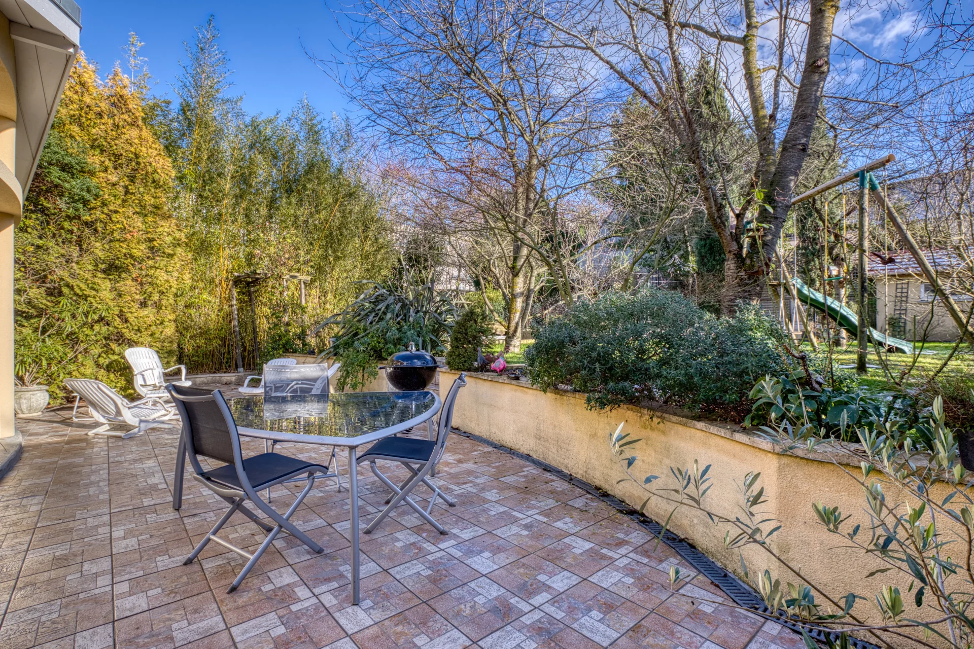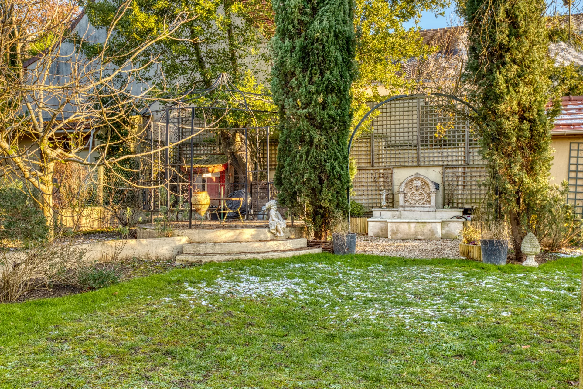La parcelle de 638 m² vous permettra de profiter d’un jardin arboré, à l'abri des regards, qui assure le rafraîchissement naturel de la maison l’été et bénéficie d’un système d’arrosage centralisé. Un kiosque de détente avec bassin, une fontaine et une volière complètent le côté bucolique.