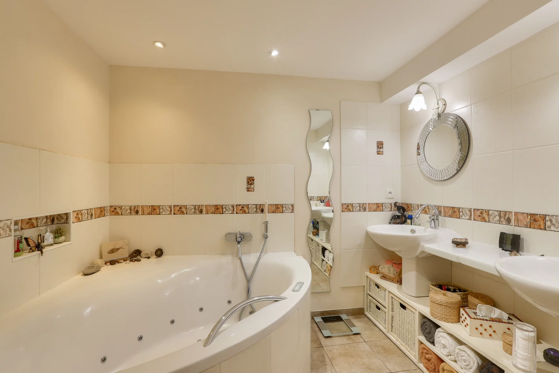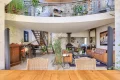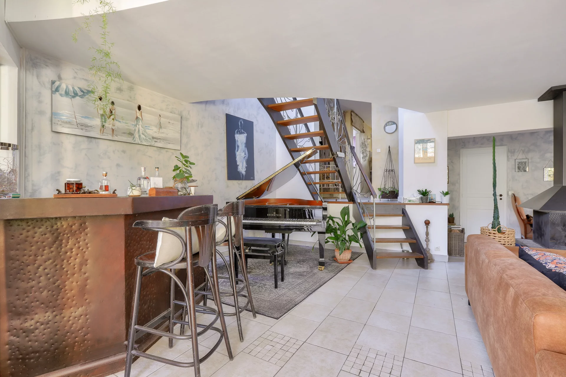 Surplombant le séjour, une mezzanine toute en courbes ainsi qu’un salon vidéo séparé par des verrières, constituent d’agréables espaces de détente ou de travail.