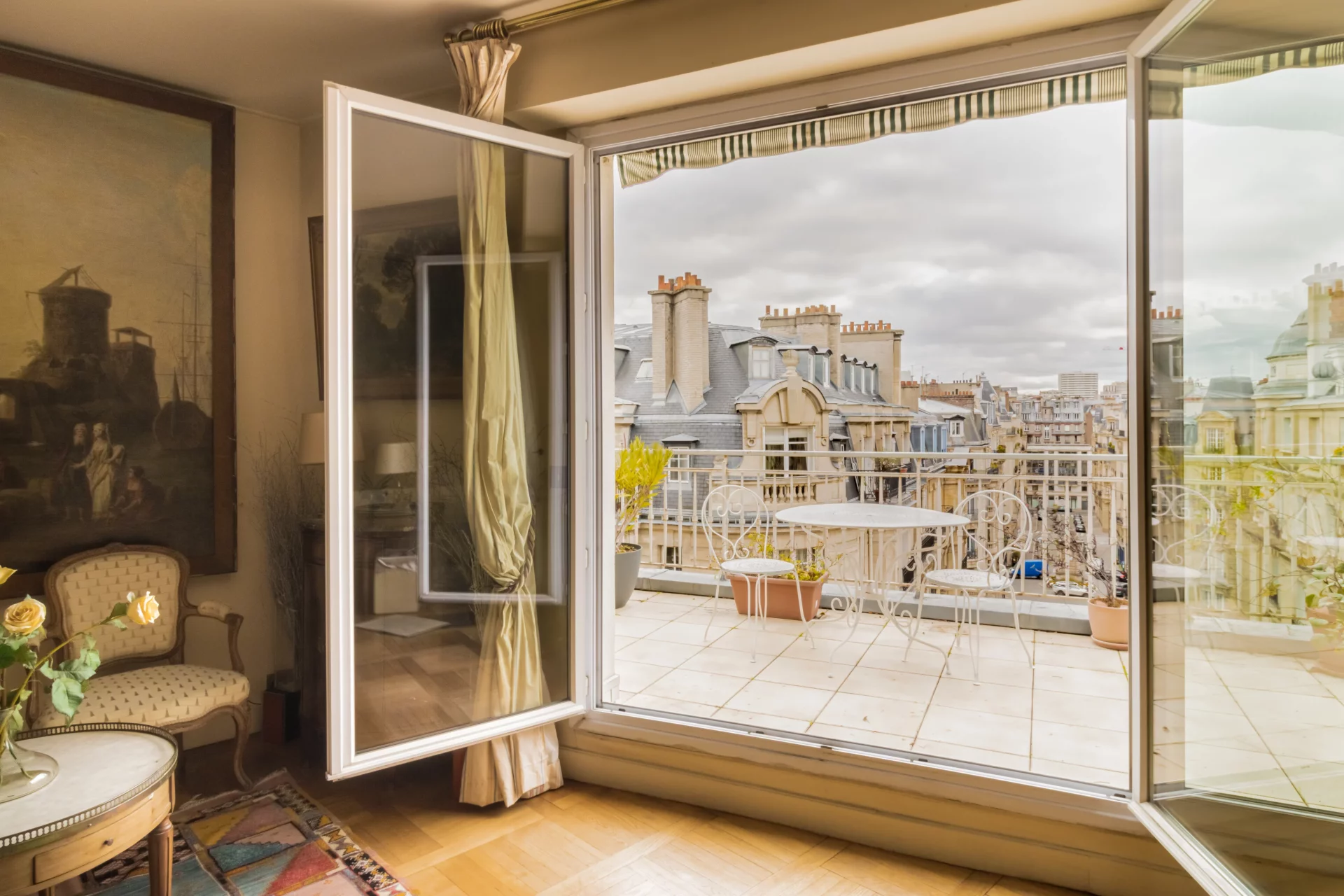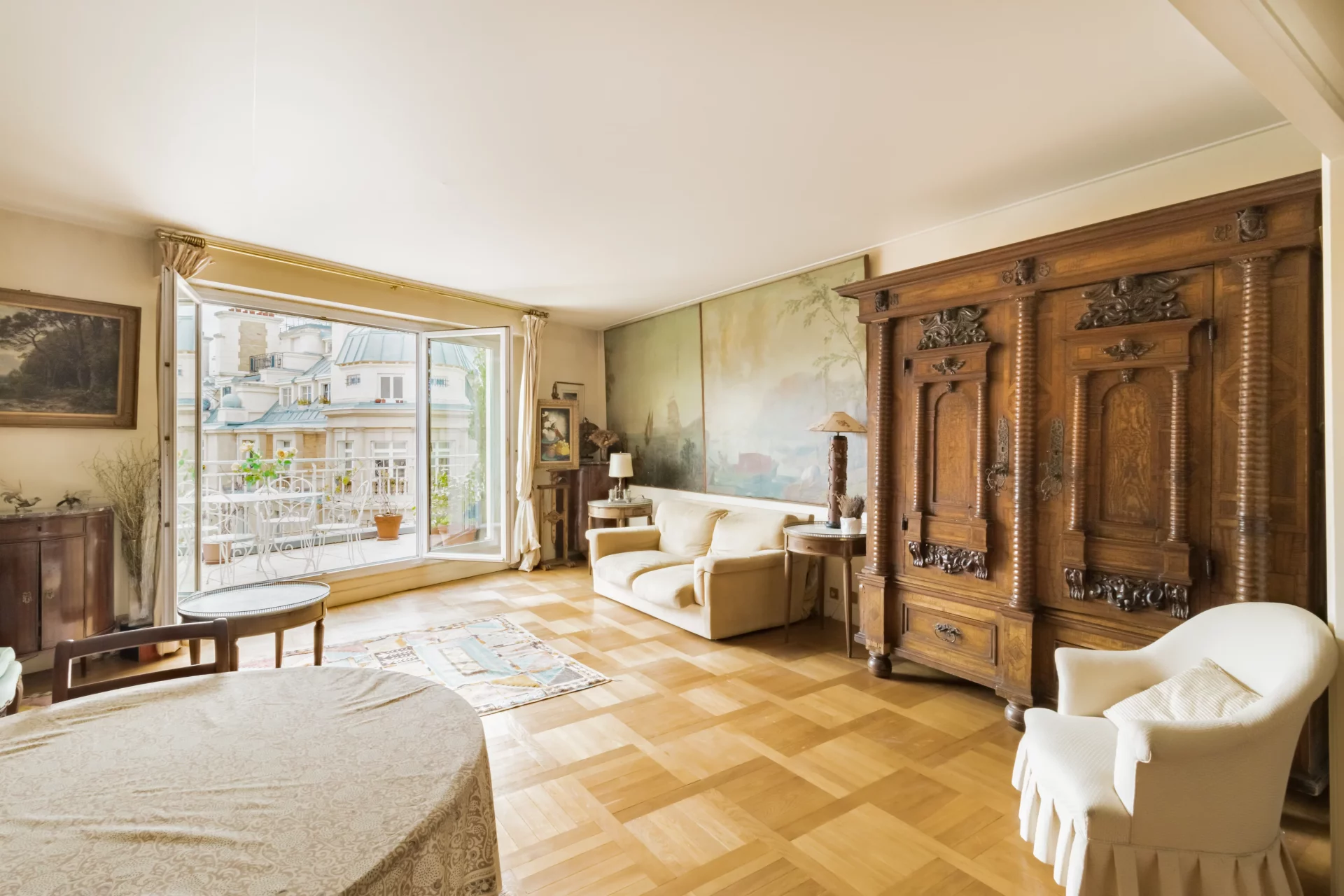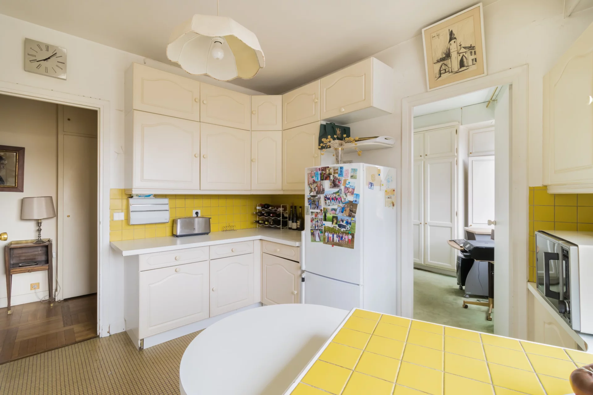 L’appartement propose l’agencement suivant : une galerie d’entrée, une grande cuisine dînatoire donnant sur la terrasse, avec à sa suite une pièce d’environ 10m² alimentée en eau et pouvant faire office de chambre d’appoint, de bureau ou de buanderie. La galerie d'entrée ouvre sur le séjour et la terrasse. Dans la partie nuit nous avons deux belles chambres, l'une sur cour avec une vue Tour Eiffel, l’autre côté terrasse. Une salle de douche avec vasque. Une toilette séparée.