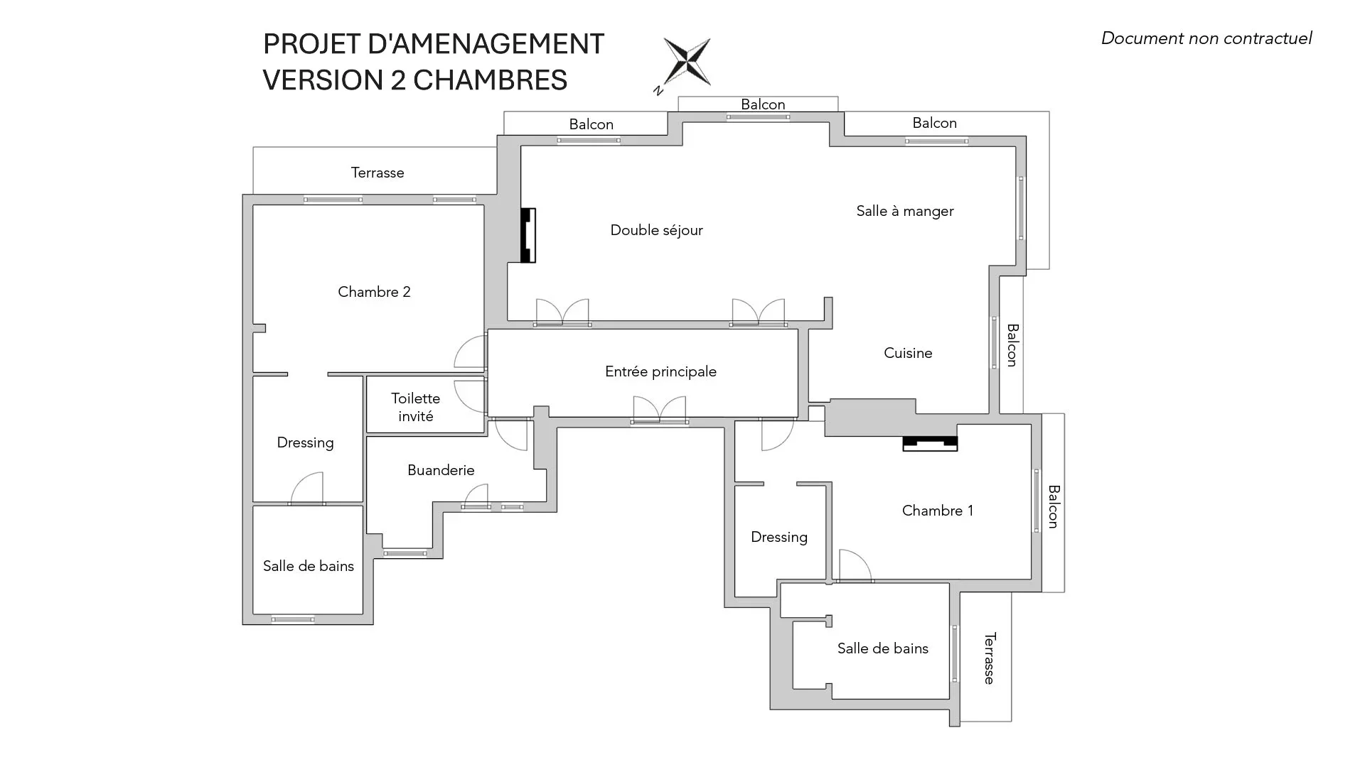 Le plan modulable comprend une entrée, une triple pièce de réception en angle avec des balconnets, une cuisine indépendante, un espace master avec sa salle de bains et ses espaces de rangement, deux chambres supplémentaires (possible trois), une salle de bains et des toilettes indépendants.