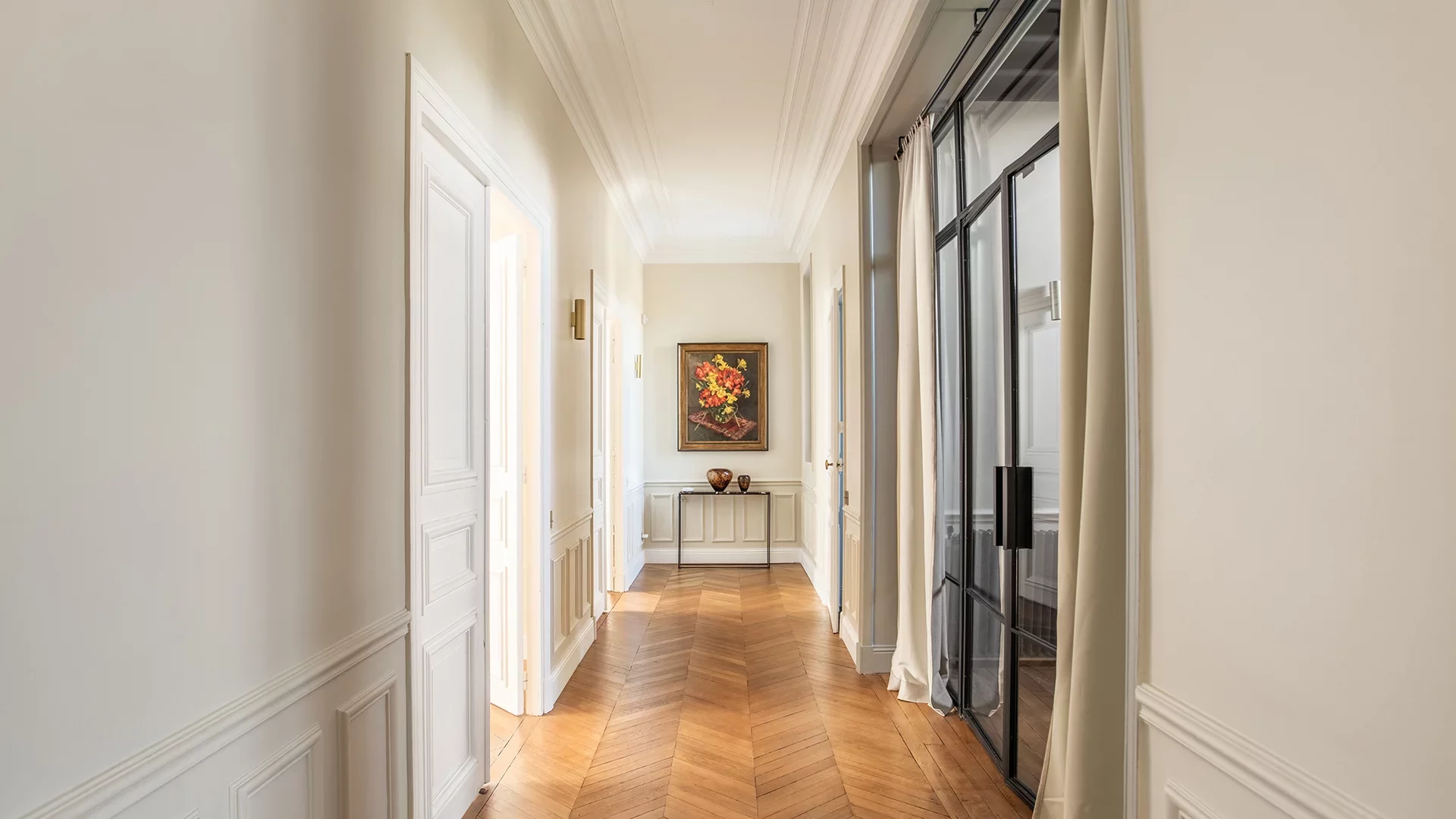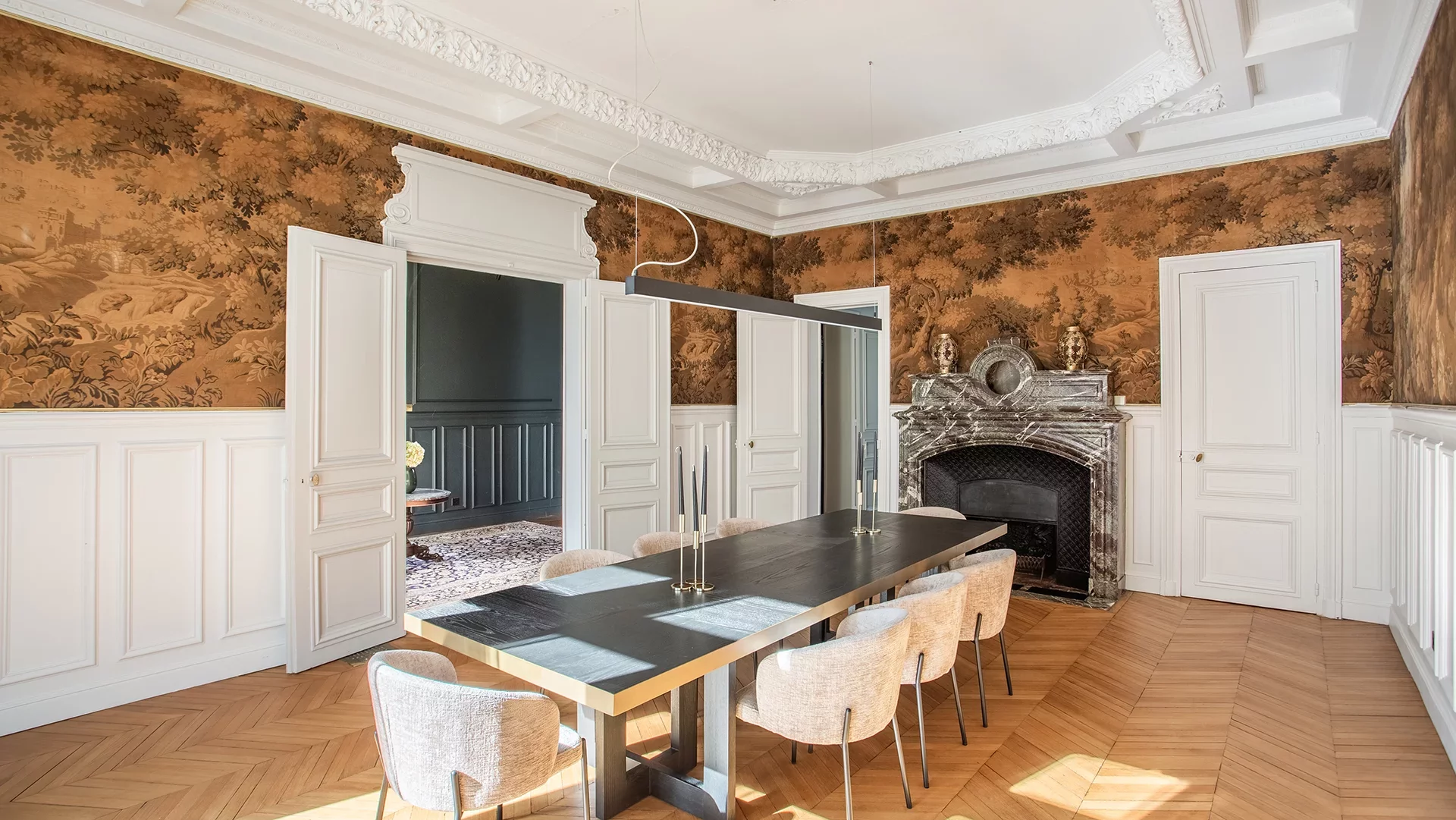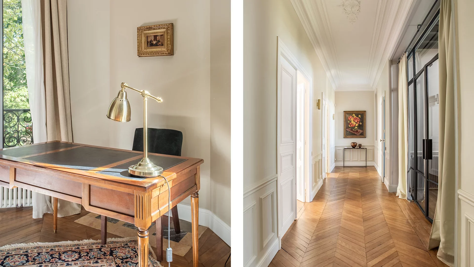 Dès l’entrée, le ton est donné : un vestibule d’apparat, orné de boiseries raffinées, d’un plafond à caissons décorés et d’un parquet en point de Hongrie, distribue de superbes pièces de réception baignées de lumière.