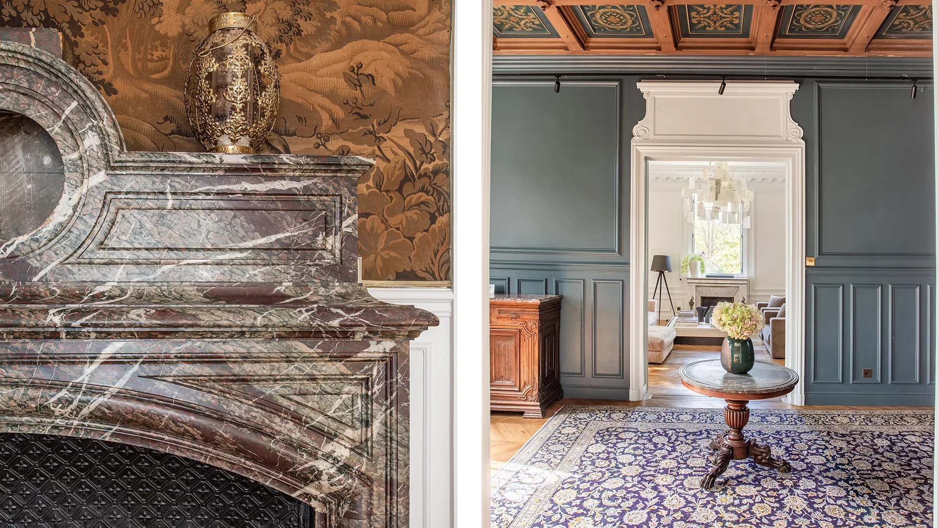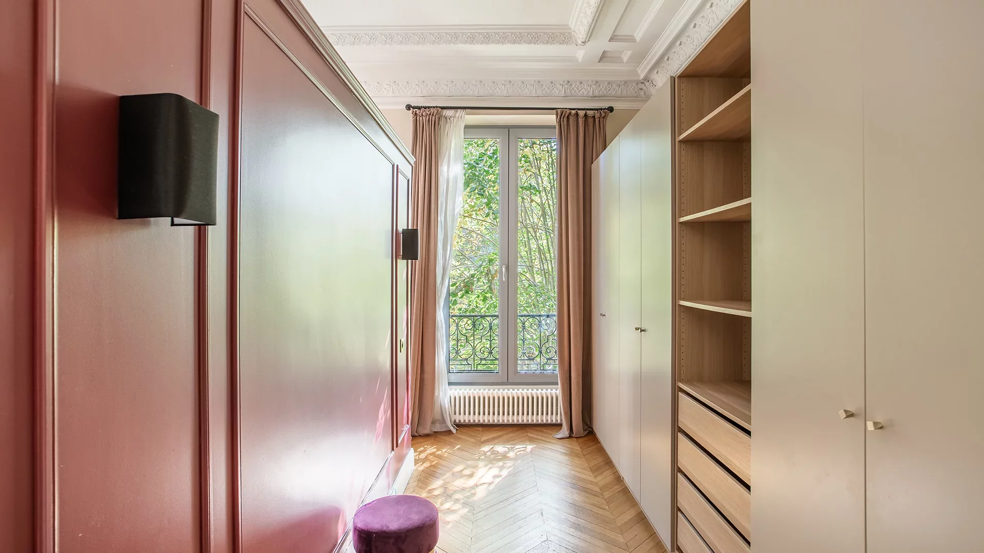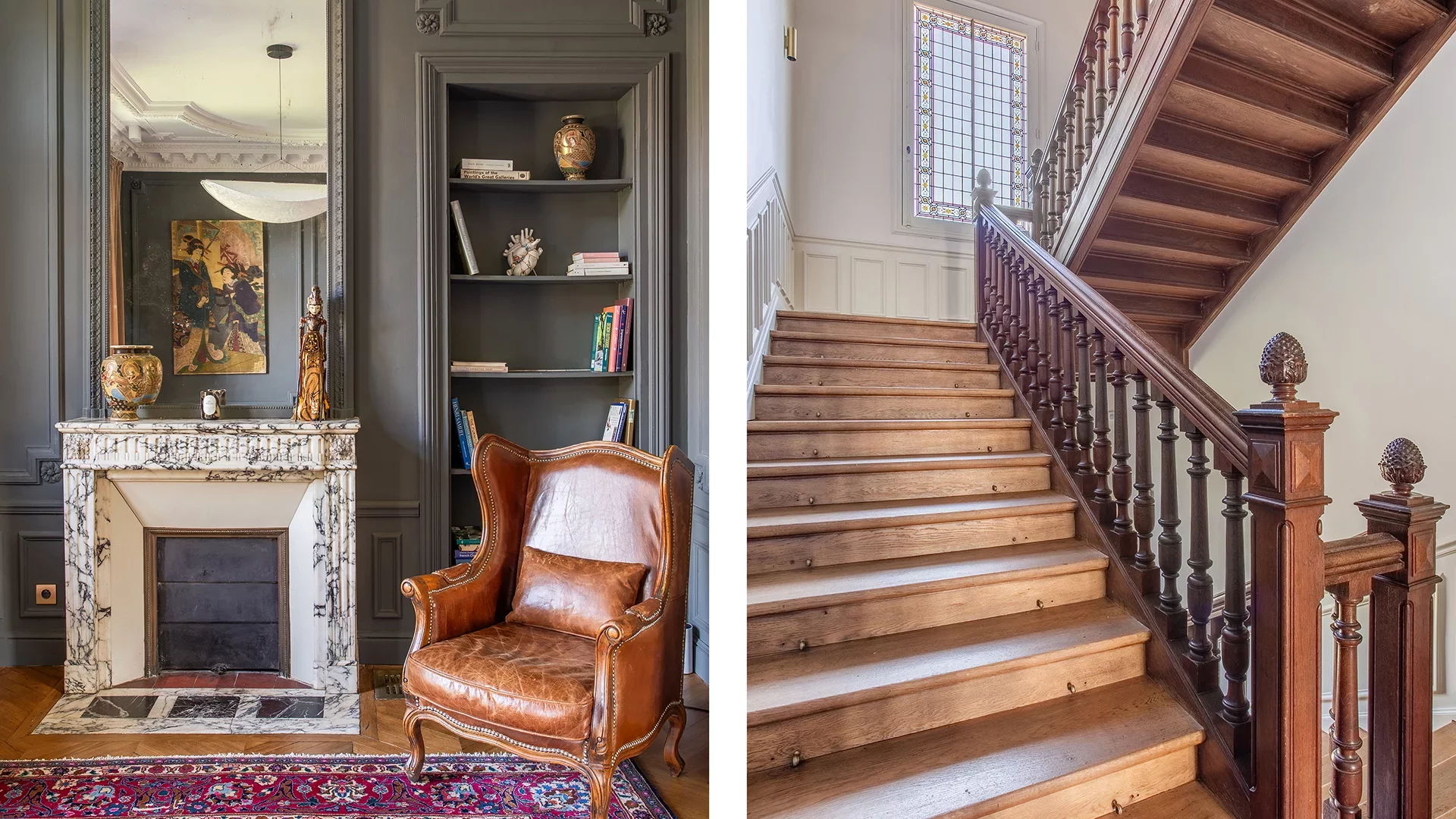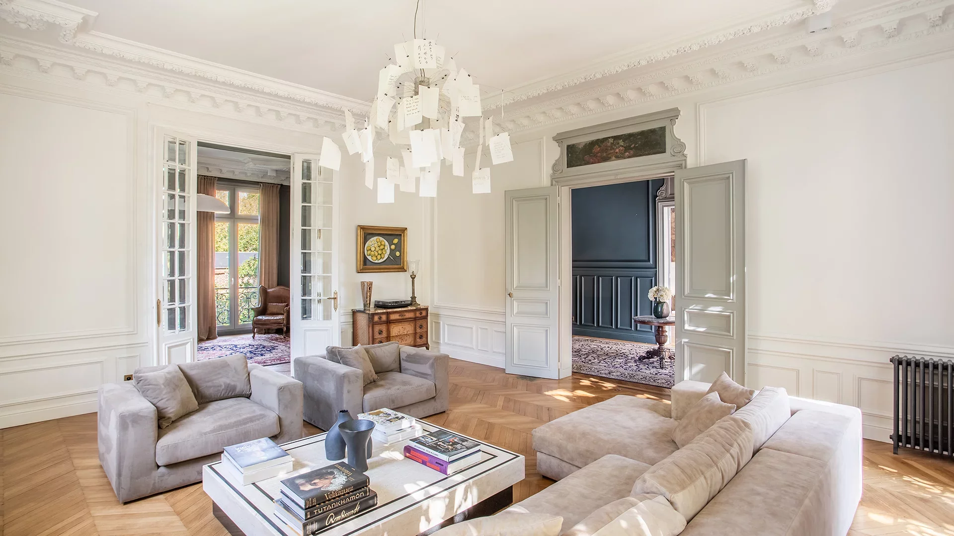 Dès l’entrée, le ton est donné : un vestibule d’apparat, orné de boiseries raffinées, d’un plafond à caissons décorés et d’un parquet en point de Hongrie, distribue de superbes pièces de réception baignées de lumière.
