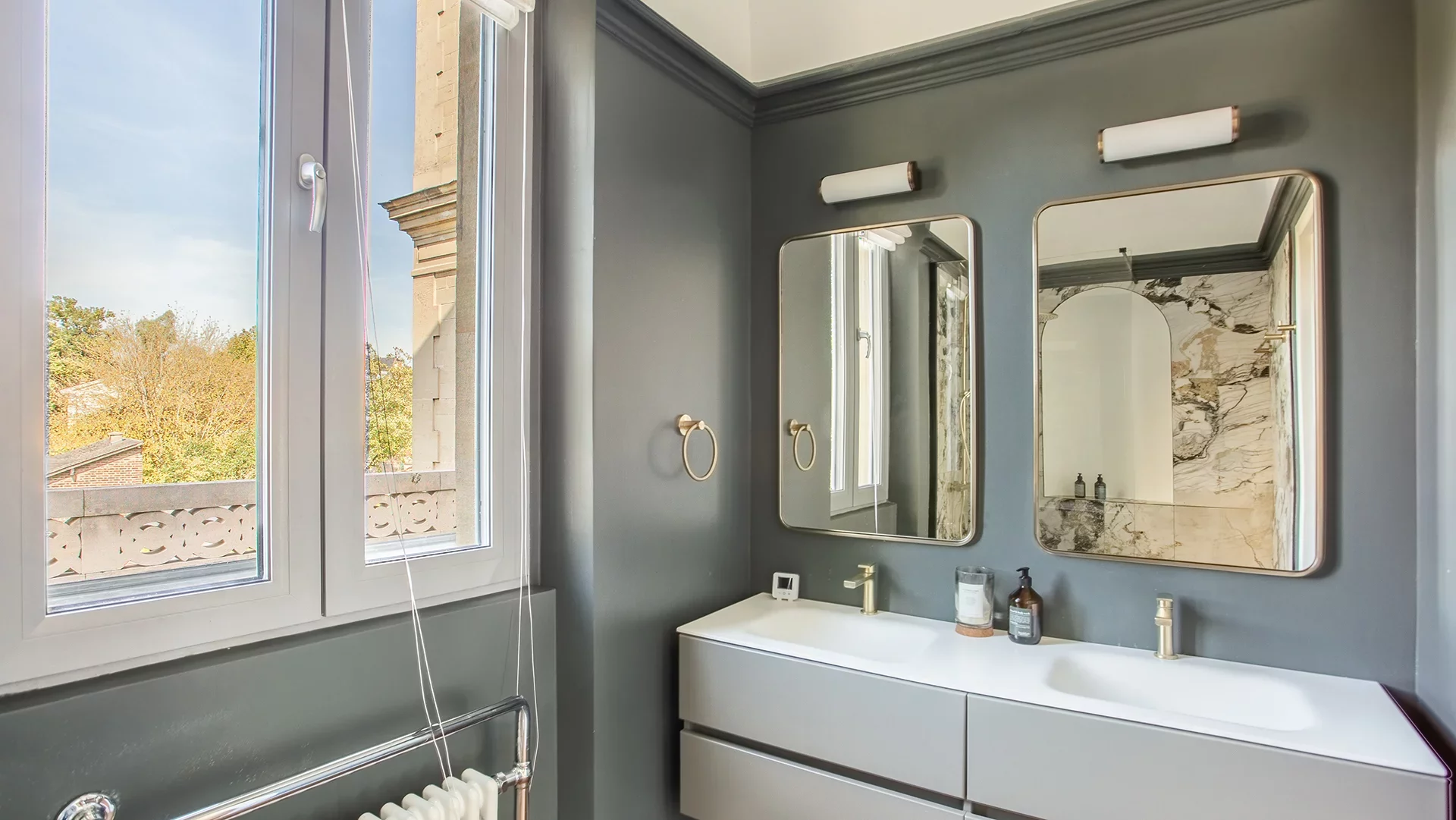 Le rez-de-chaussée comprend un double séjour, un salon de réception, une salle à manger élégante, tous agrémentés de cheminées d’origine, ainsi qu’une cuisine indépendante et parfaitement équipée. Des toilettes invités complètent ce niveau.