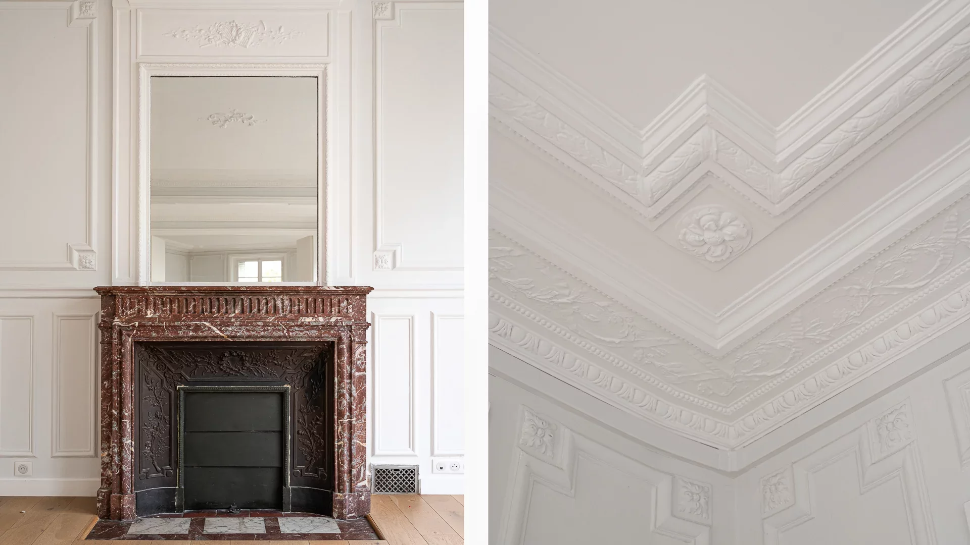 Il s’ouvre sur une vaste galerie d’entrée qui distribue une triple réception d’angle bordée d'un balcon filant et baignée de lumière, aux beaux volumes et aux éléments d’époque préservés — moulures et cheminées. La grande cuisine indépendante et les toilettes invités complètent la partie réception.