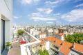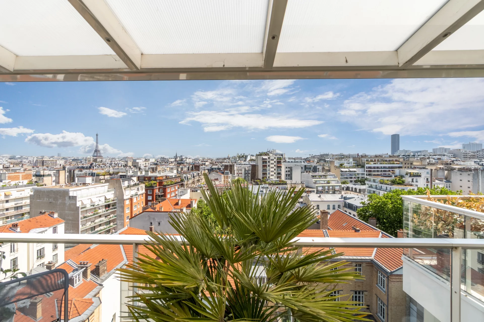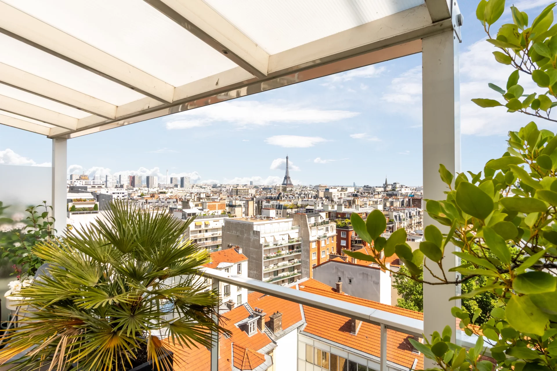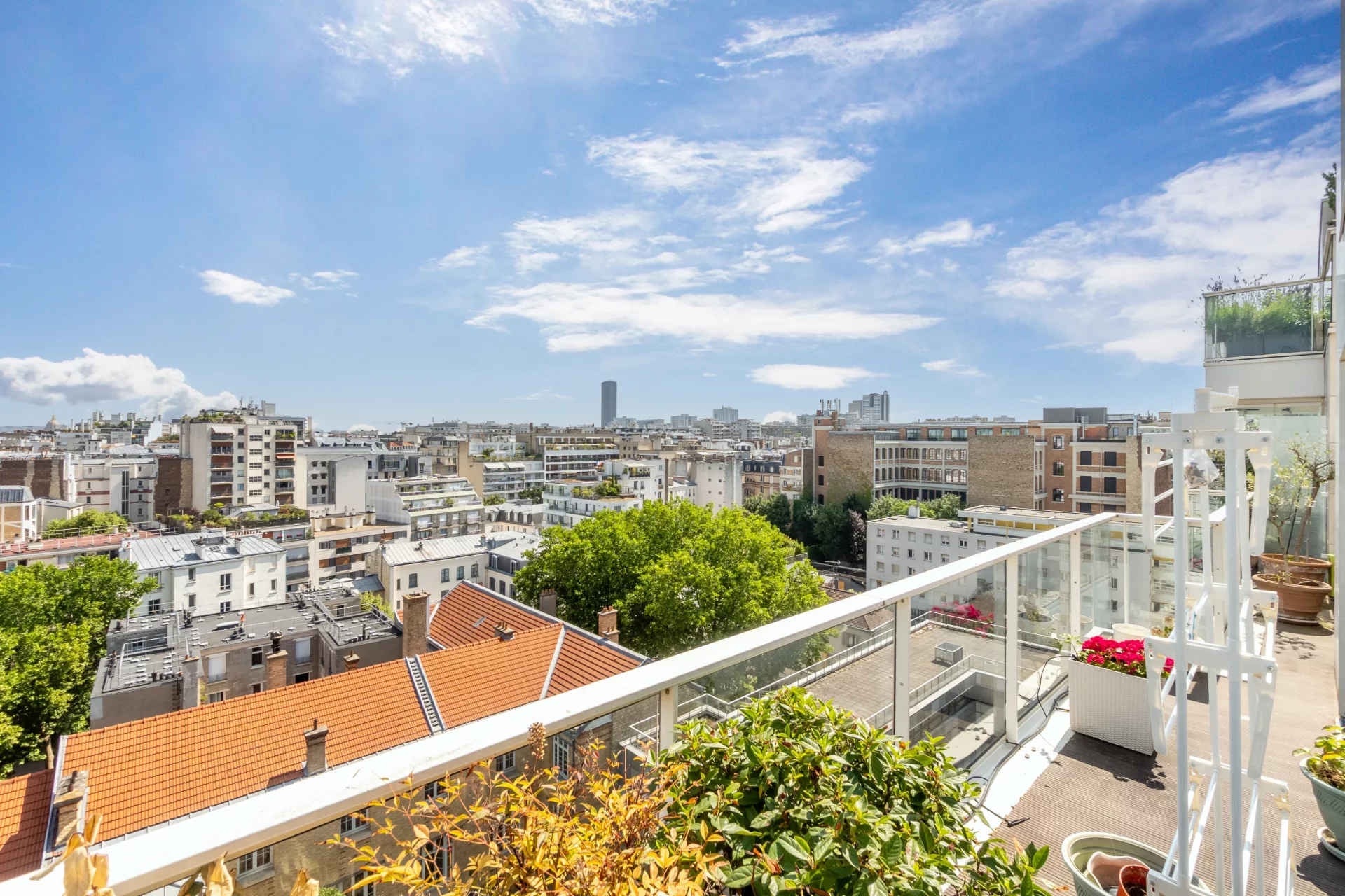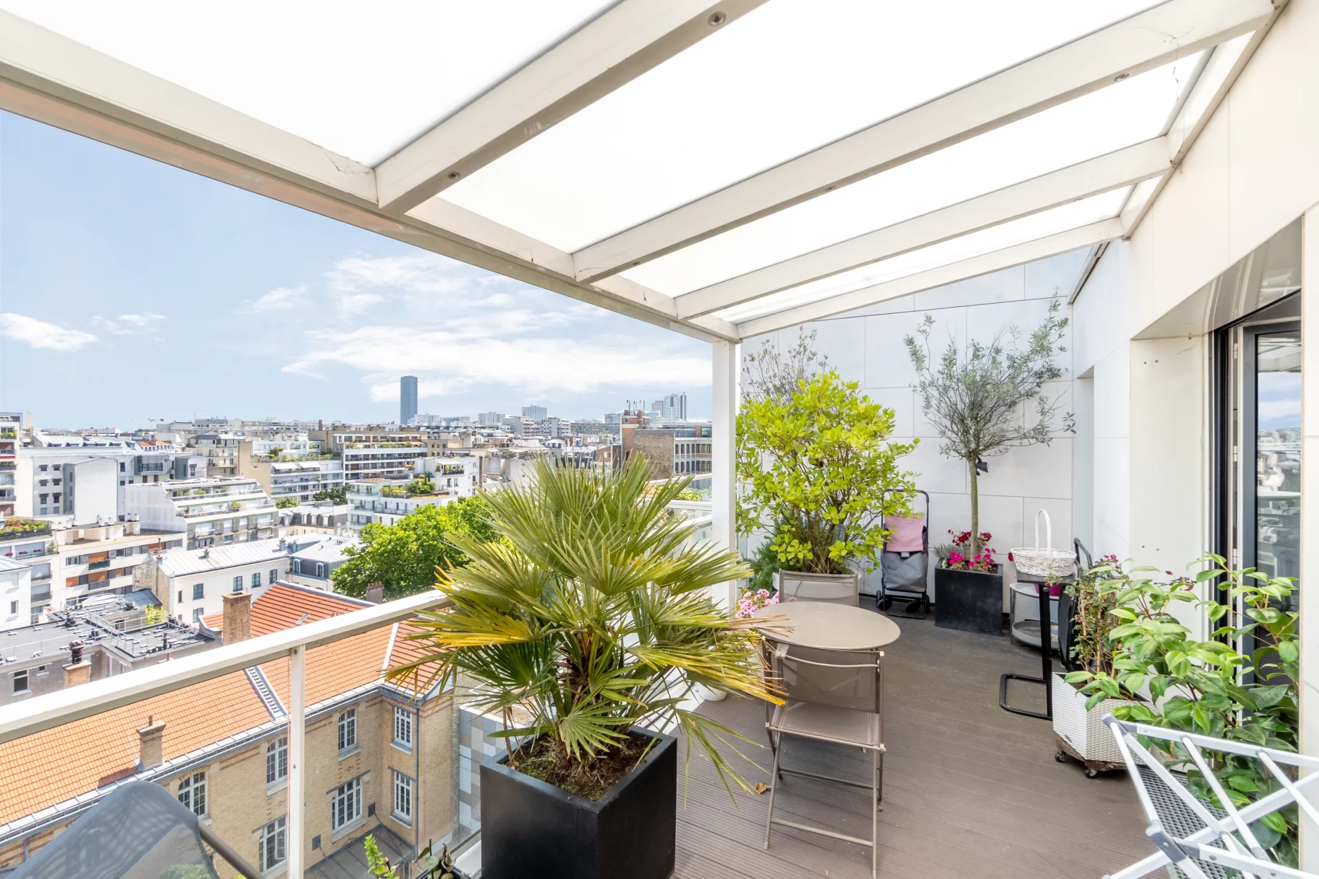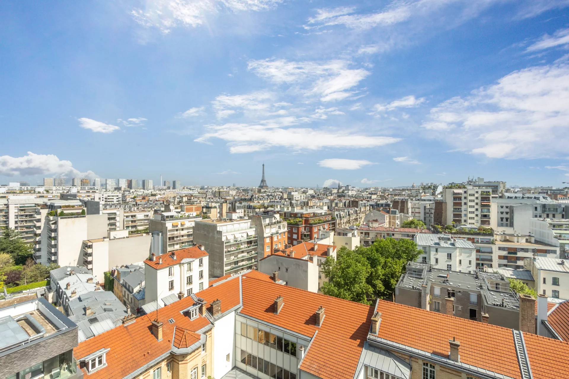 Au septième étage, la réception comprend un séjour et une cuisine américaine équipée. Une chambre avec sa salle d’eau et ses toilettes. L’ensemble s’ouvre de plain-pied sur une grande terrasse de 28m² offrant de sublimes vues sur quelques monuments emblématiques tels que la tour Eiffel, le Sacré-Cœur, l’Arc de Triomphe ou encore les Invalides.