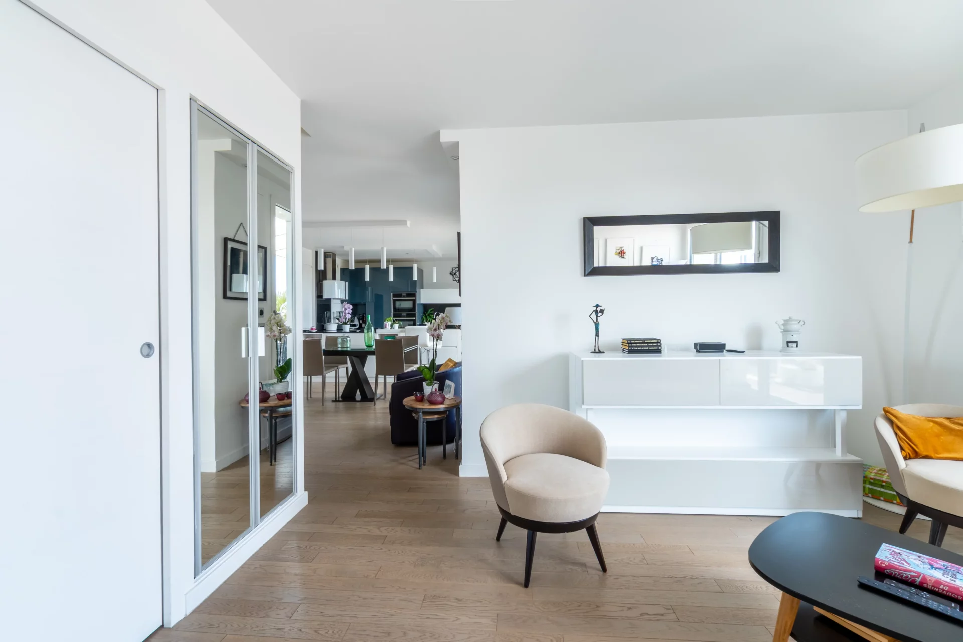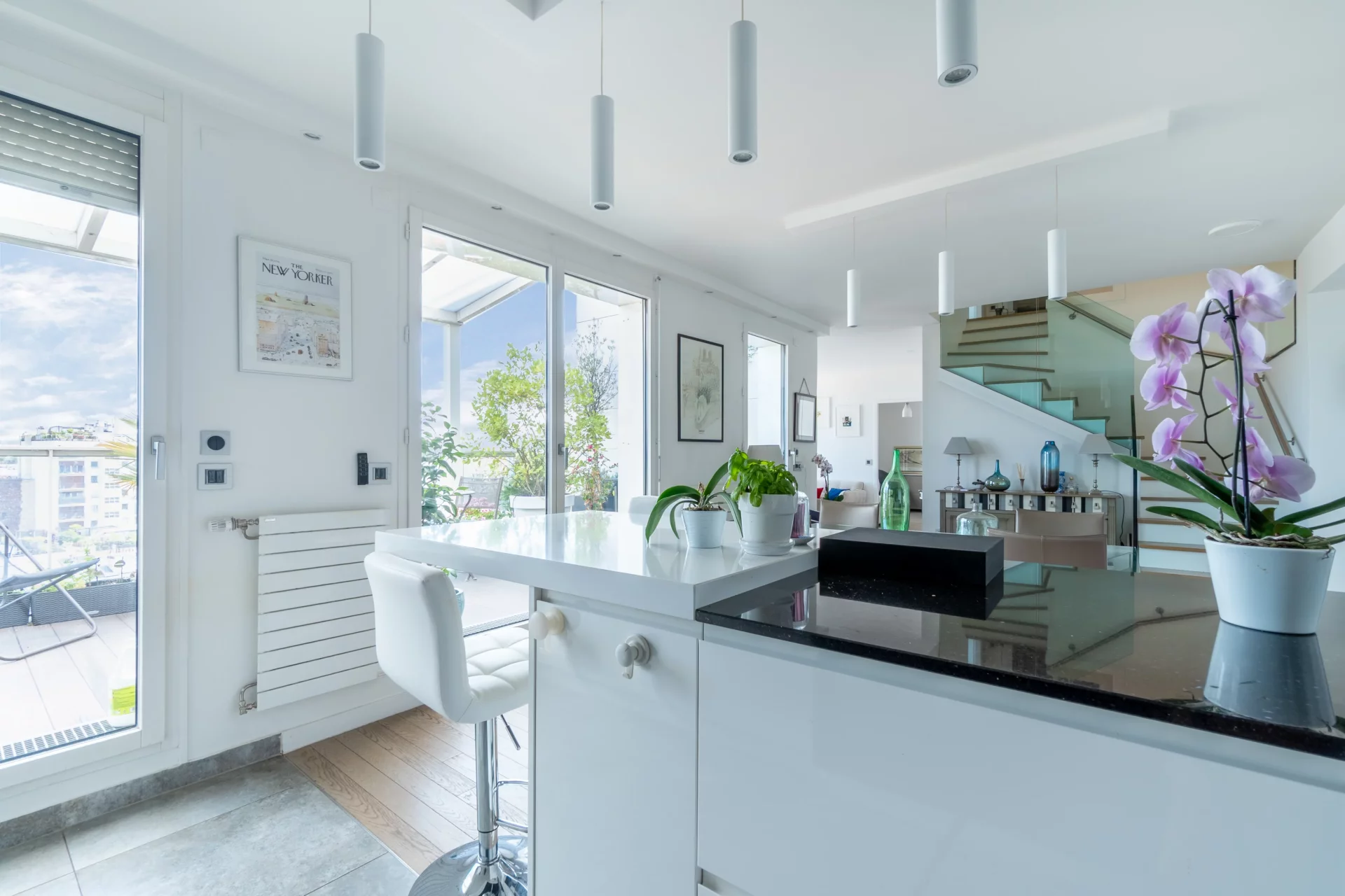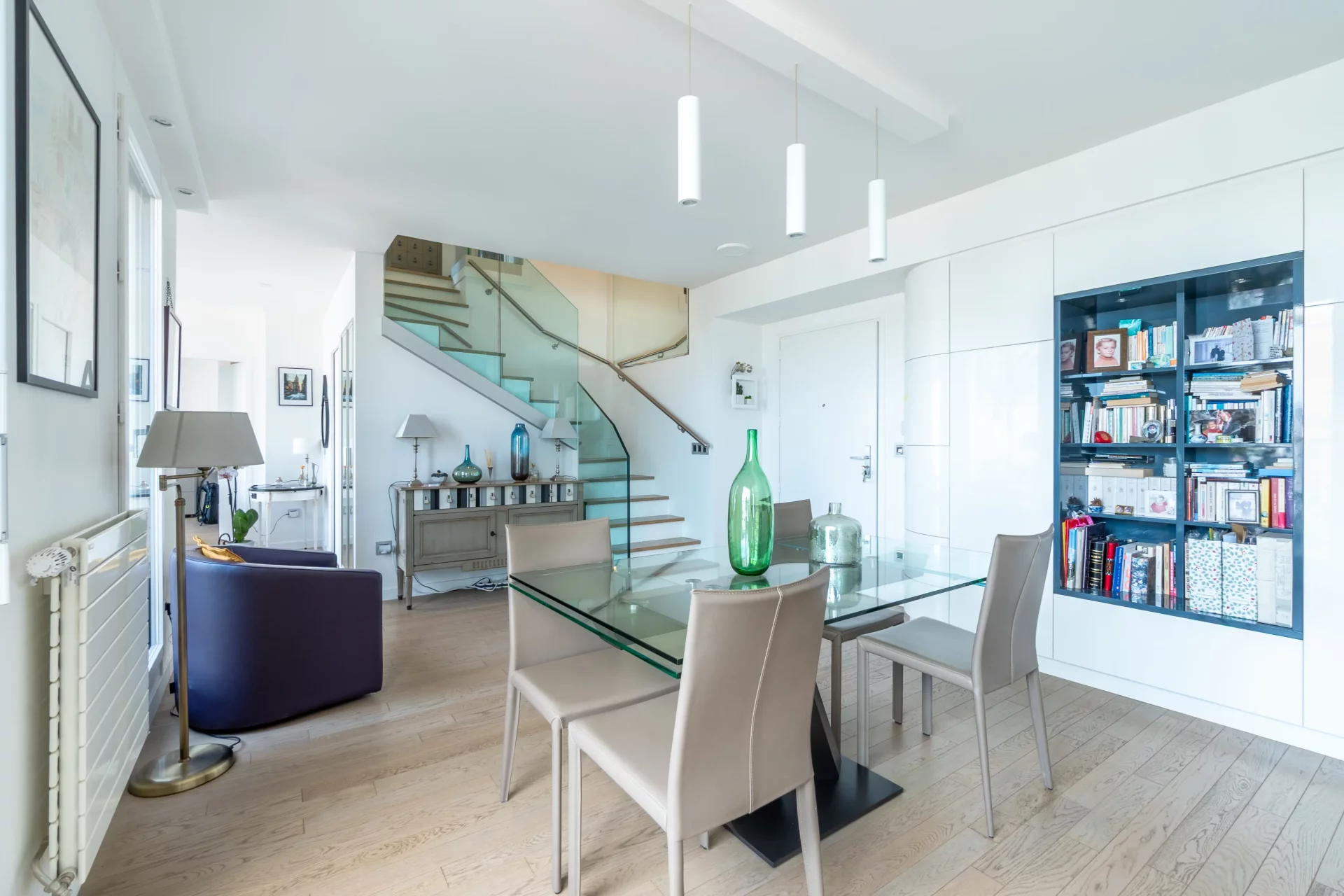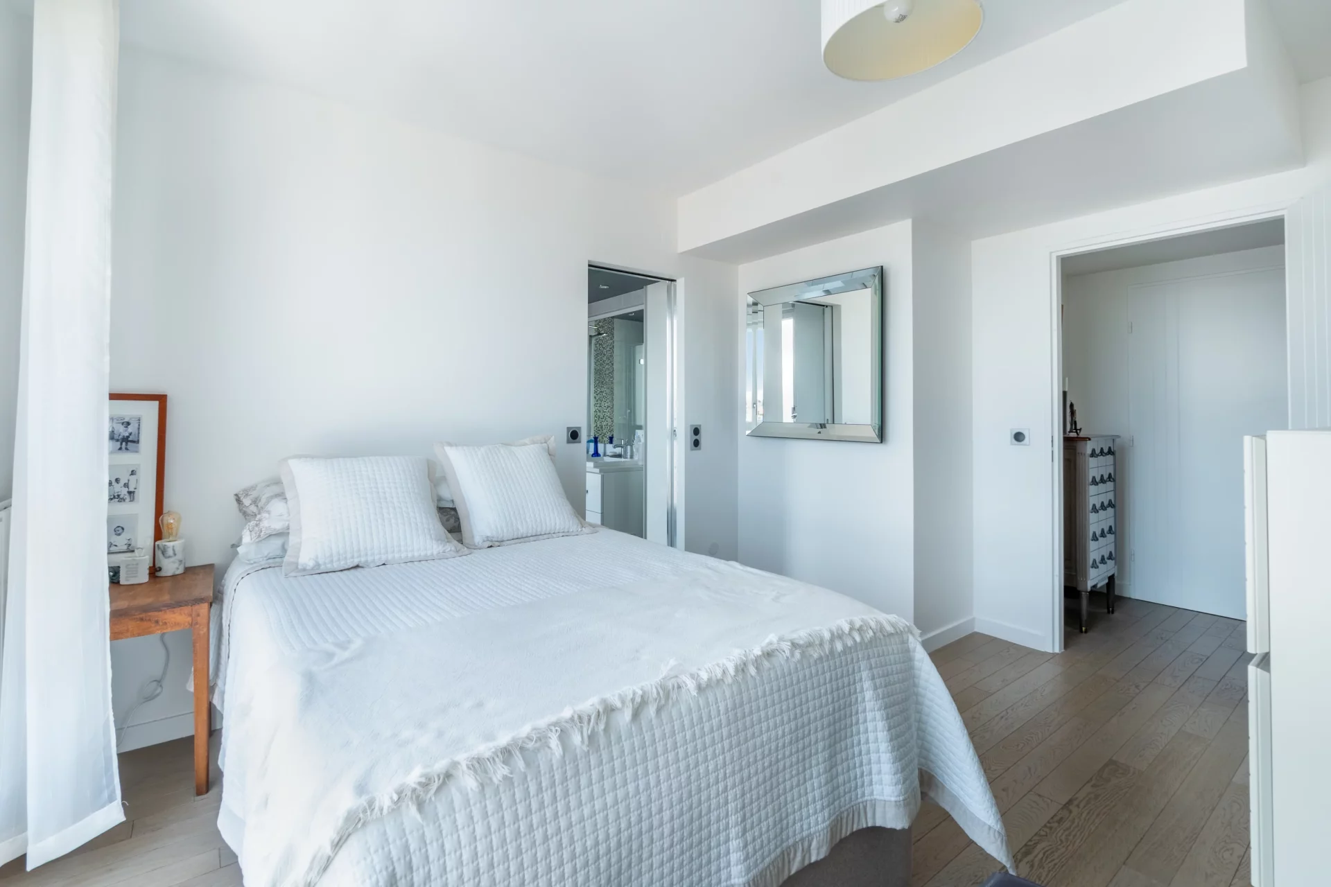 Au 8e étage, accessible par un élégant escalier intérieur, se trouve une suite parentale avec salle de bains et dressing. L’ensemble est en parfait état et bénéficie d’une belle luminosité. Un double parking est disponible en supplément.
