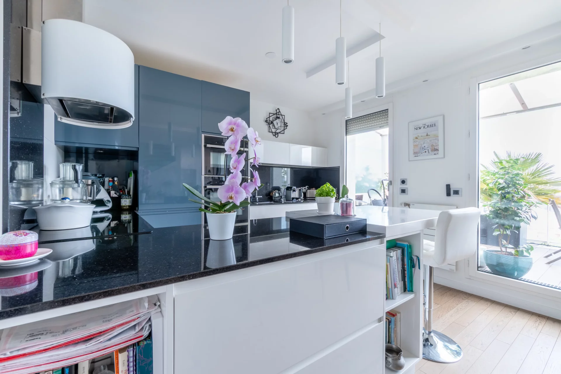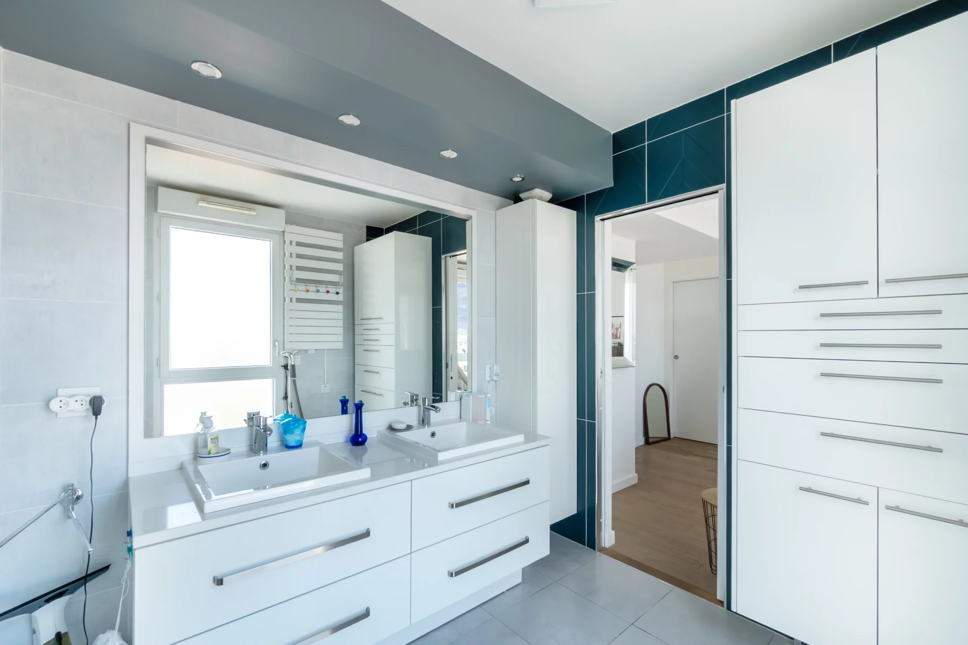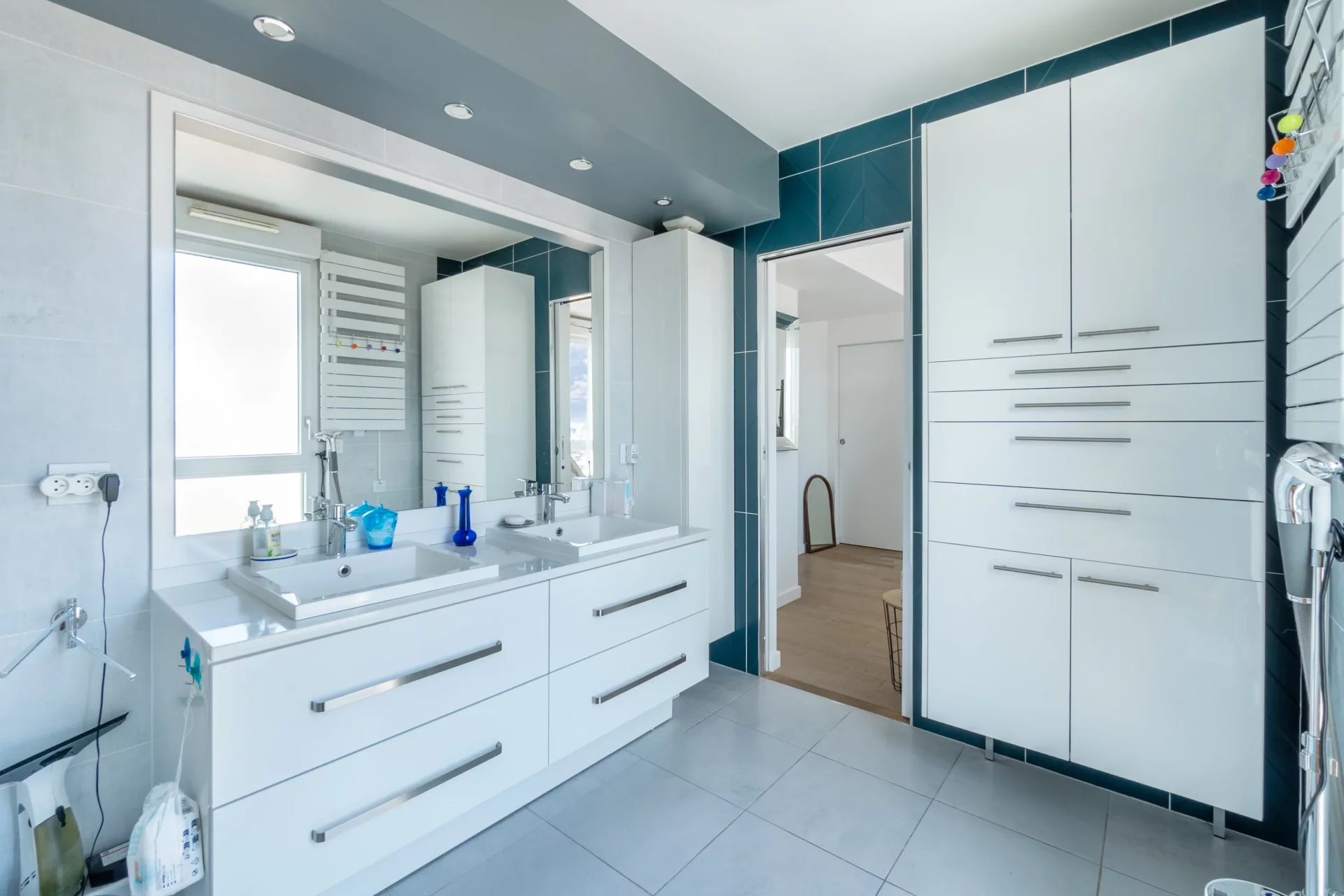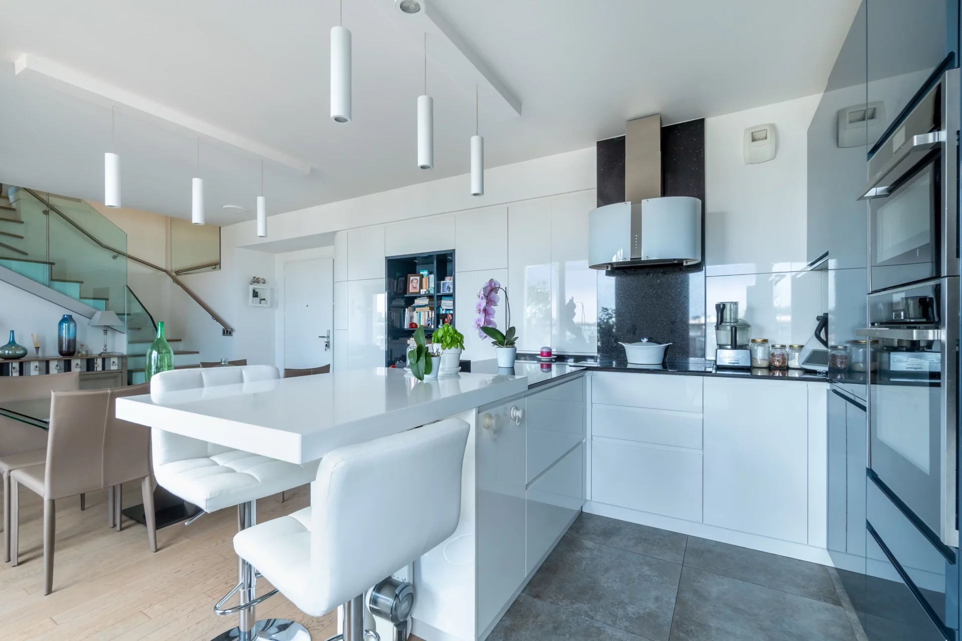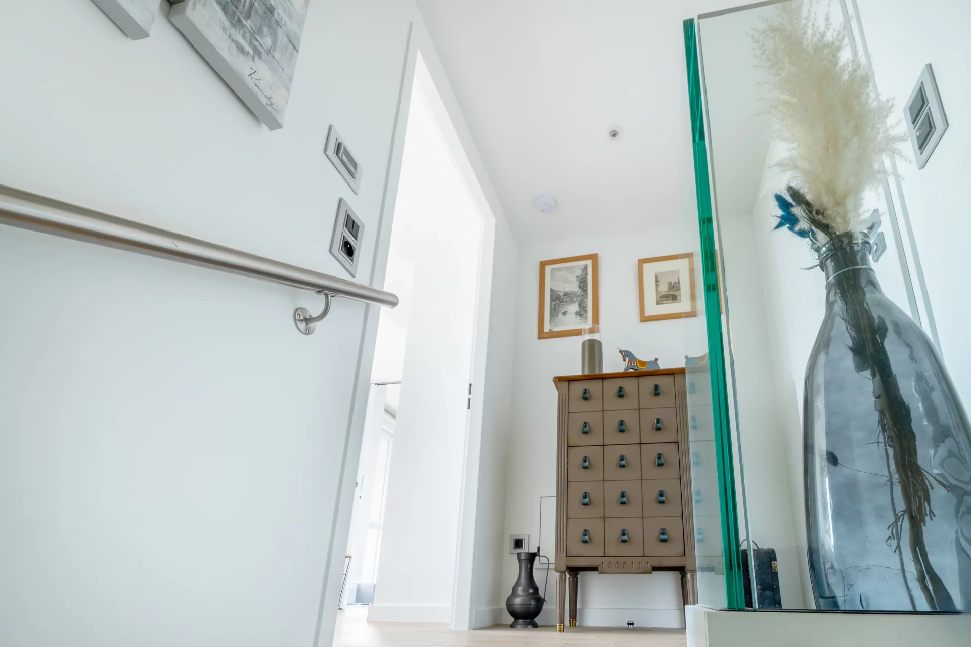 Au 8e étage, accessible par un élégant escalier intérieur, se trouve une suite parentale avec salle de bains et dressing. L’ensemble est en parfait état et bénéficie d’une belle luminosité. Un double parking est disponible en supplément.