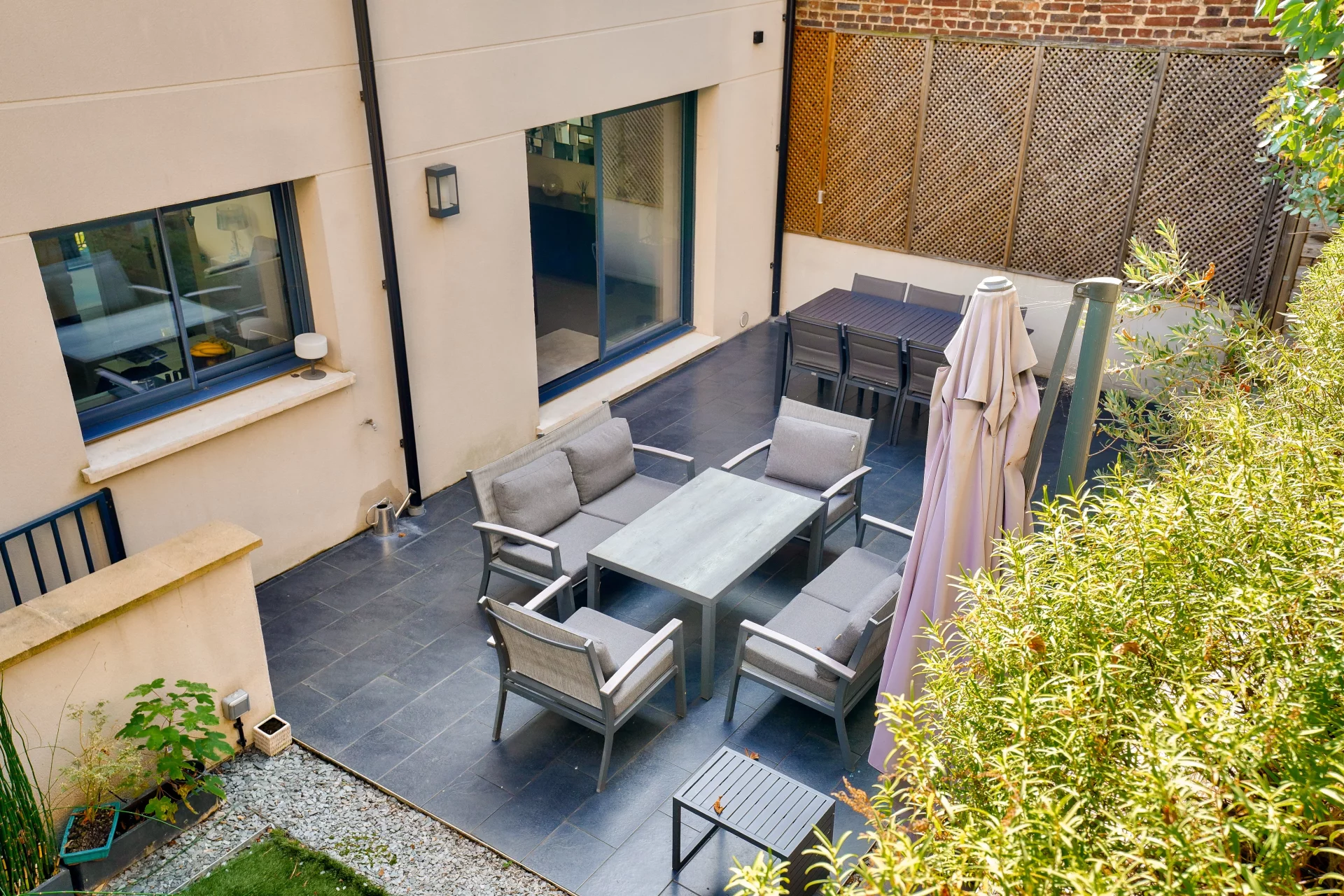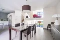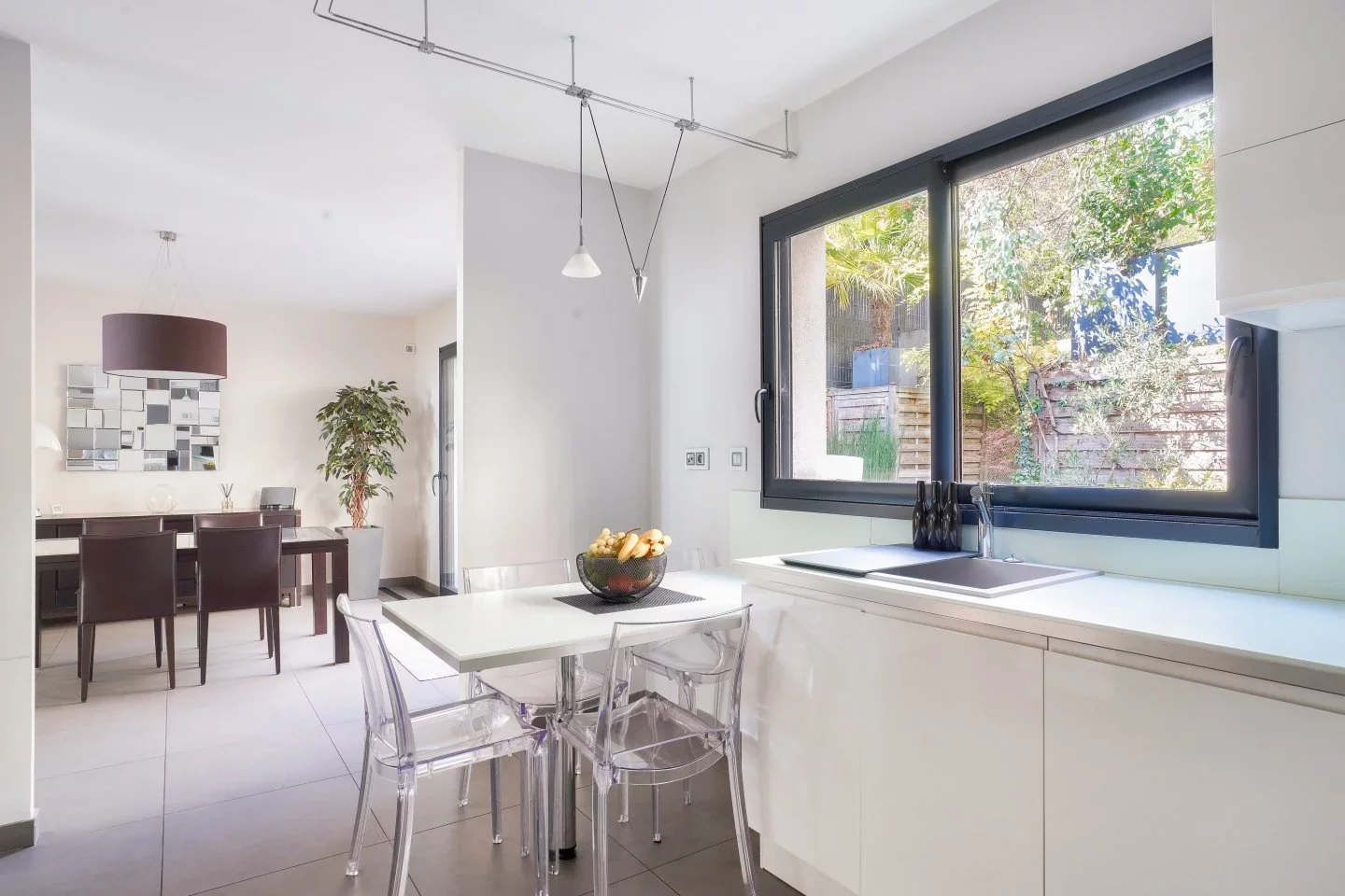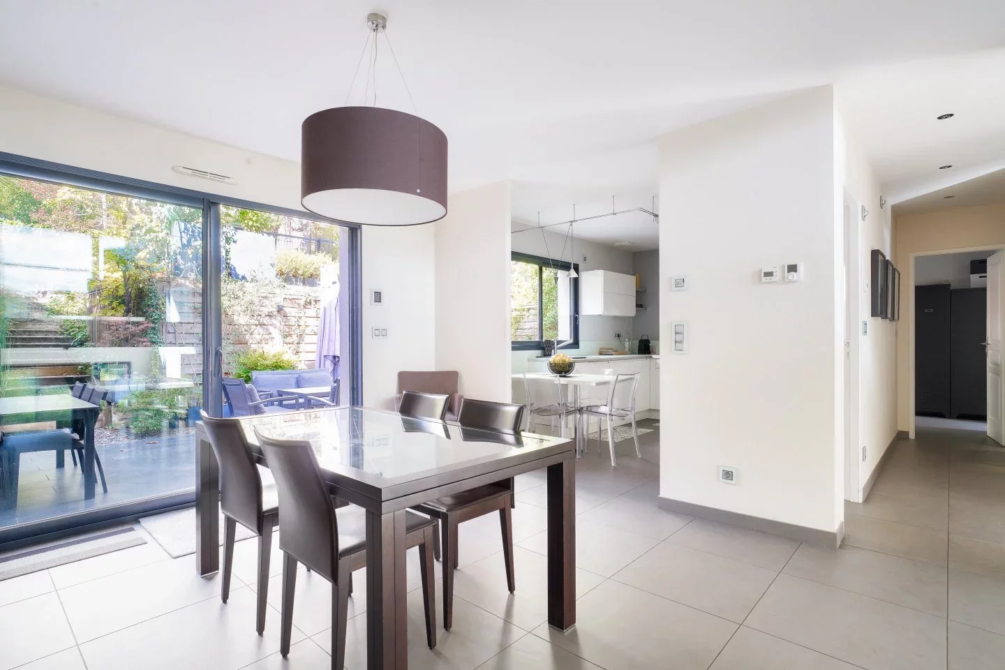 Le cœur de la maison s’articule autour d’un vaste séjour cathédrale de près de 5 mètres sous plafond, baigné de lumière grâce à ses hautes baies vitrées. Quelques marches mènent à l’espace dinatoire et à la cuisine semi-ouverte, conviviale et fonctionnelle, qui s’ouvre directement sur une terrasse intimiste, entourée de verdure. L’ensemble forme un espace de vie de plus de 70 m², idéal pour recevoir.