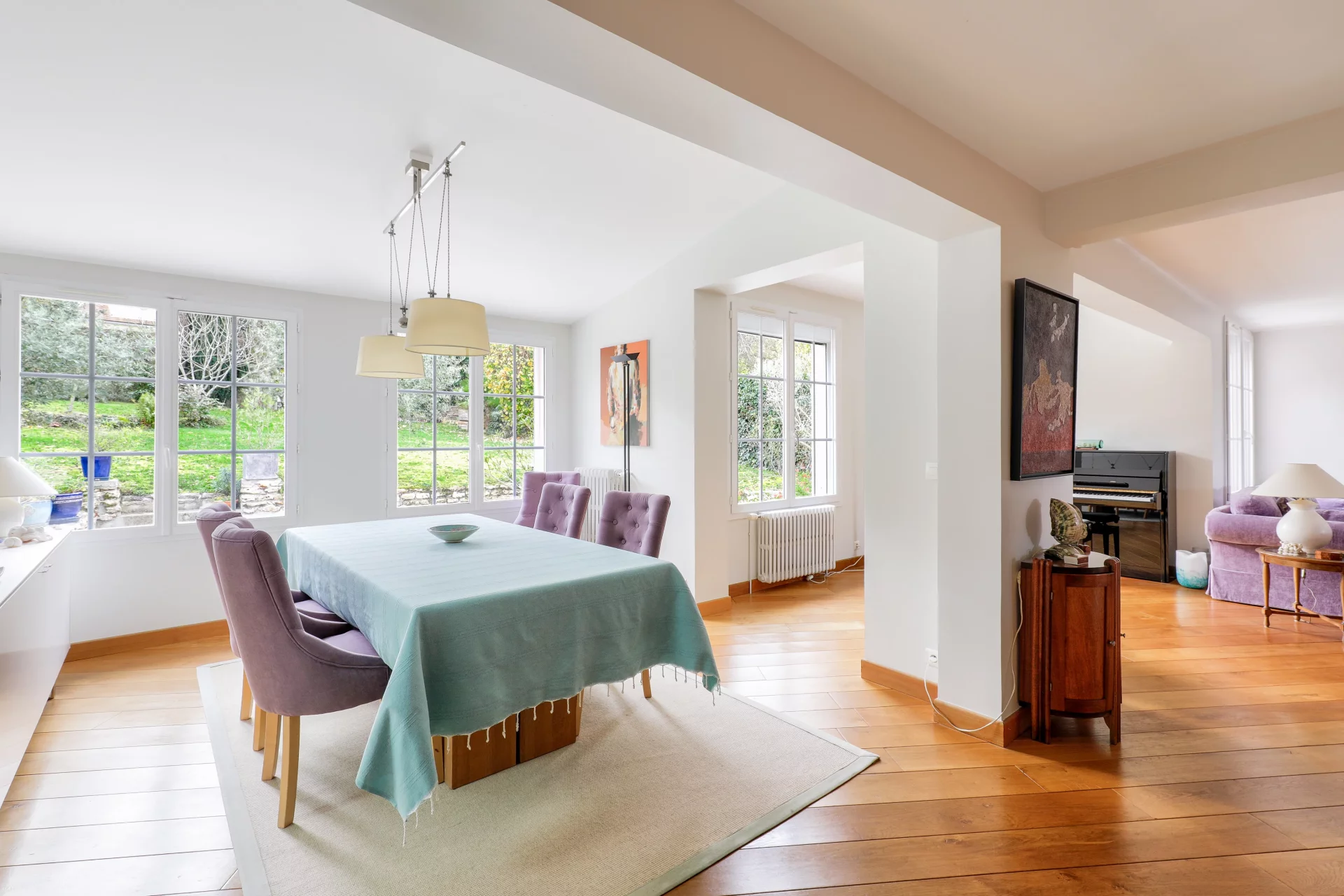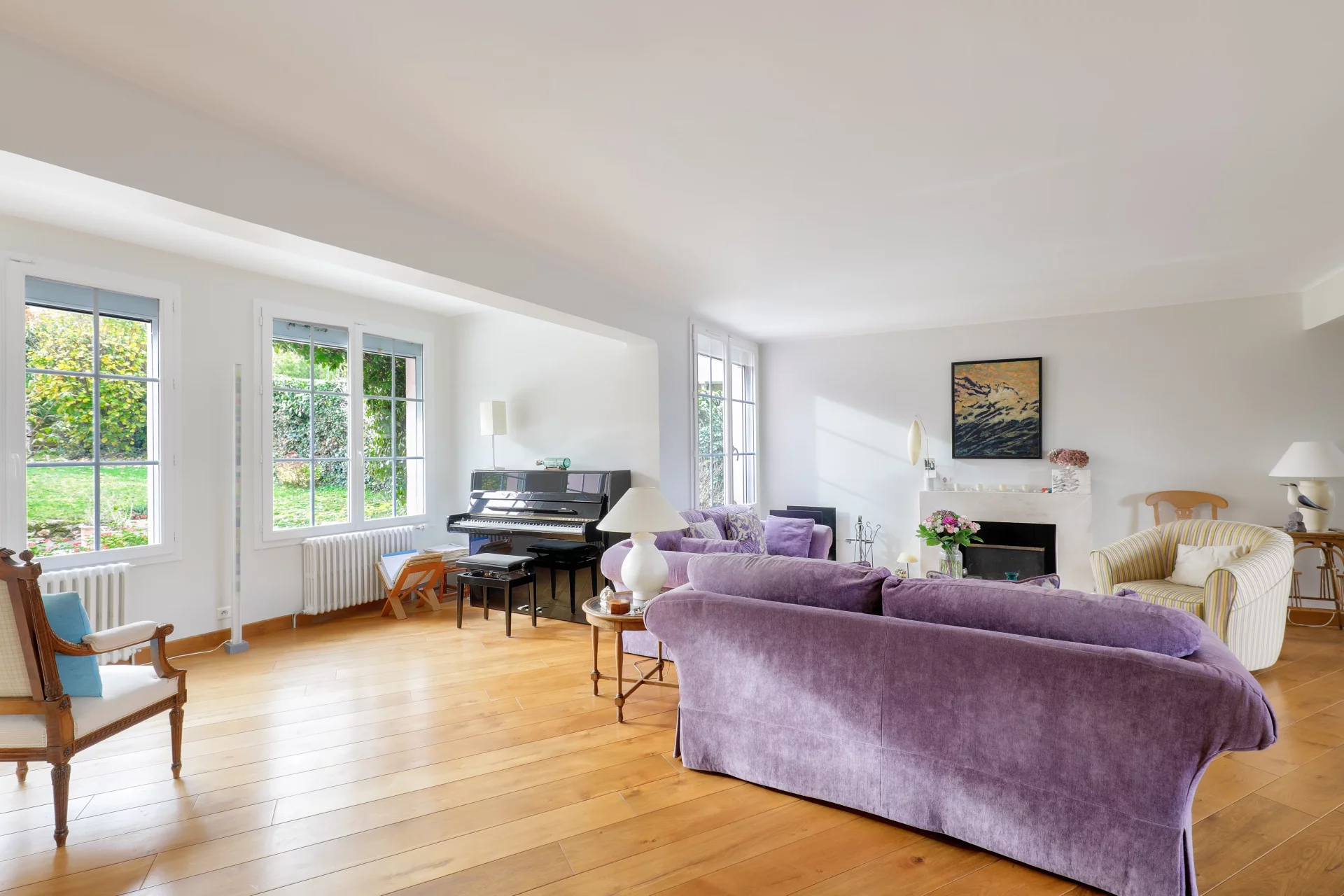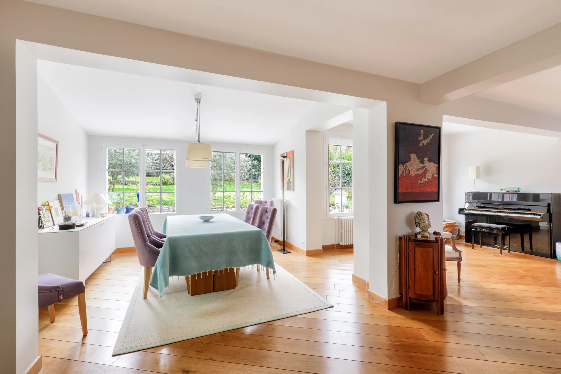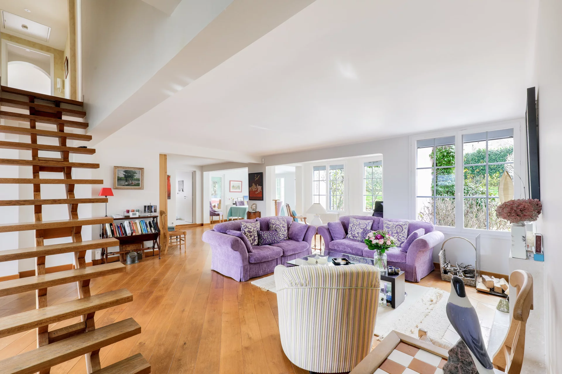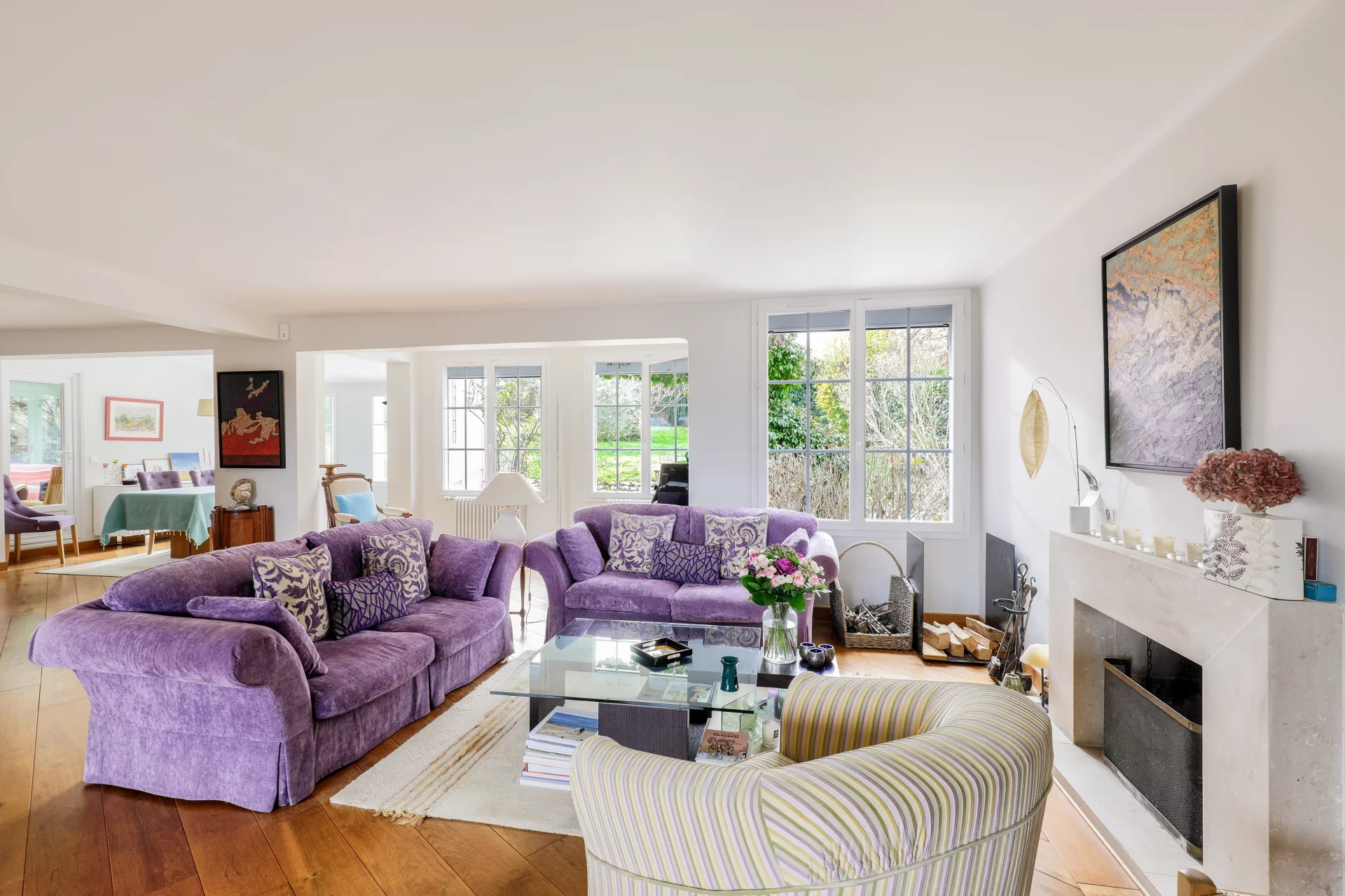 L'entrée de 10m² ouvre sur une lumineuse et chaleureuse triple réception de 78m² avec cheminée, majoritairement exposée Sud, prolongée d'une véranda ou jardin d'hiver chauffé de 35m², de plain pied sur la terrasse et le jardin.