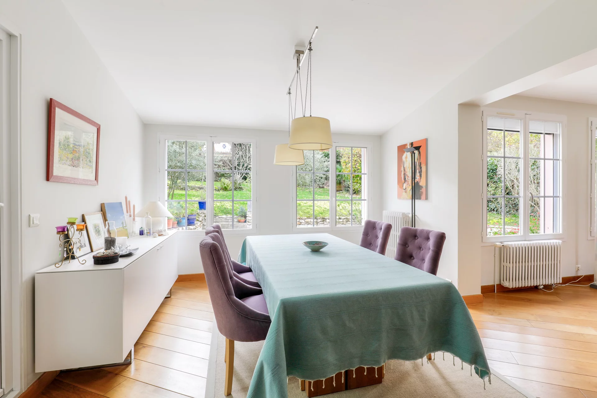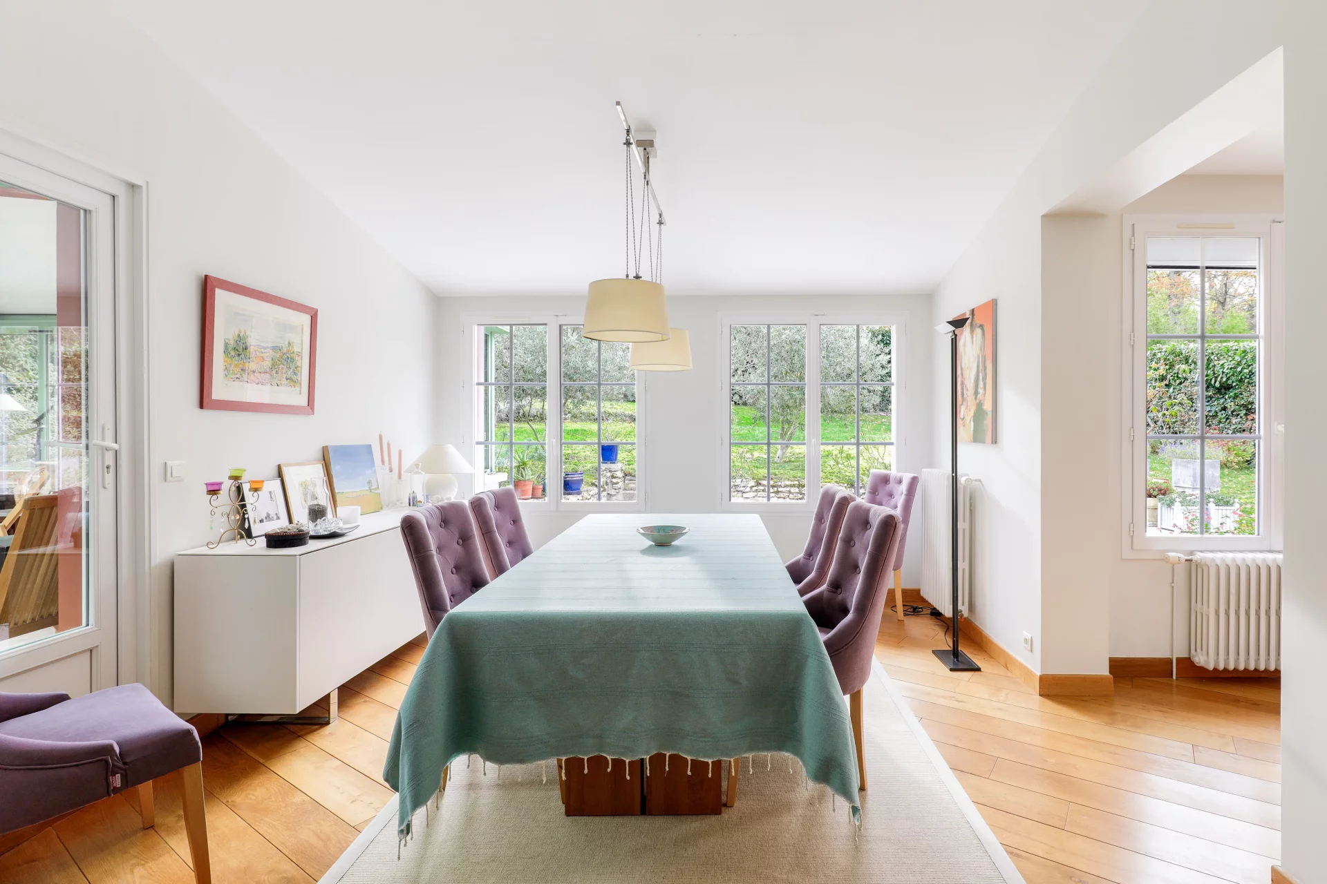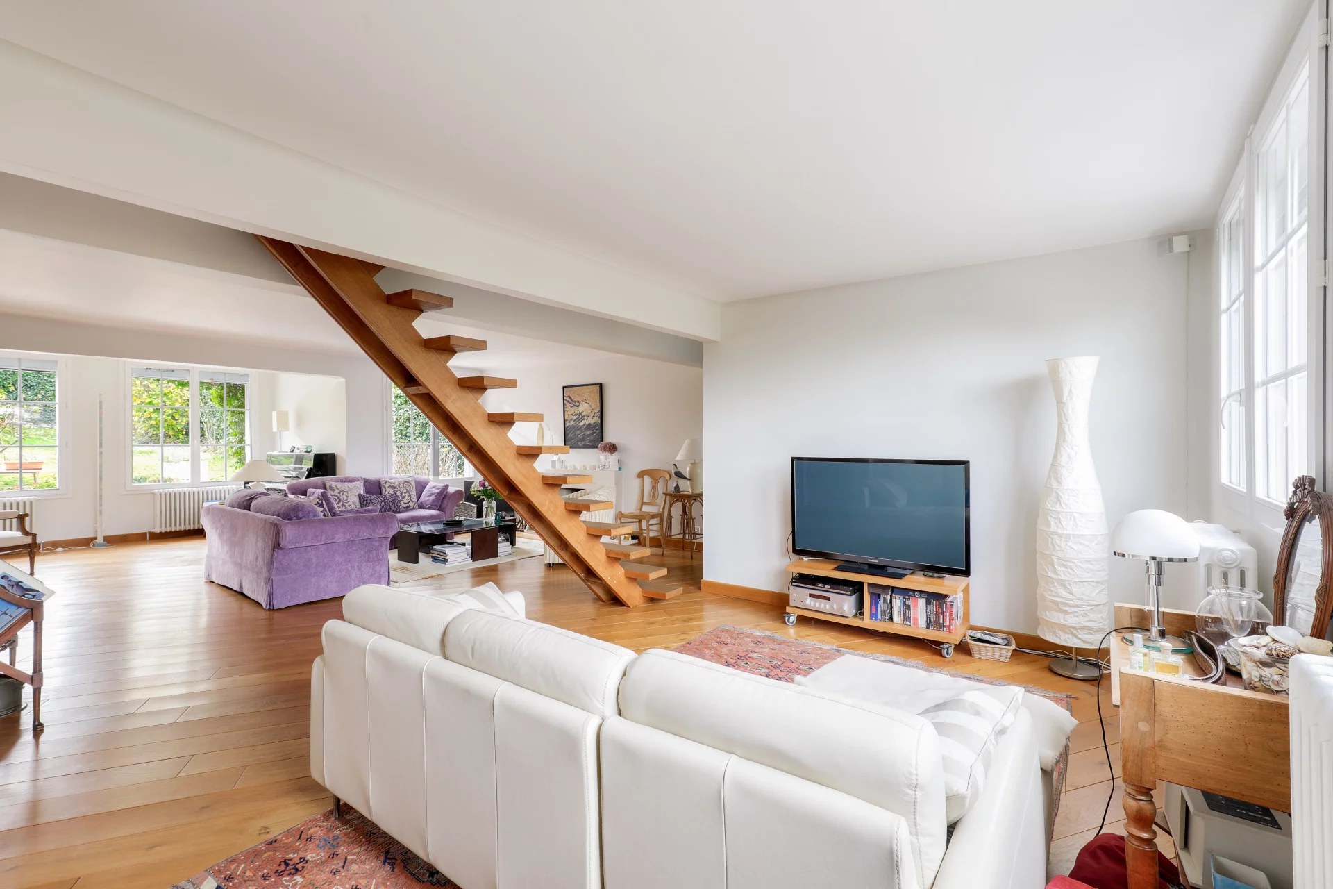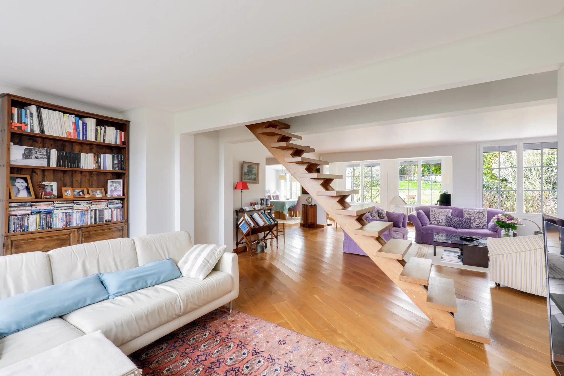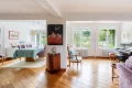 L'entrée de 10m² ouvre sur une lumineuse et chaleureuse triple réception de 78m² avec cheminée, majoritairement exposée Sud, prolongée d'une véranda ou jardin d'hiver chauffé de 35m², de plain pied sur la terrasse et le jardin.