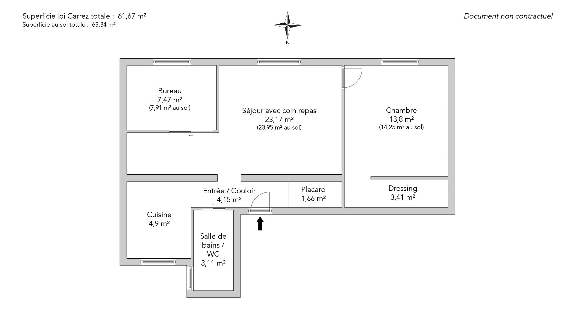 Il se compose d’un séjour baigné de lumière, une cuisine équipée, une grande chambre avec dressing, un bureau pourrait être réaménagé en deuxième chambre, une salle de bains avec toilettes.