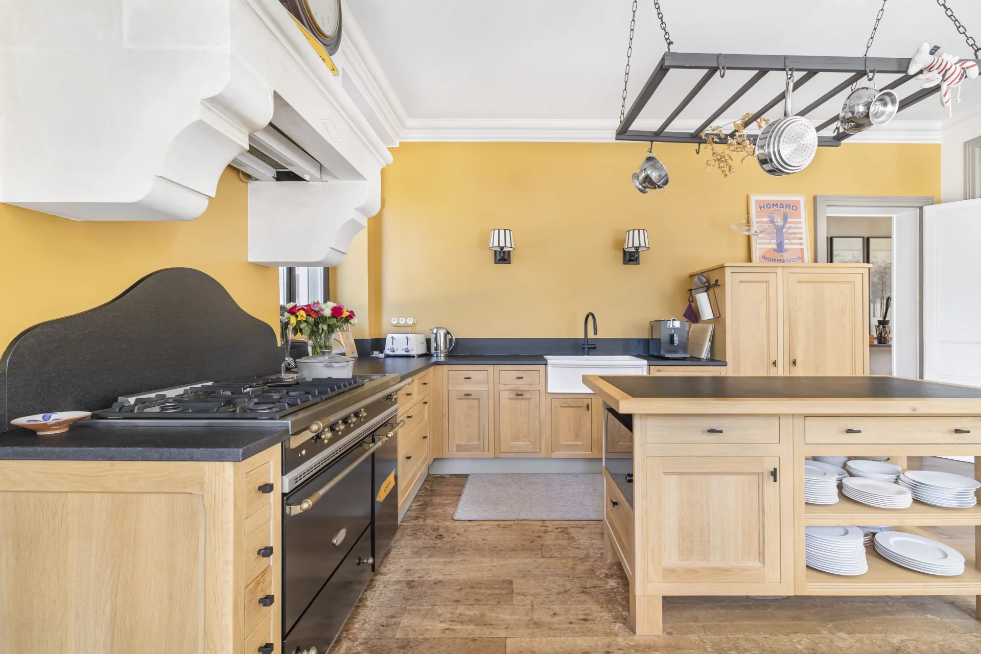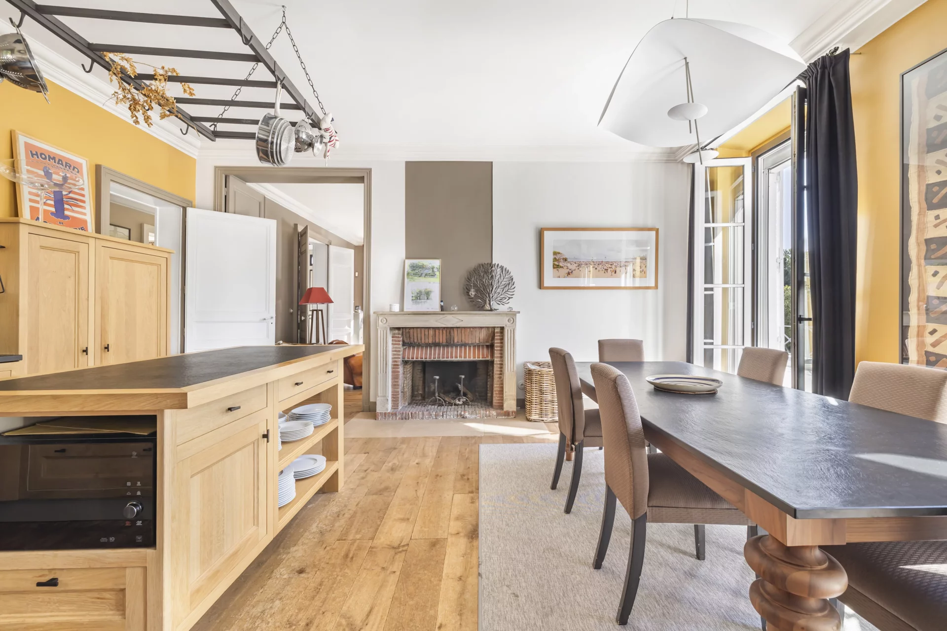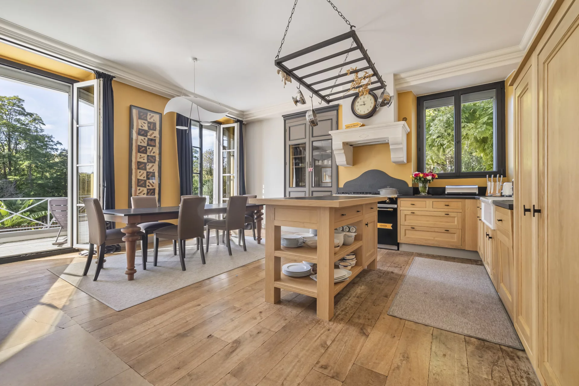 Dès l’entrée, la maison séduit par la fluidité de ses volumes et la douceur de ses atmosphères. La cuisine, dessinée sur mesure en bois clair et pierre naturelle, s’inscrit dans une tonalité apaisante, à la fois contemporaine et intemporelle. La salle à manger attenante prolonge la lumière vers le salon, où les matériaux nobles – parquet ancien, menuiseries fines, teintes minérales – composent un décor sobre et élégant. À