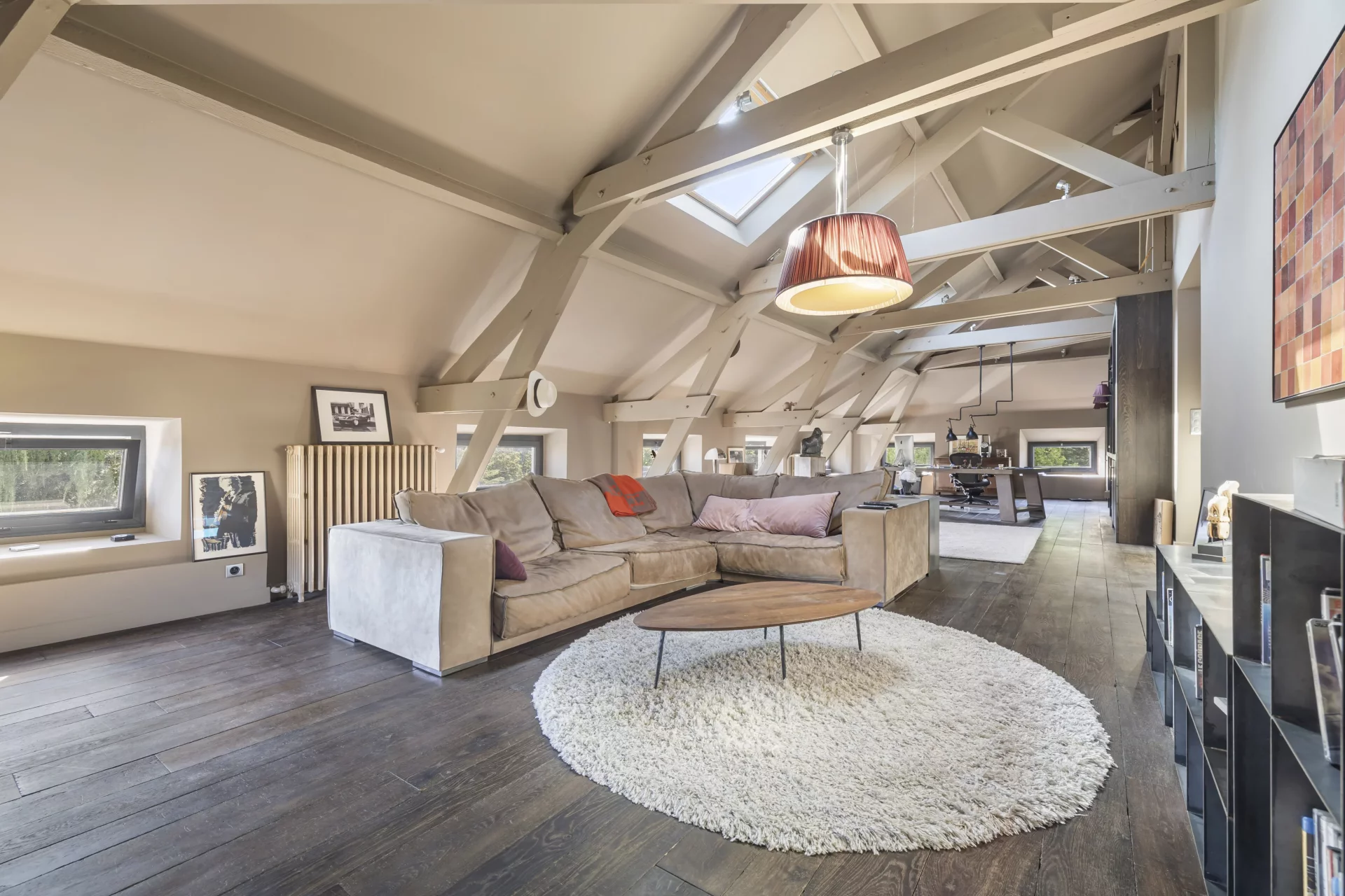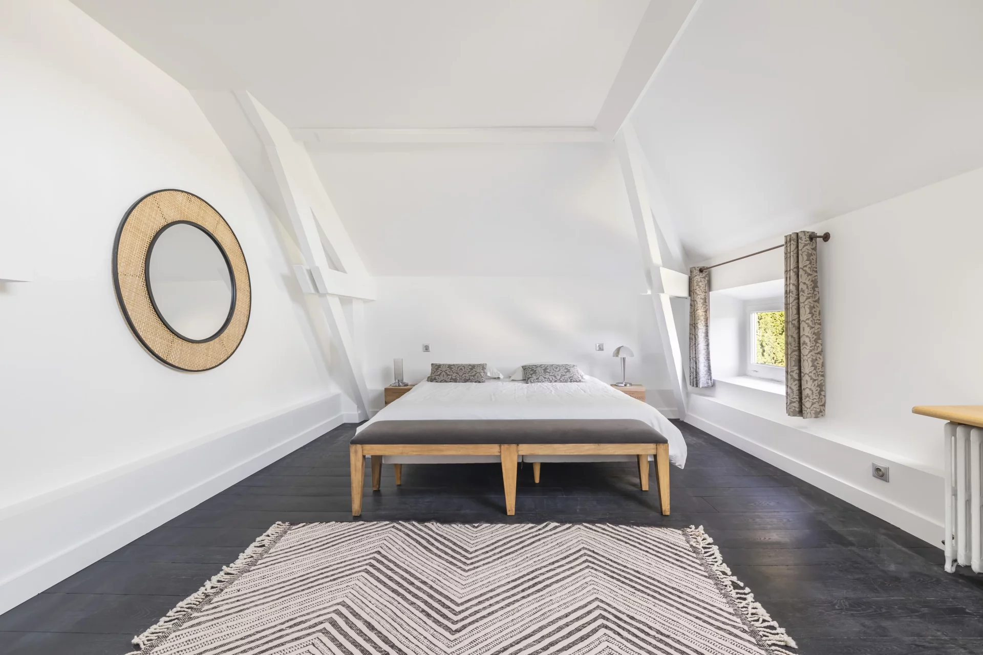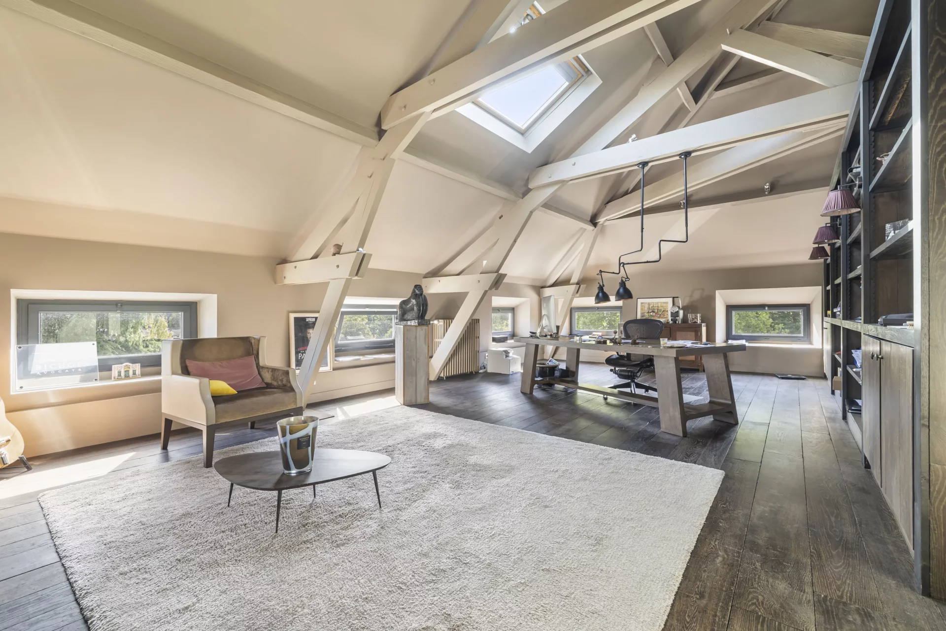 Sous les combles, un vaste bureau, un dressing et une chambre supplémentaire composent un étage d’une belle intimité, idéal pour travailler ou se retirer.