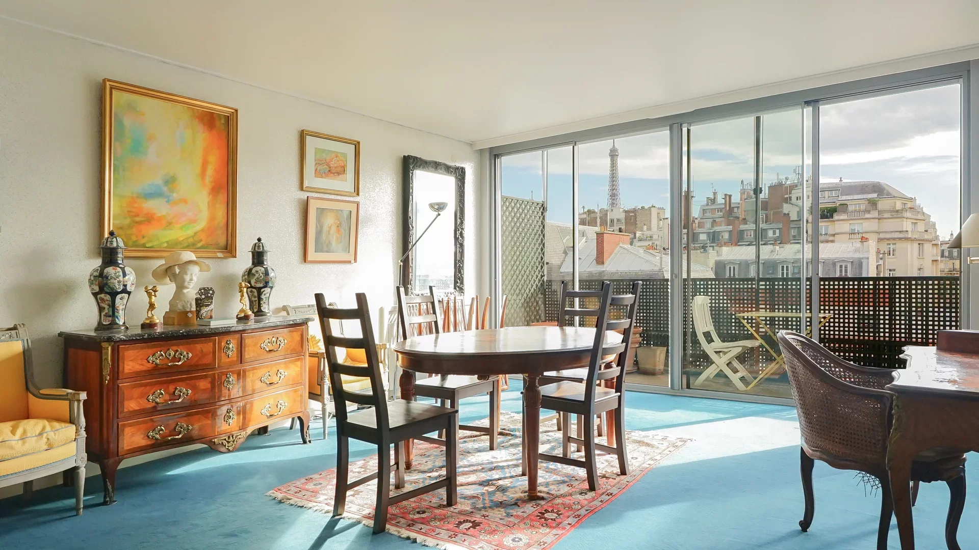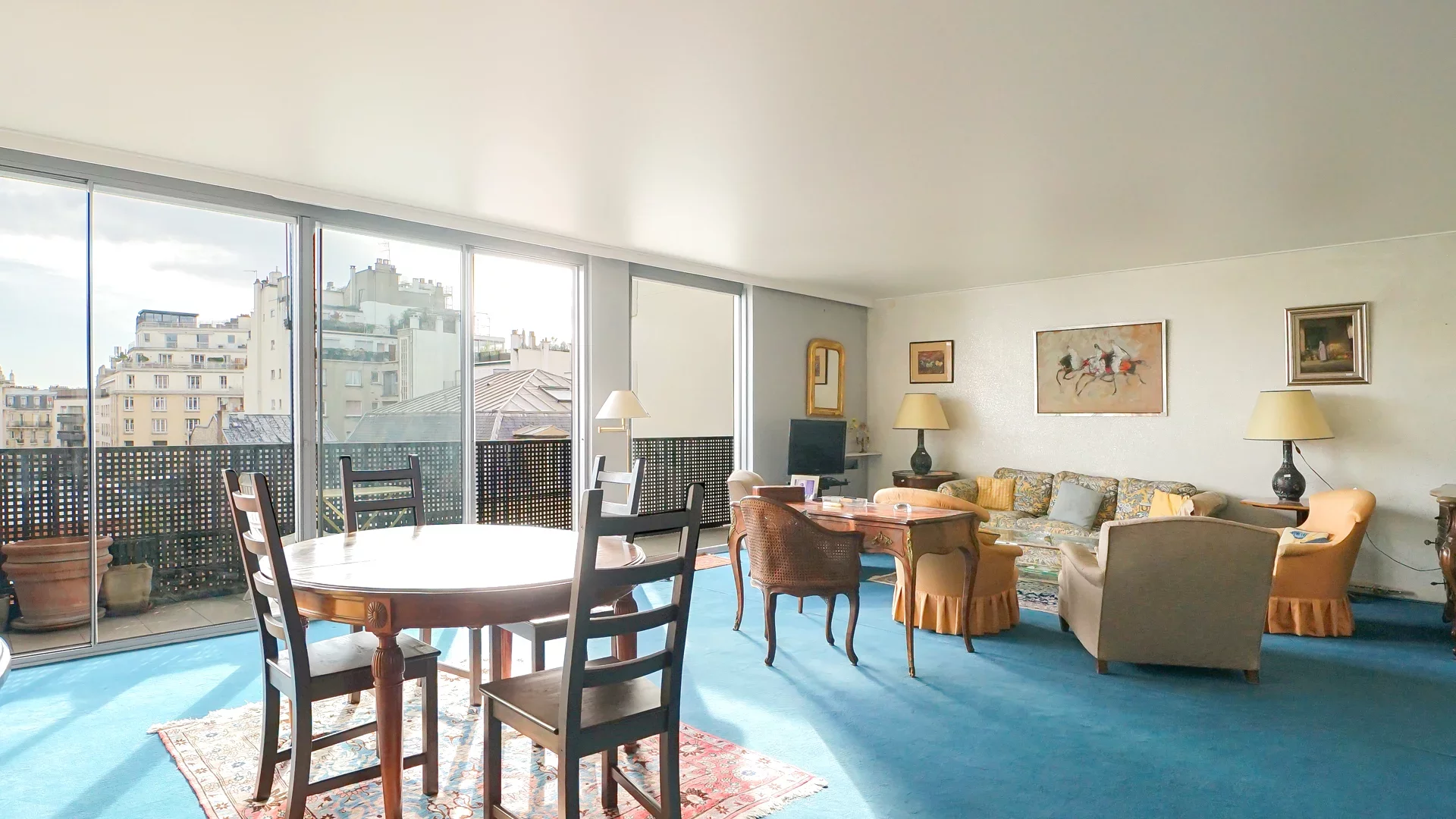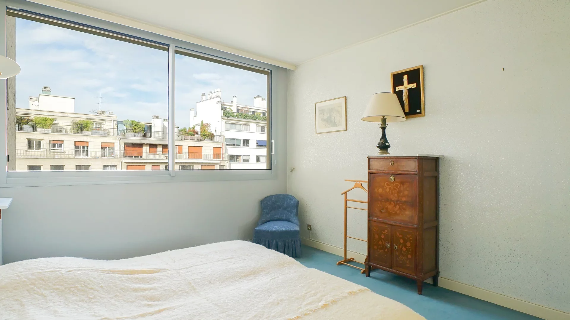 Idéalement situé dans une élégante rue du quartier Passy, c'est au 5ème par ascenseur d'une copropriété semi-récente très bien entretenue que se trouve cet appartement traversant de 98,72m² Carrez. Il comprend, côté Est, un grand séjour de près de 40m², baigné de soleil et longé d'un large balcon avec vue ciel et Tour Eiffel. A l'Ouest se trouvent la cuisine et l'office ainsi que la chambre. La salle de bains est assez grande pour installer douche et baignoire. Les toilettes sont indépendantes. L'appartement est à rénover. Il est facilement possible de créer une deuxième chambre, comme dans son plan d'origine. Une cave complète cette offre. Un parking est proposé en supplément à 60 000€.
