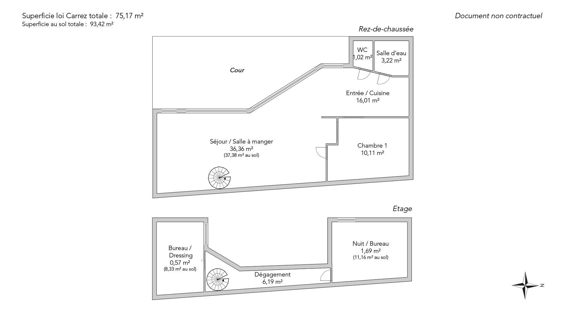 Ce bien très lumineux et bénéficiant d'une belle hauteur sous plafond d'environ 5 mètres est composé d'une entrée, d'une cuisine ouverte face à la terrasse, d'un séjour-salle à manger, d'une chambre et d'un bureau accessible par mezzanine, d'un espace bureau ou dressing, d'une salle de douche et de toilettes séparées.
